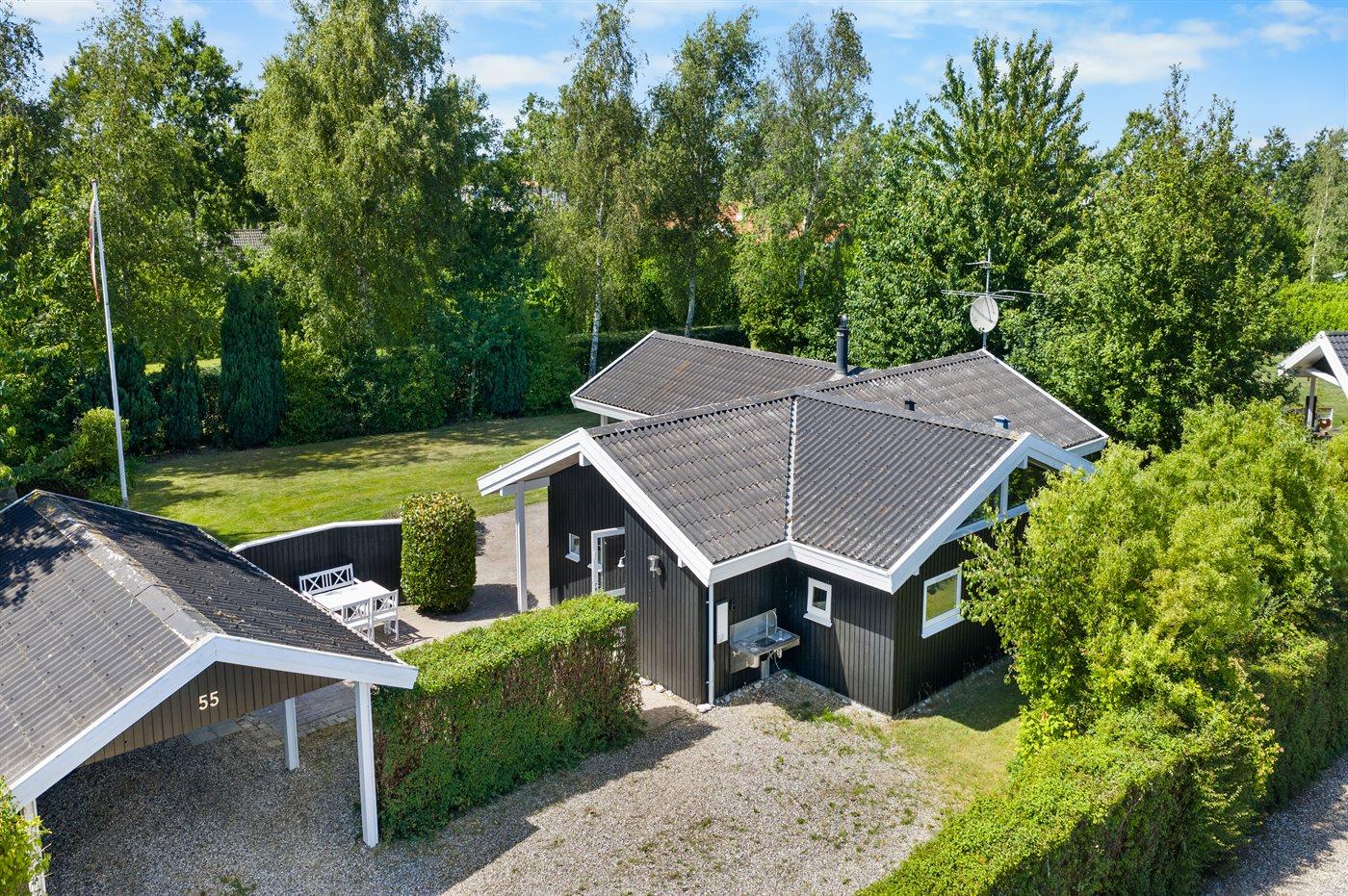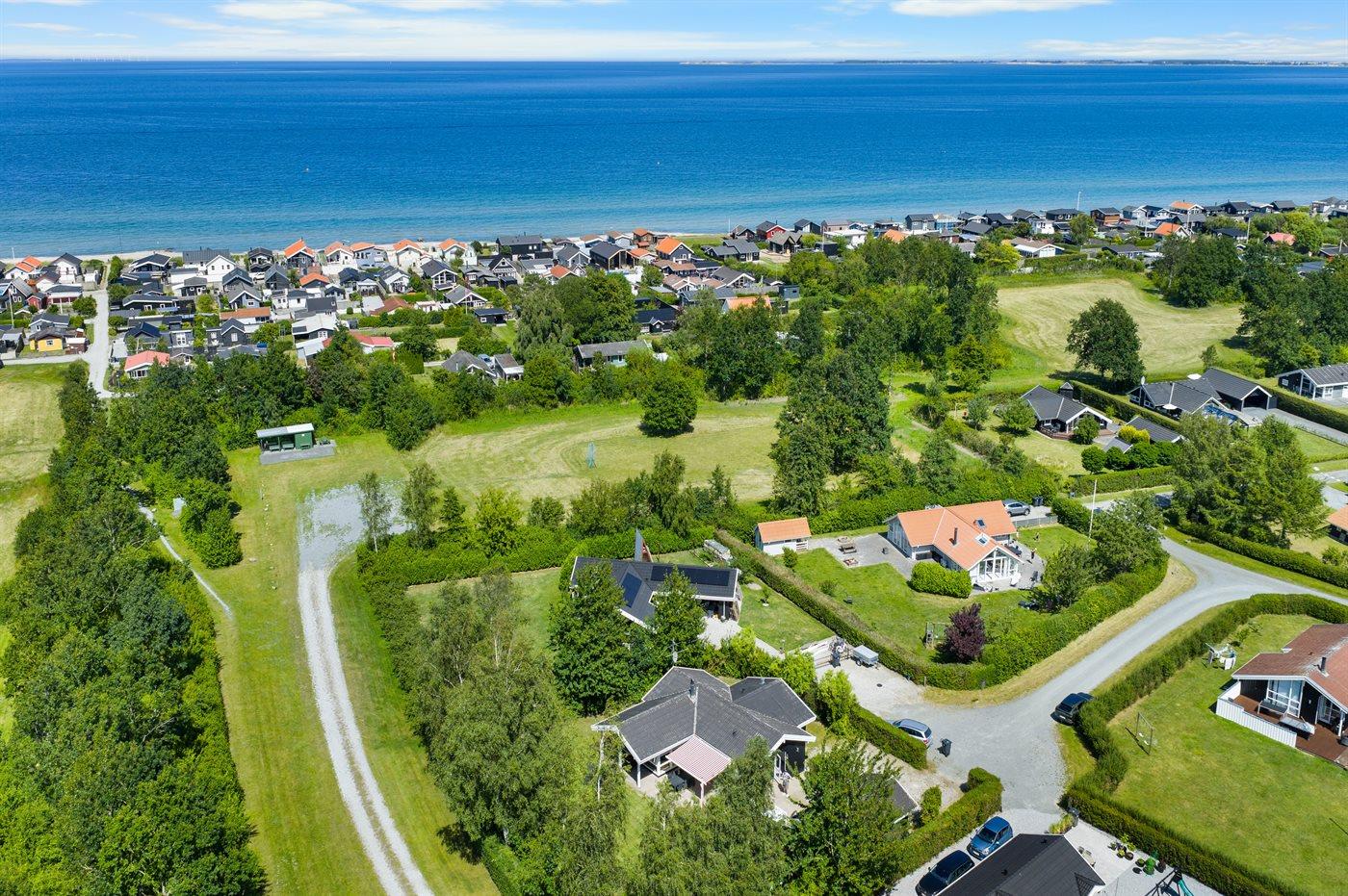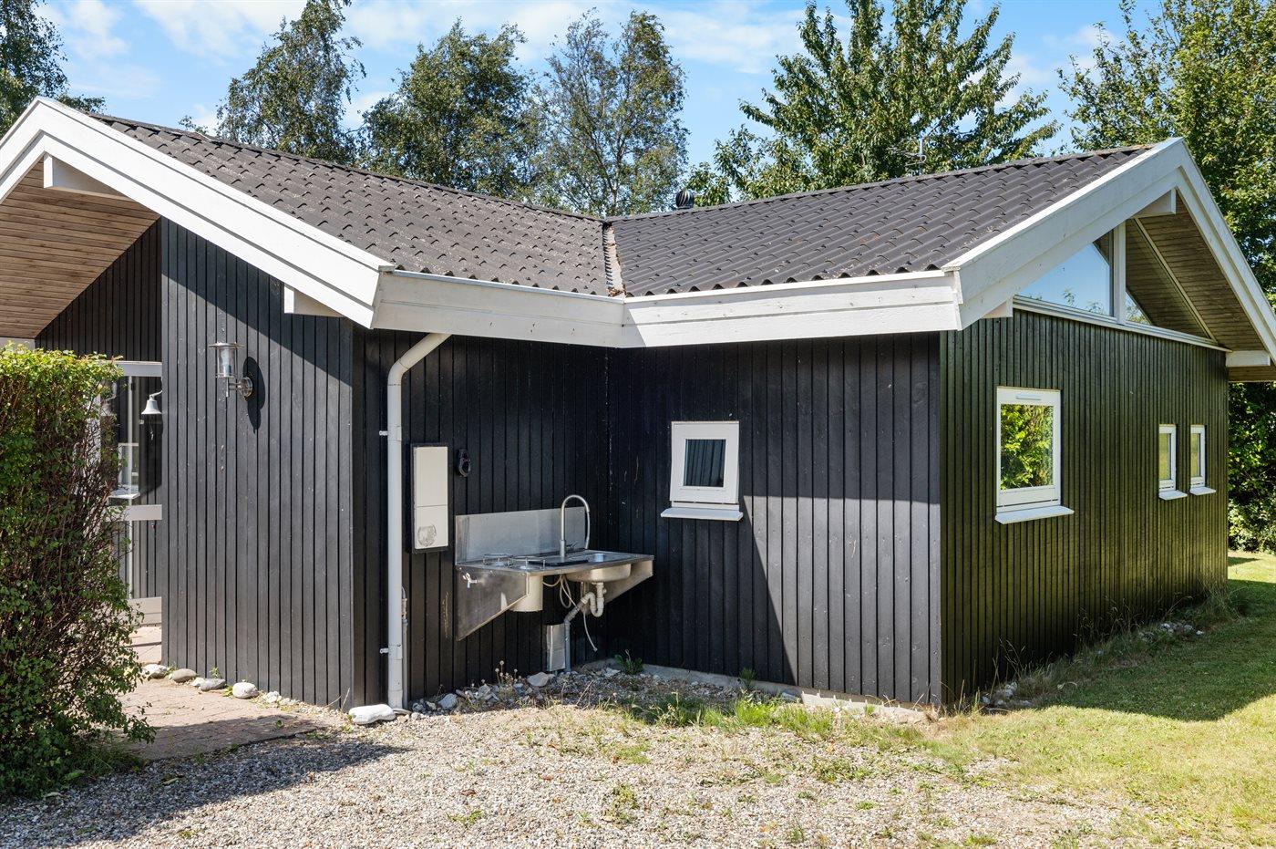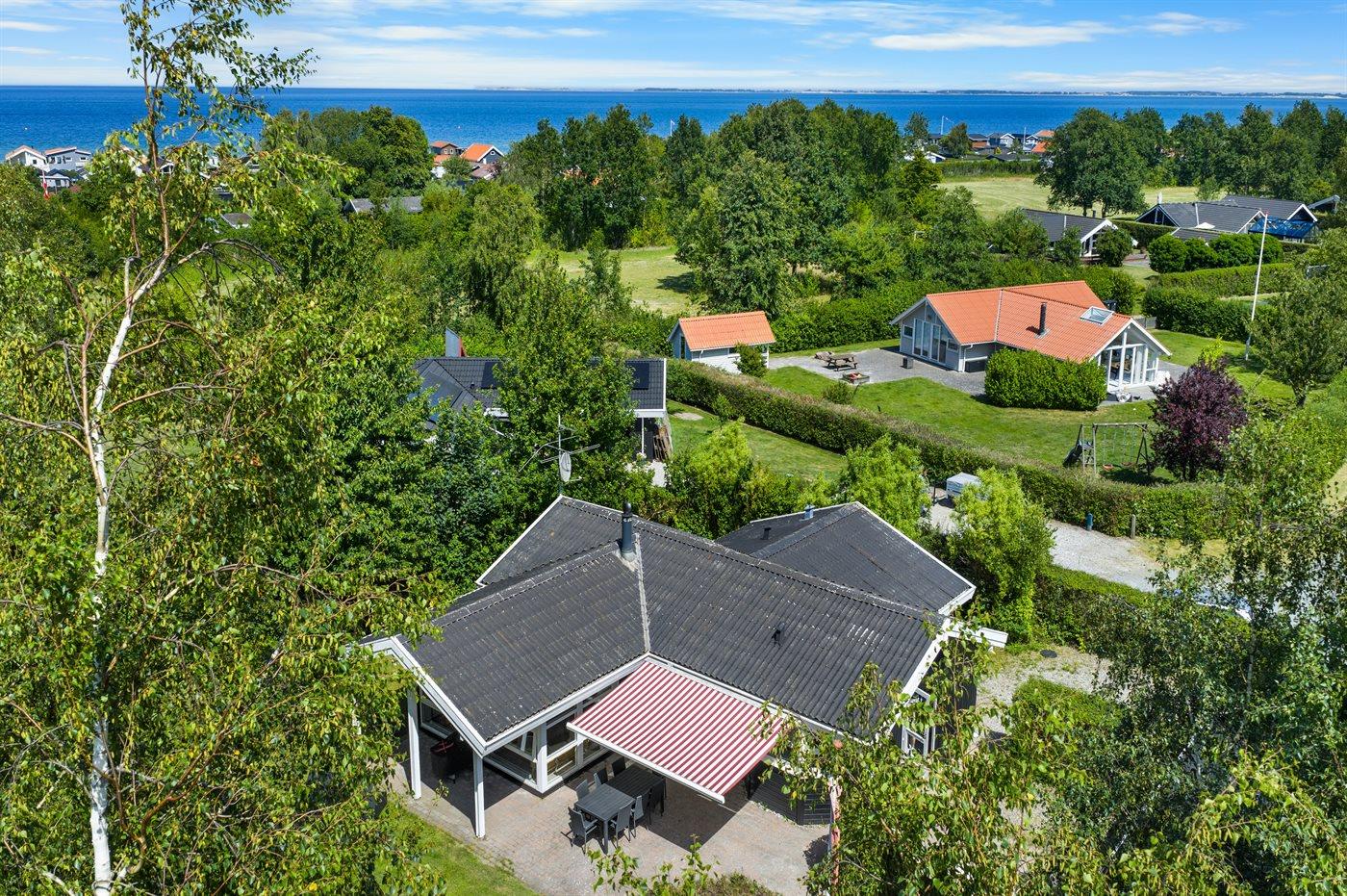 Ferieboligen er beliggende på en 1050 m² stor havegrund. Der er 275 m til havet. Nærmeste forretning er beliggende i en afstand af 5000 m. Til ferieboligen hører åbent terrasseareal. Desuden er der overdækket terrasse. Gynge. Sandkasse. Legetårn. Rutchebane. Bålsted. Grill til rådighed. Udendørs vask. Der er carport til rådighed. Parkering ved ferieboligen.