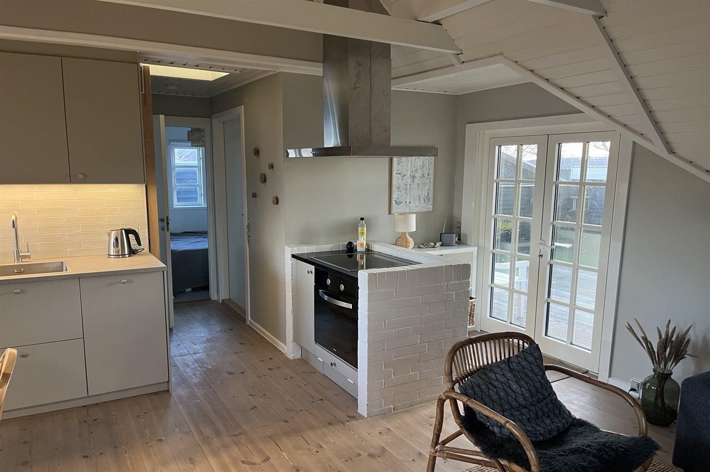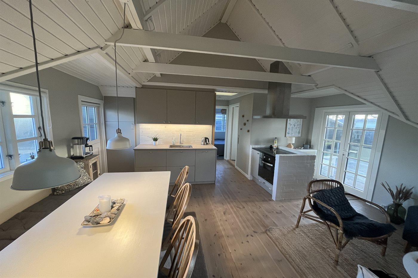 Køkkenet er udstyret med 1 køleskab. Der står 1 ekstra køleskab til rådighed. Der er 4 keramiske kogeplader, varmluftovn samt opvaskemaskine.