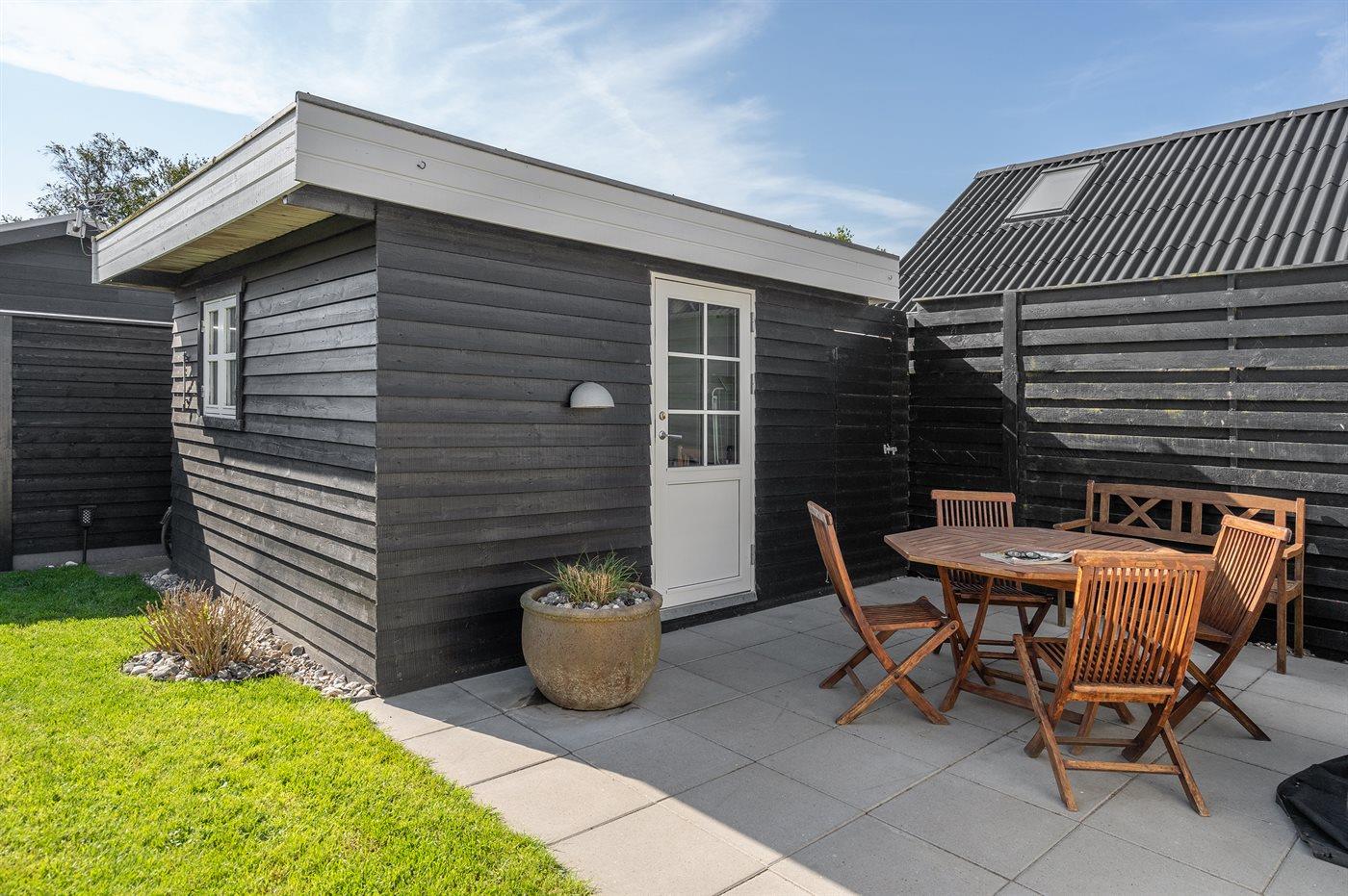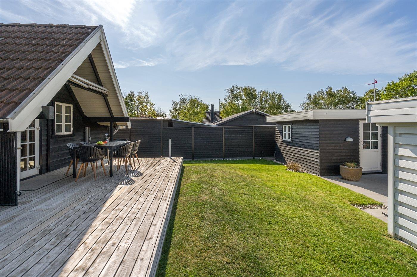 Ferieboligen er beliggende på en 367 m² stor havegrund. Der er 25 m til havet. Nærmeste forretning er beliggende i en afstand af 3700 m. Til ferieboligen hører åbent terrasseareal. Desuden er der overdækket terrasse. Udendørs bruser. Grill til rådighed. Der er carport til rådighed. Parkering ved ferieboligen.