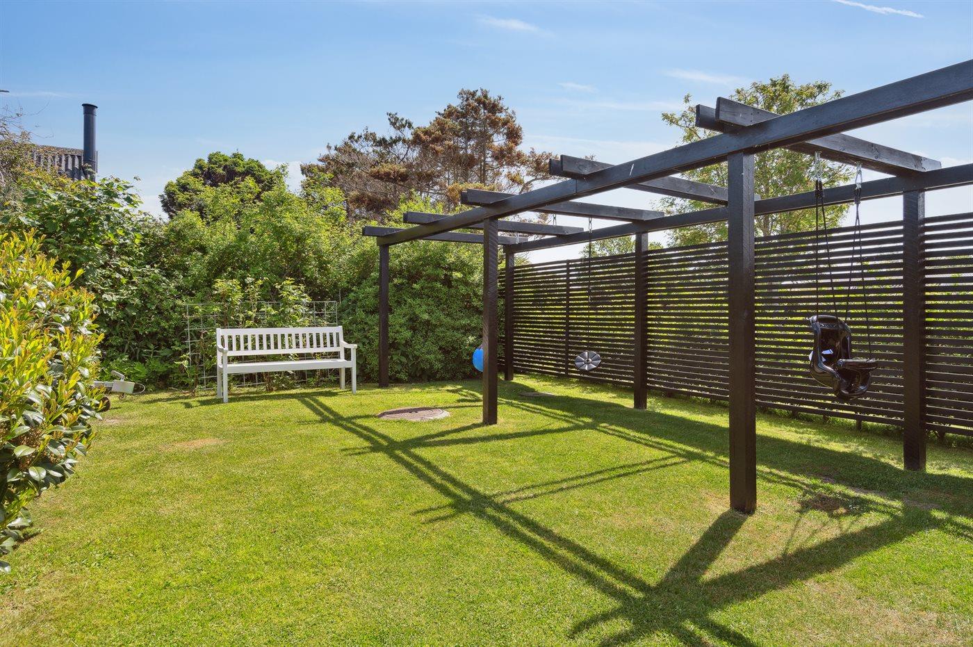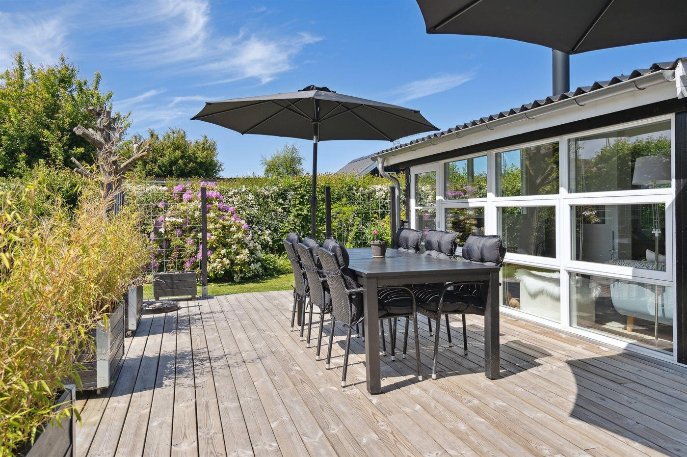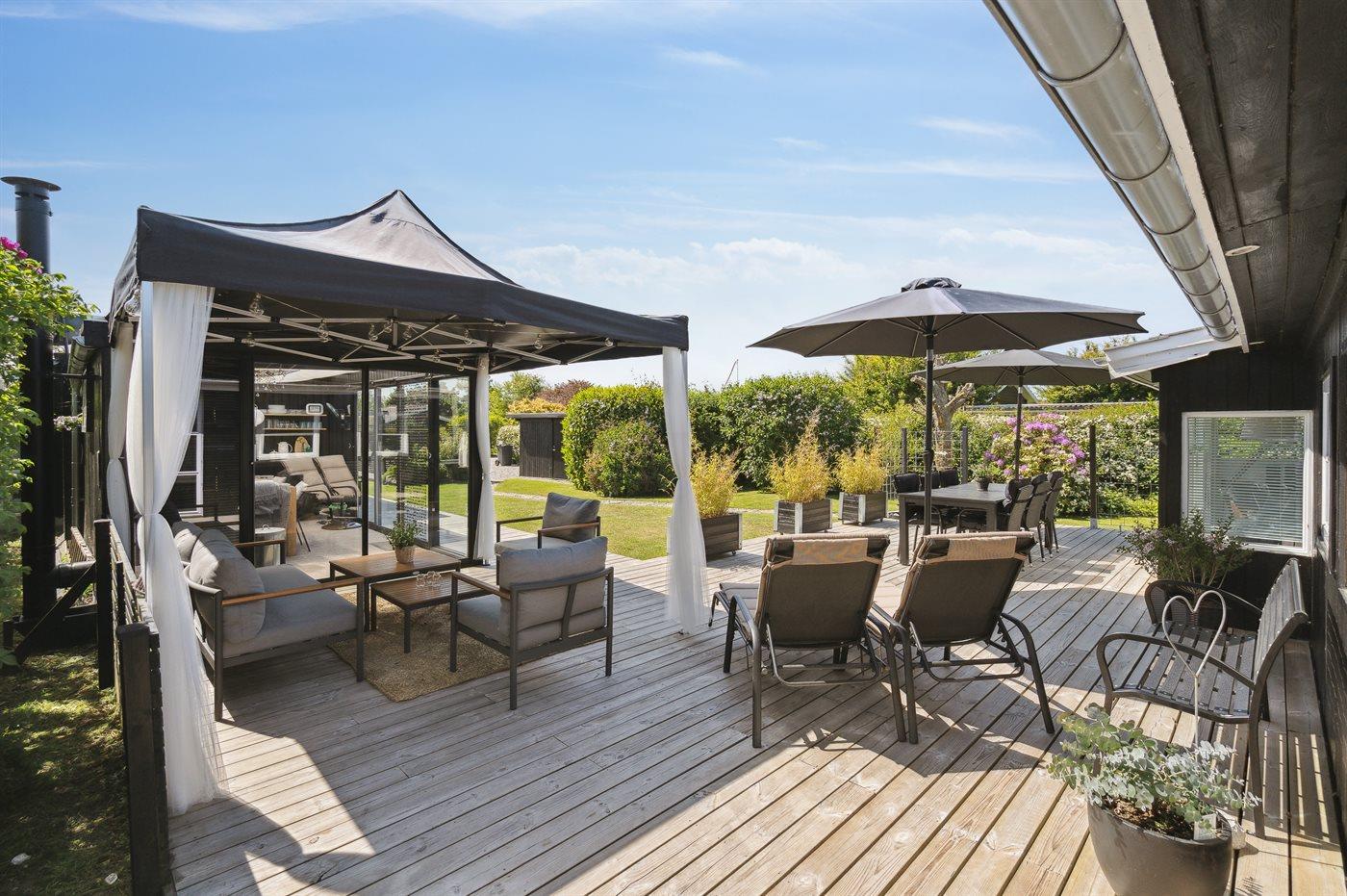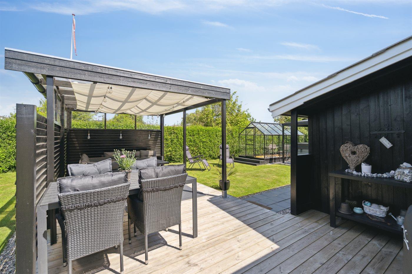 Rundt om huset er der flere terrasser, hvoraf en del er overdækket. Bemærk den flotte, veludstyrede udestue, hvor dørene kan åbnes helt op. I den ugenerte have er der bl.a. opsat stativ med forskellige udendørsaktiviteter for børnene.