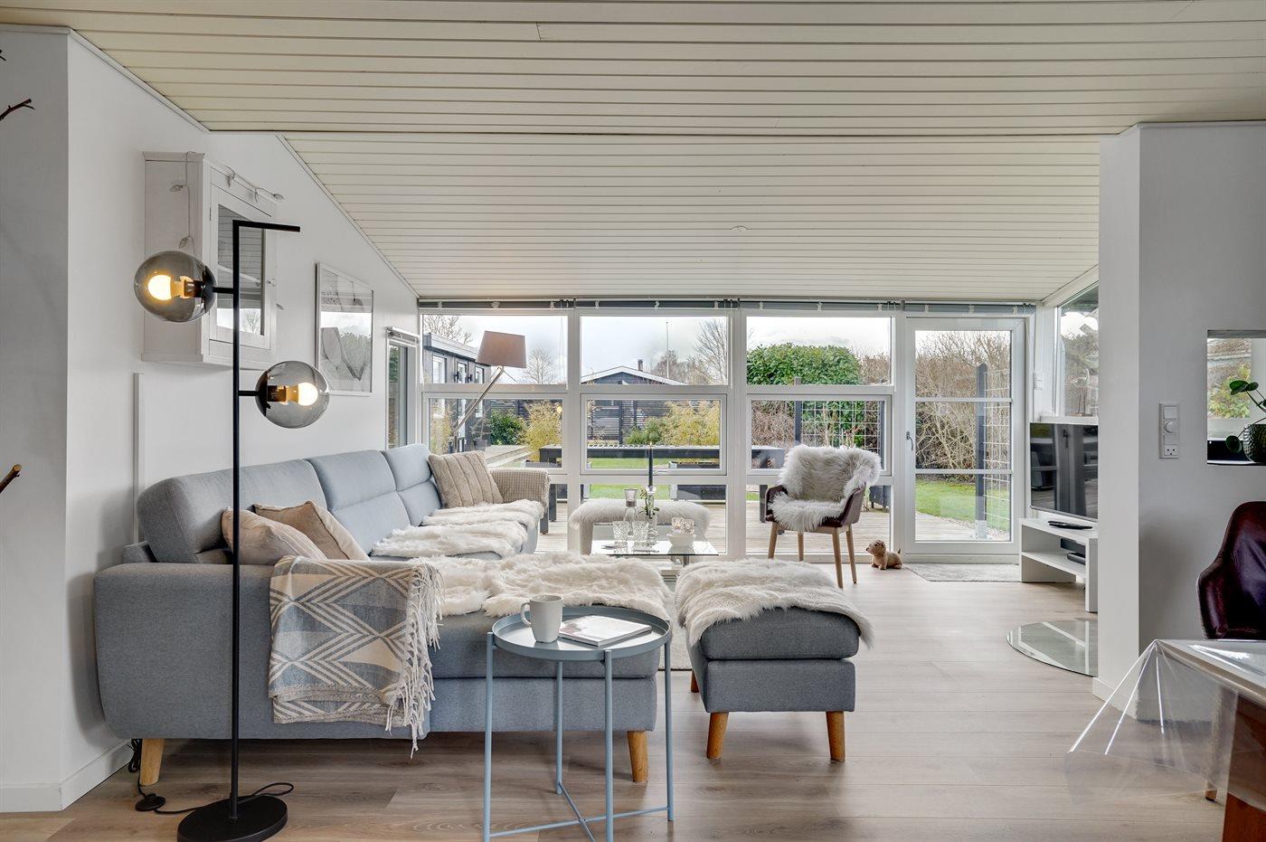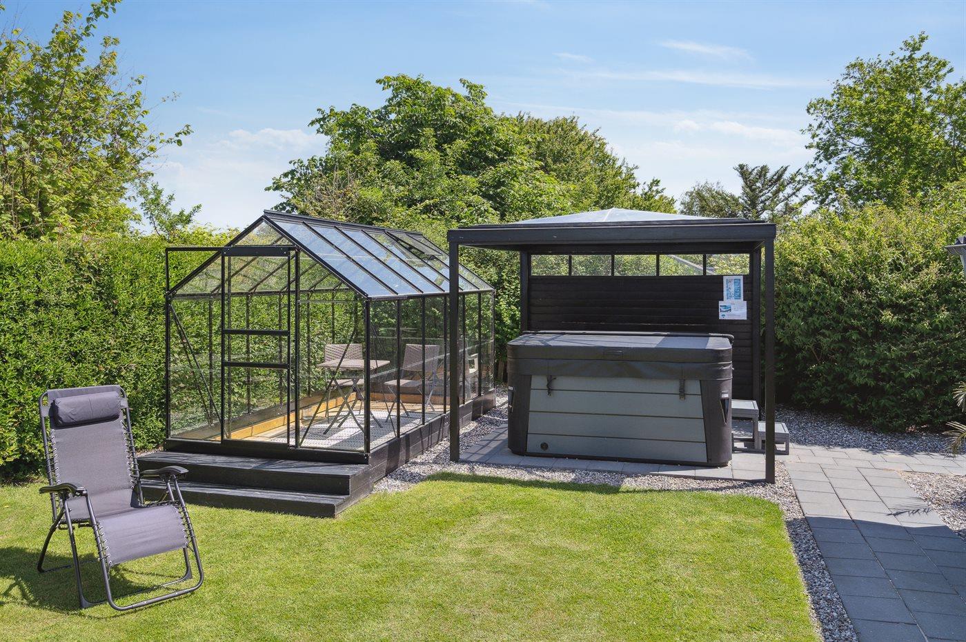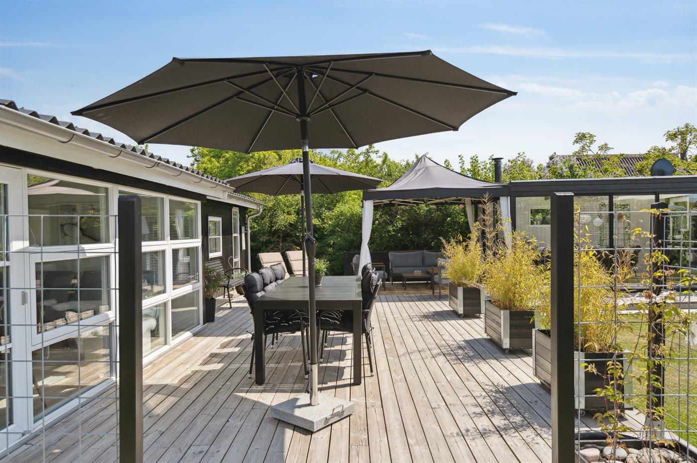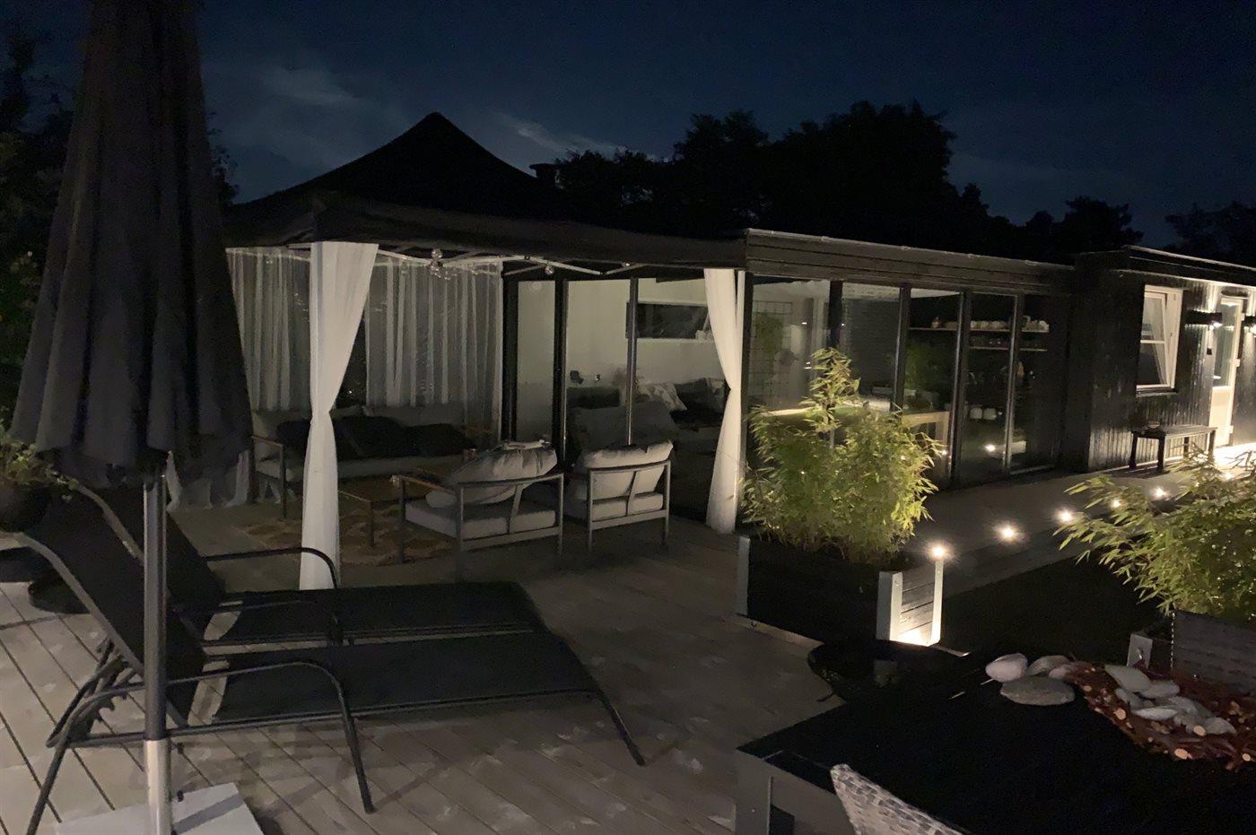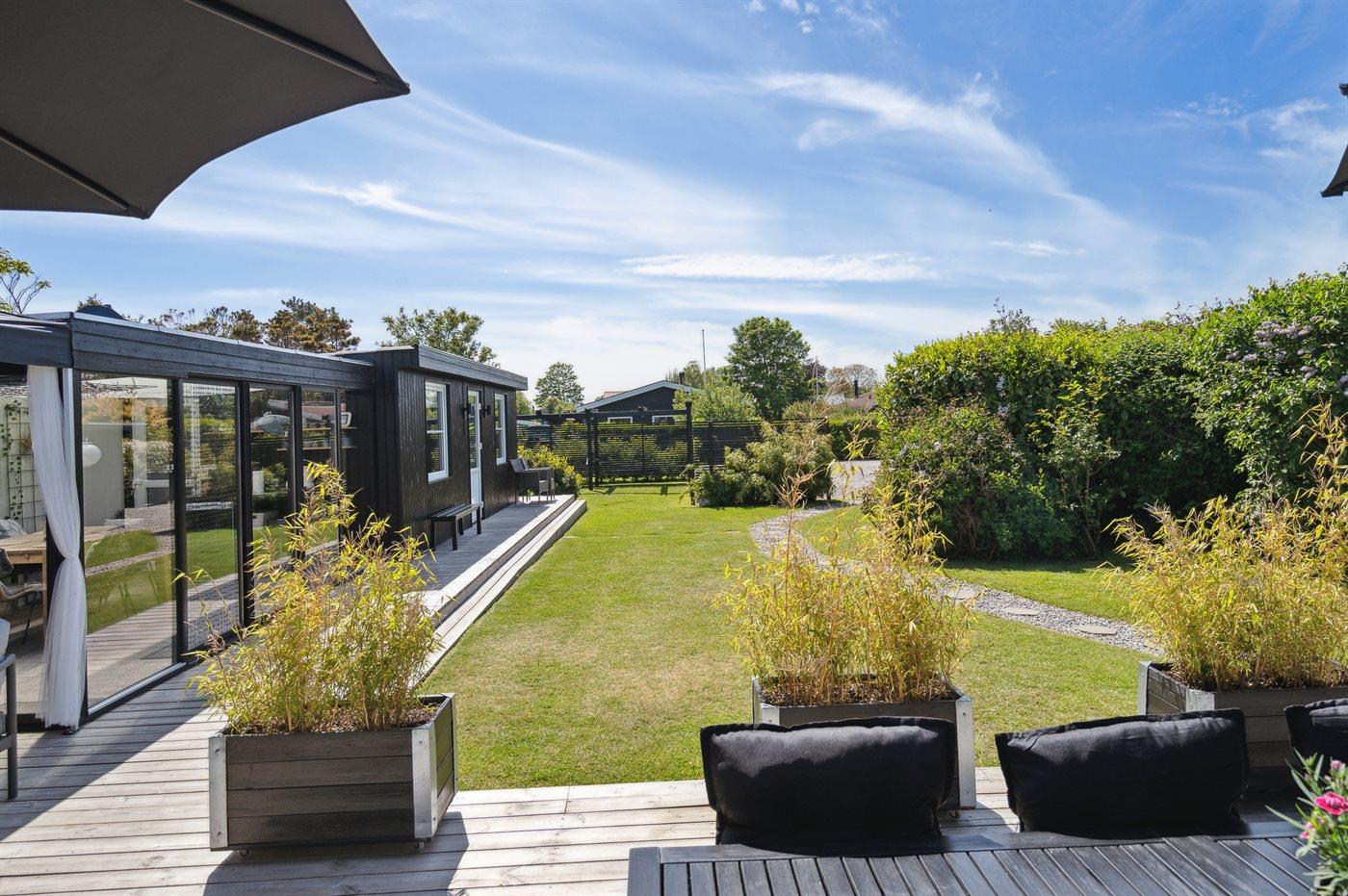 Rundt om huset er der flere terrasser, hvoraf en del er overdækket. Bemærk den flotte, veludstyrede udestue, hvor dørene kan åbnes helt op. I den ugenerte have er der bl.a. opsat stativ med forskellige udendørsaktiviteter for børnene.