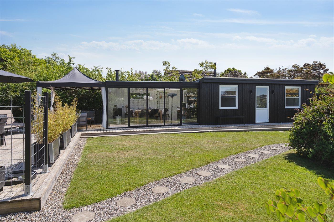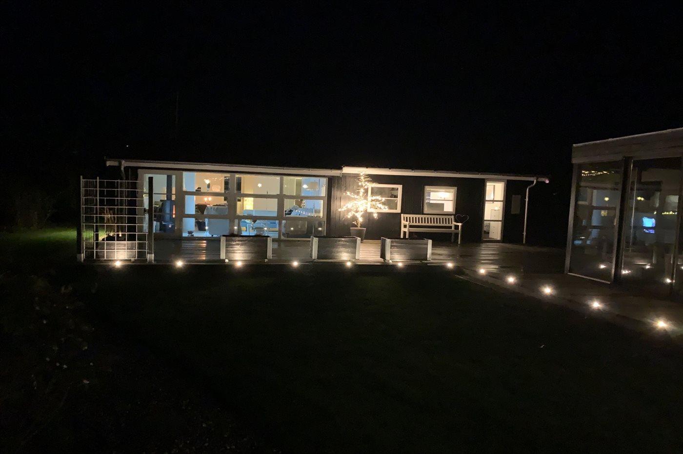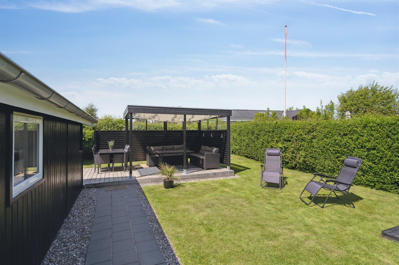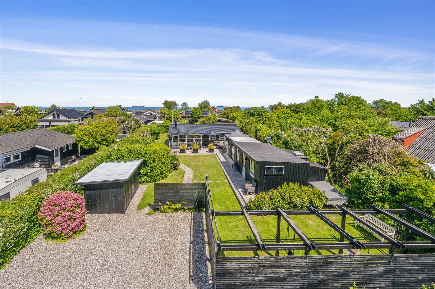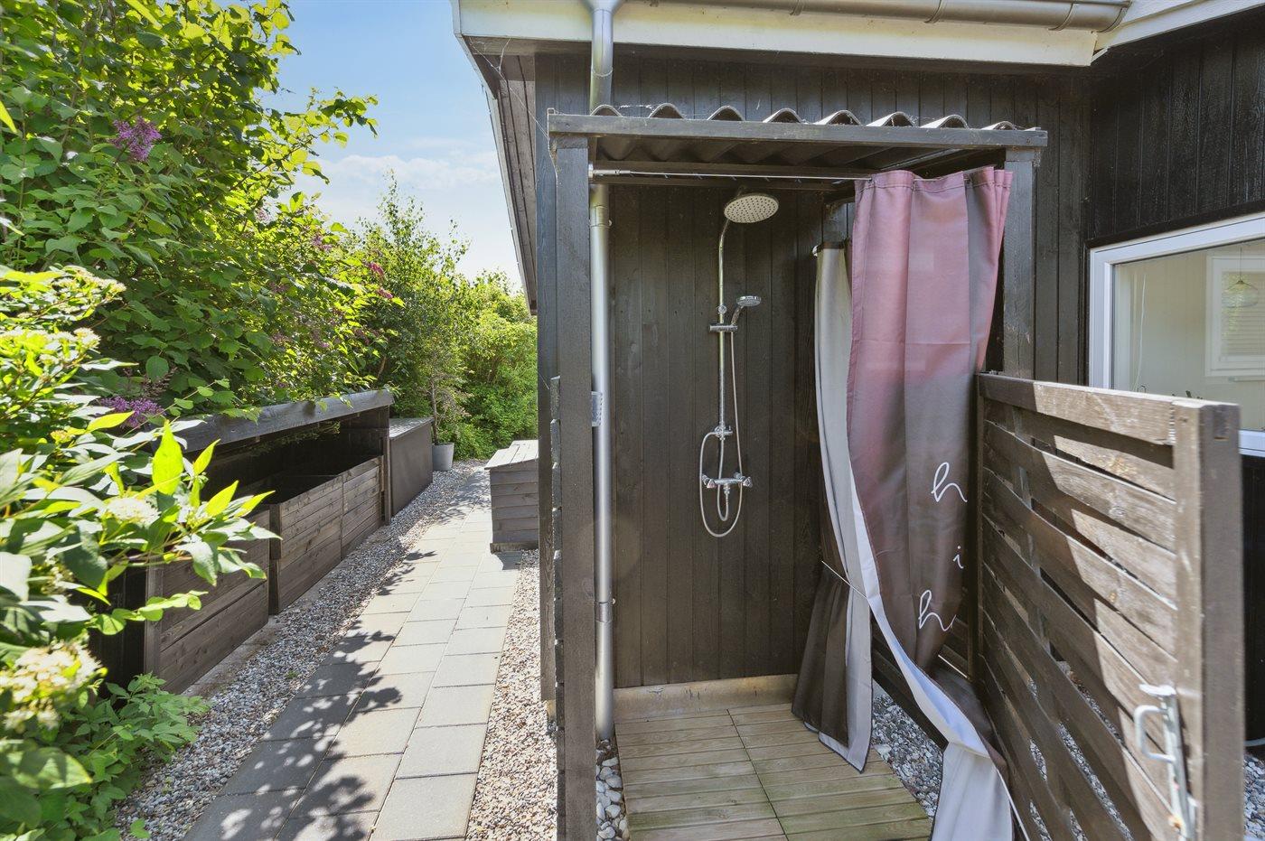 Ferieboligen er beliggende på en 800 m² stor havegrund. Der er 125 m til havet. Nærmeste forretning er beliggende i en afstand af 5800 m. Til ferieboligen hører åbent terrasseareal. Desuden er der overdækket terrasse. Ligeledes er der adgang til udestue. Der er redskabsrum. Gynge. Bålsted. Udendørs bruser. Der er mulighed for at tilberede maden udendørs i udekøkkenet. Grill til rådighed. Der er installeret stik til opladning af elbil. Type 2 stik. Med 11 kW ladeeffekt. Parkering ved ferieboligen.