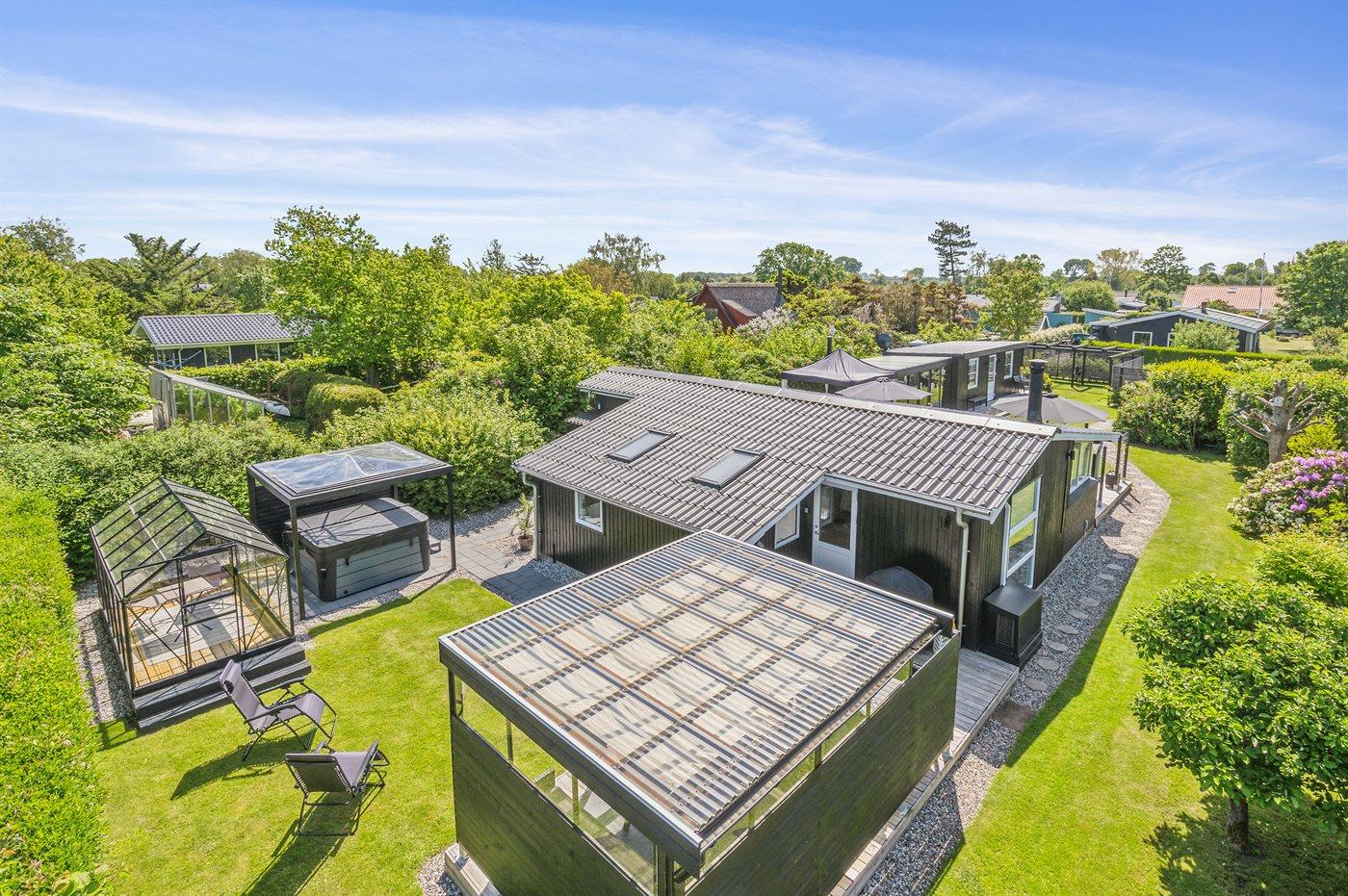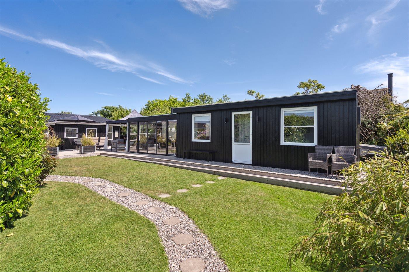 Moderne sommerhus nær børnevenlig strand med spa, flere terrasser og anneks i Otterup.