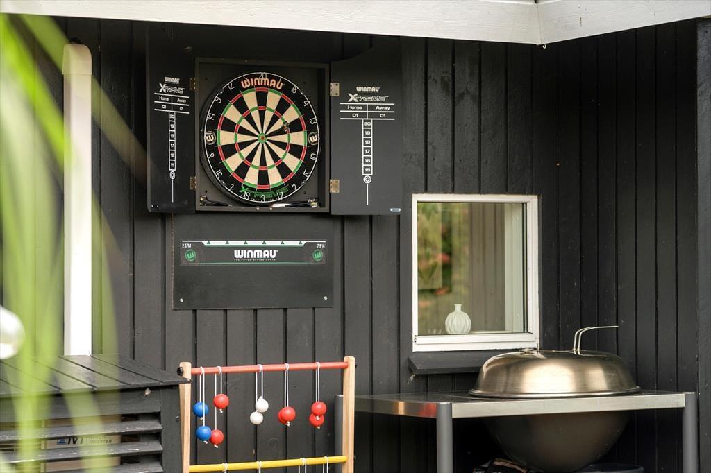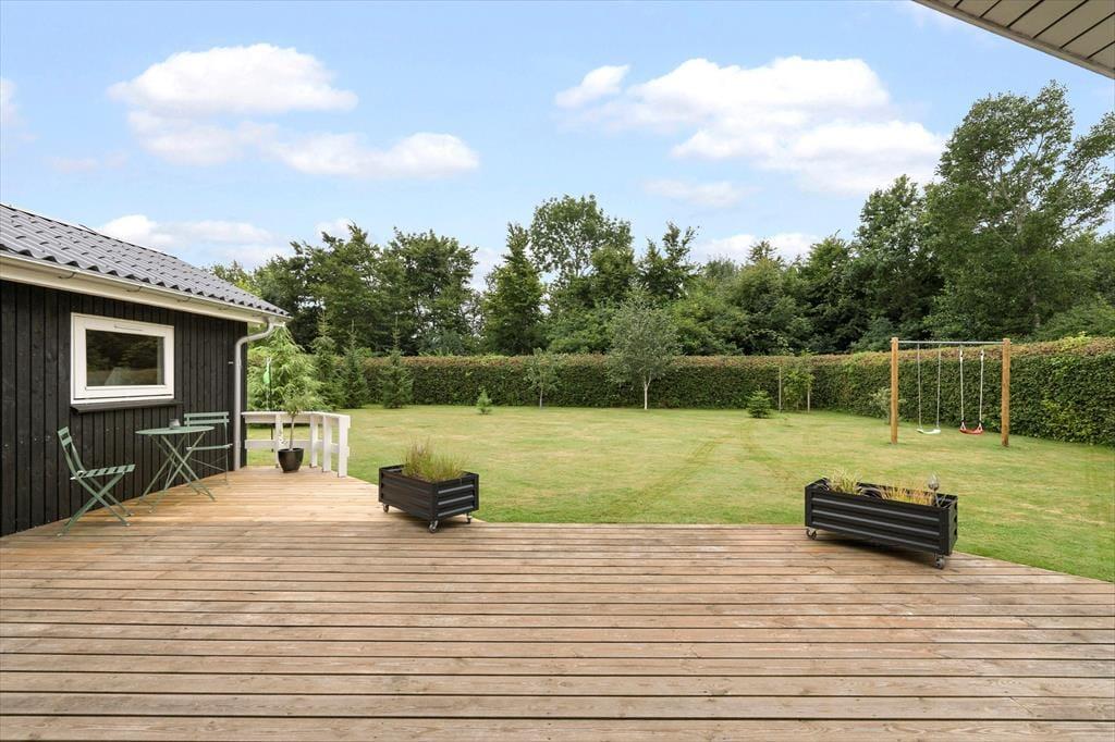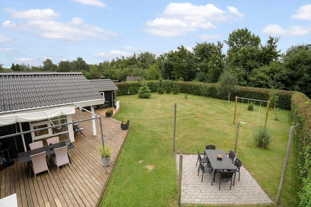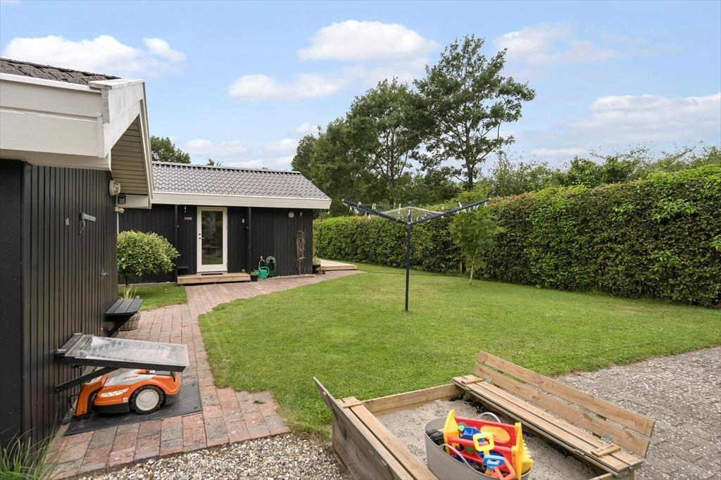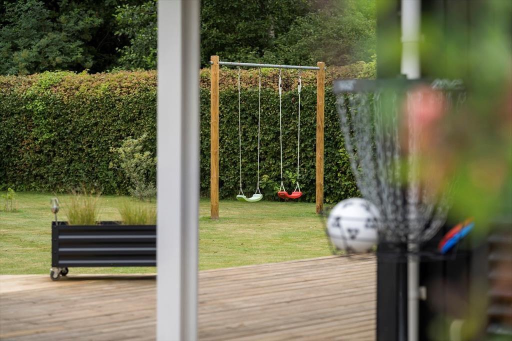 På plænen er der et dobbelt gyngestativ med gynger til børnene samt en discgolfkurv. På carporten findes et udendørs køkkenbord og vask med koldt vand.