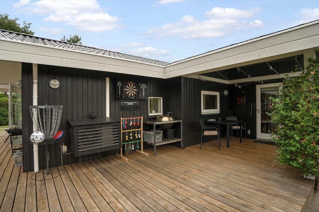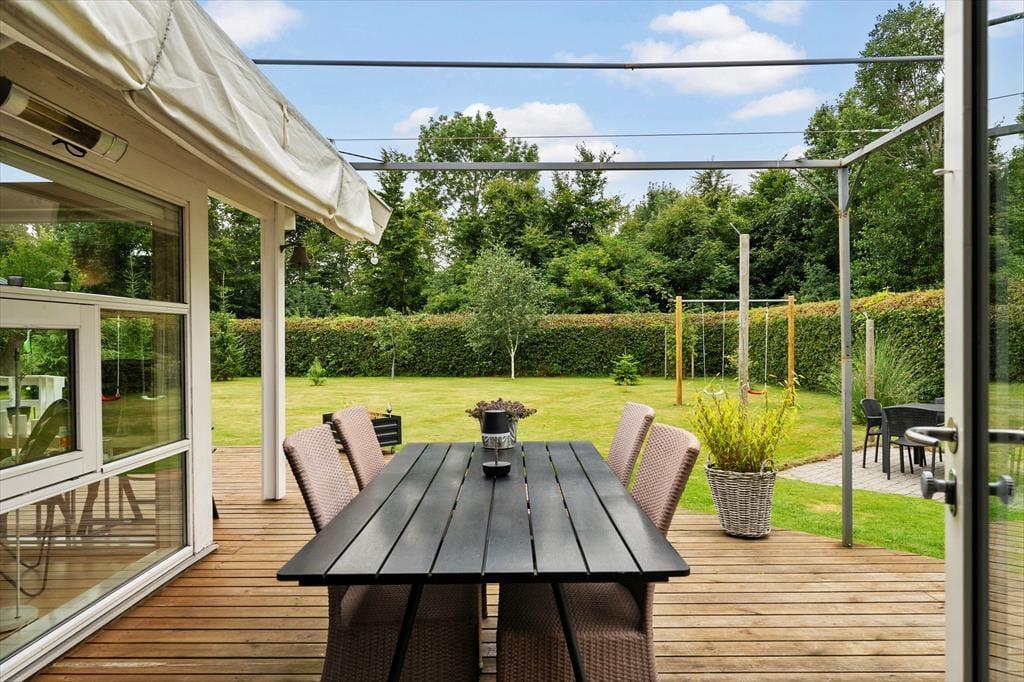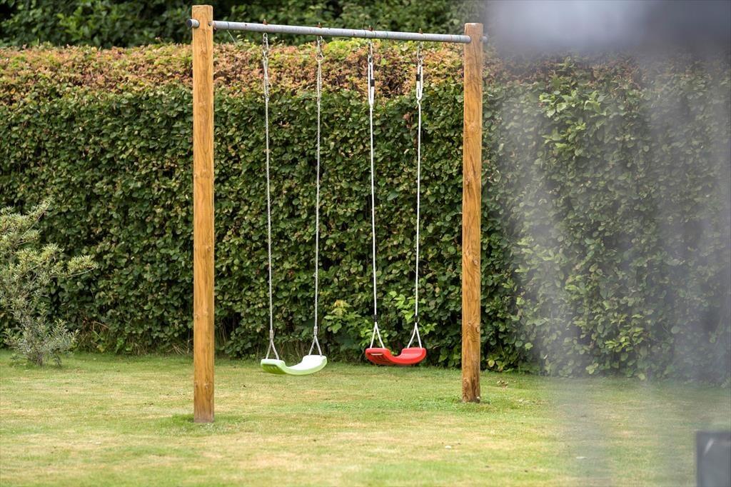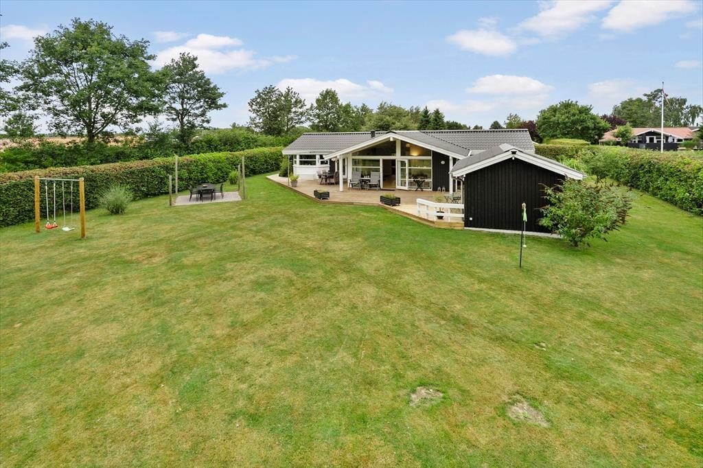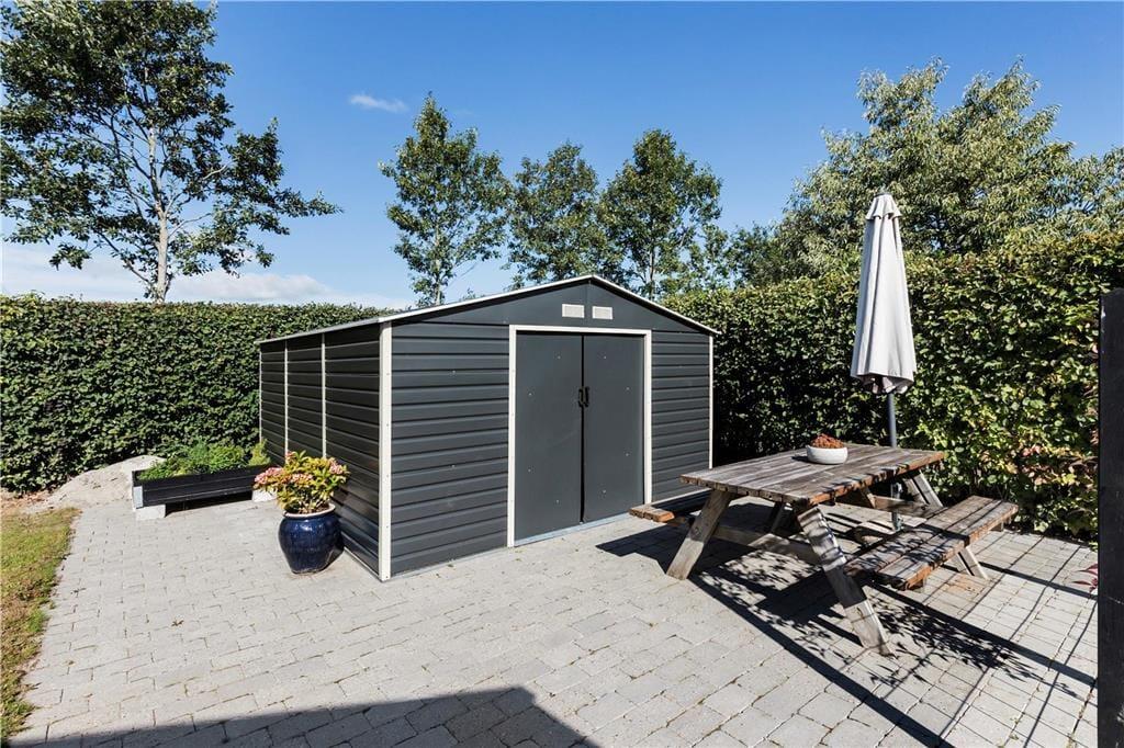 På plænen er der et dobbelt gyngestativ med gynger til børnene samt en discgolfkurv. På carporten findes et udendørs køkkenbord og vask med koldt vand.