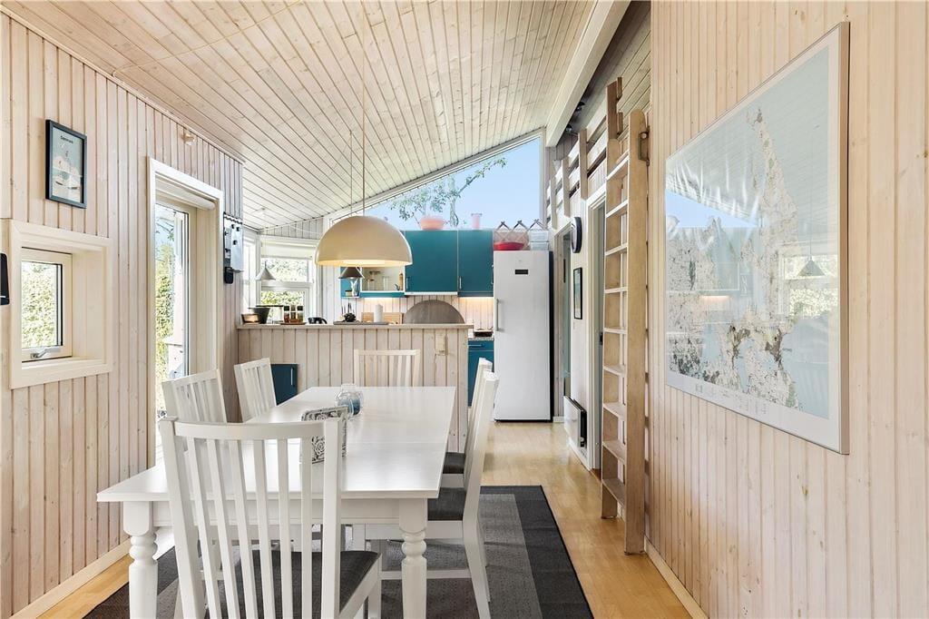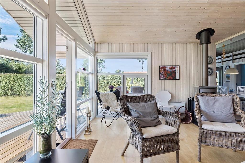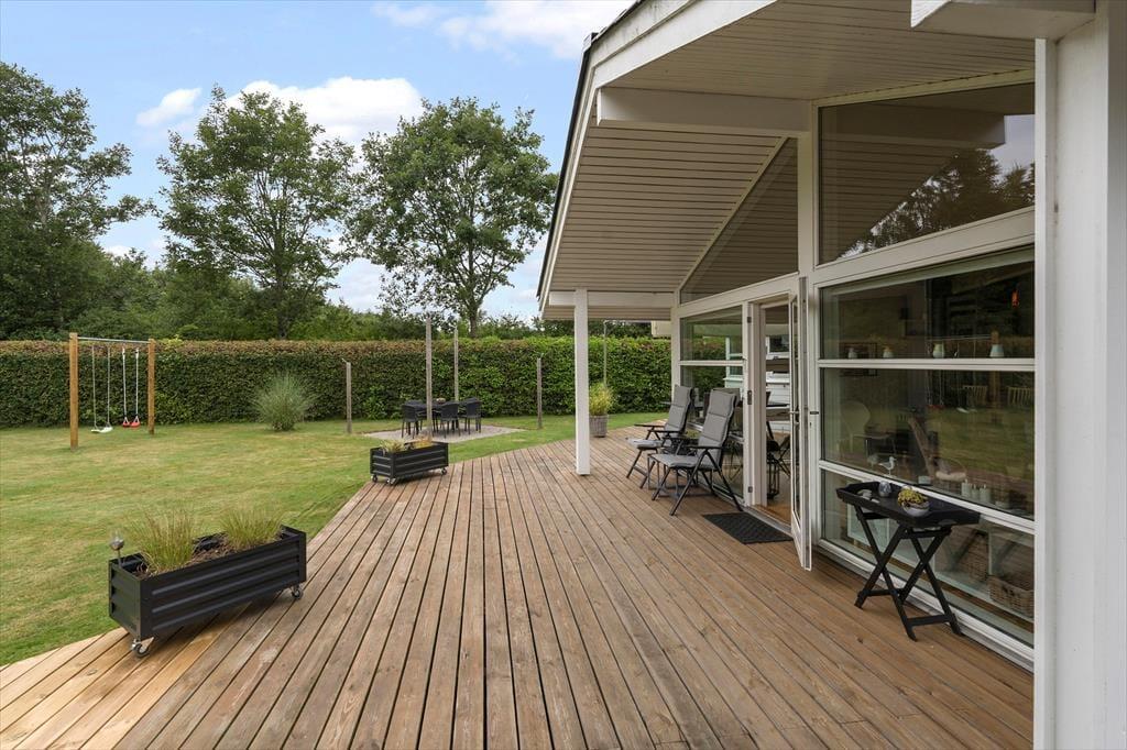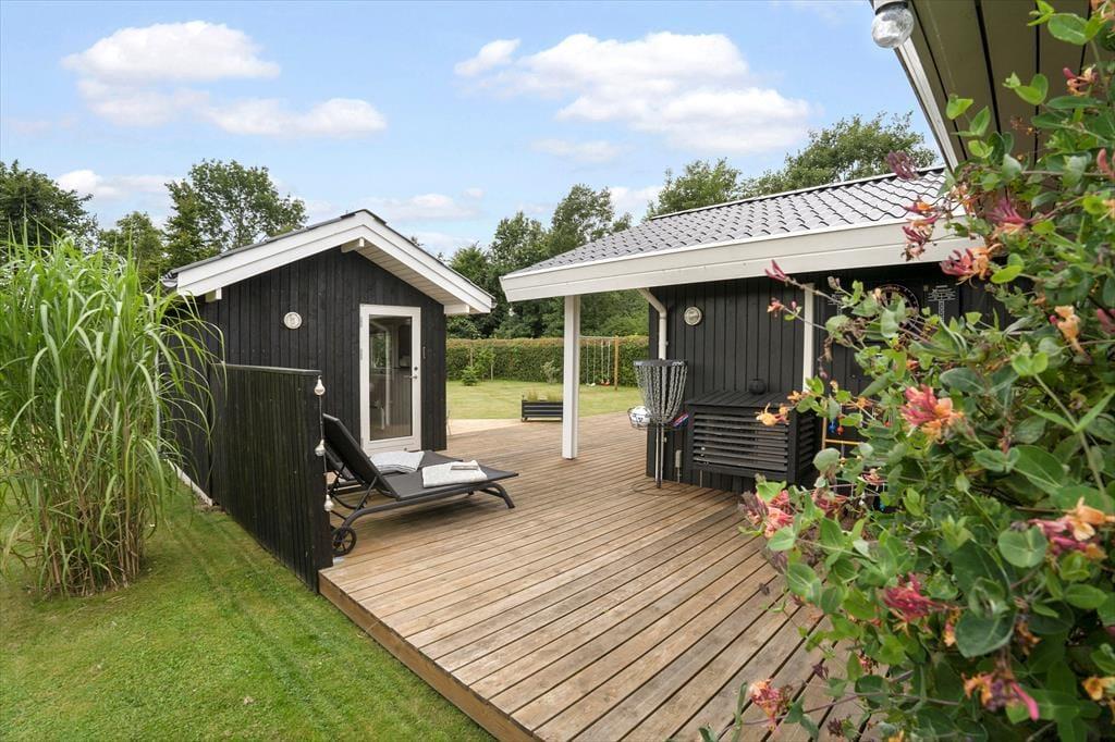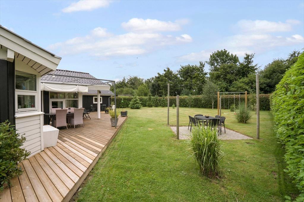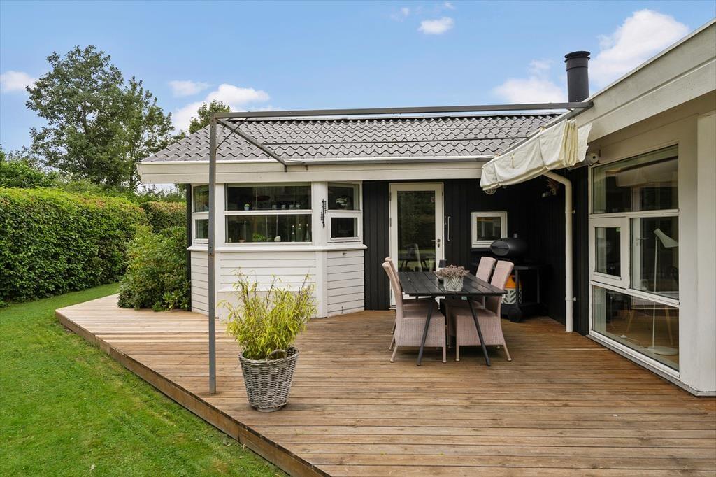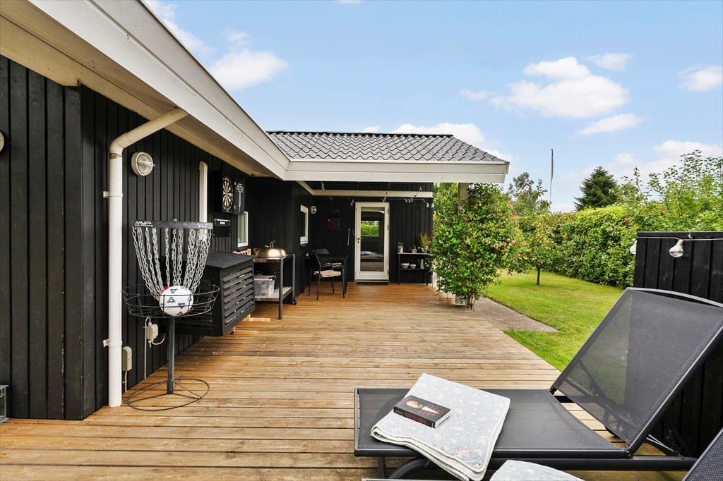 Flot og velholdt sommerhus, beliggende i det populære sommerhusområde Hasmark, med kun 300 meter til badestrand. Huset indeholder en entré, et veludstyret køkken i åben forbindelse med spiseafdelingen og opholdsstuen med brændeovn, energibesparende varmepumpe og loft til kip. Huset indeholder 2 gode soveværelser, et gæstetoilet samt et stort badeværelse med spabad, sauna og vaskemaskine. Fra terrassen er der direkte adgang til 2 gode annekser med yderligere 4 sovepladser. I huset er der desuden en god hems med madrasser. Der er udgang fra både opholdsstue og spisestue til en stor, ny træterrasse på ca. 100 m2 med flere hyggekroge og til haven med en stor græsplæne, der indbyder til boldspil og leg.