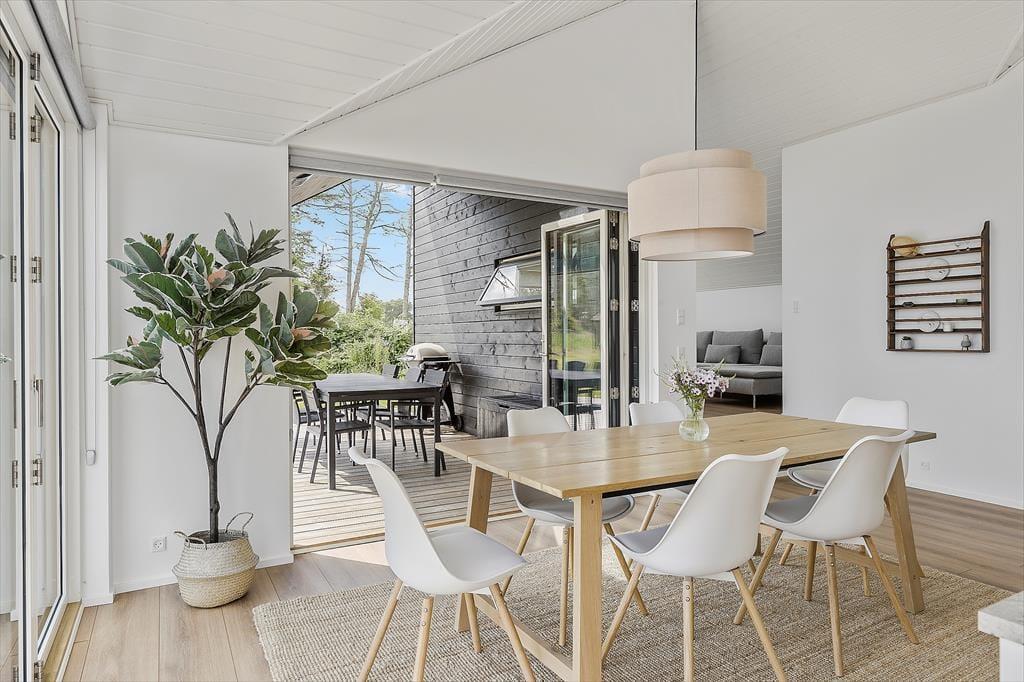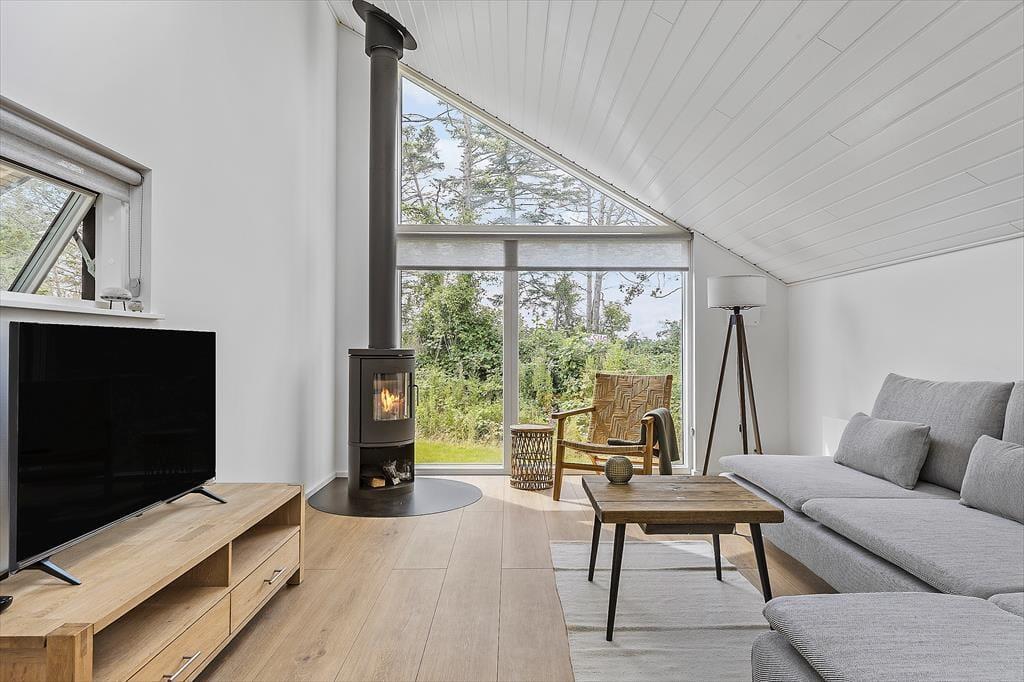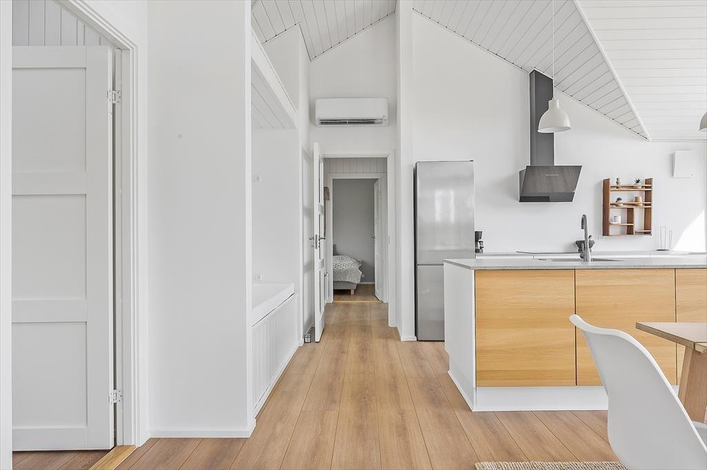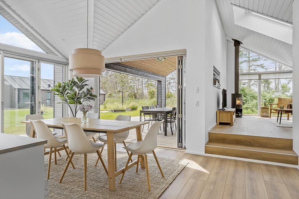 Når I træder ind i det flotte sommerhus, vil I straks føle jer hjemme. Huset byder på et stort og stilfuldt køkken/alrum, hvor I kan samle hele familien omkring madlavningen. Køkkenet er udstyret med alt, hvad I behøver for at tilberede lækre måltider, mens den store spiseplads indbyder til hyggelige middage og lange samtaler. Opholdsstuen ligger i forskudt niveau fra spisestuen og har en charmerende brændeovn, der skaber en varm og indbydende atmosfære – perfekt til rolige aftener med en god bog eller en spændende film.