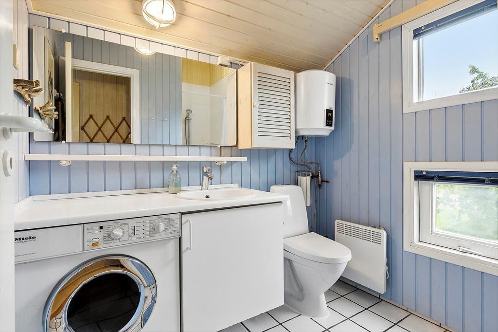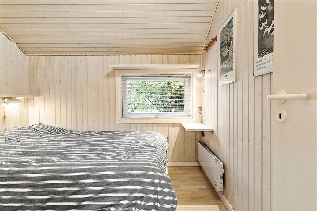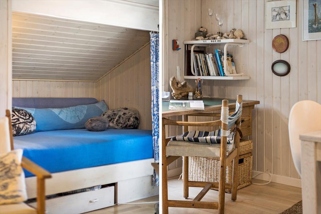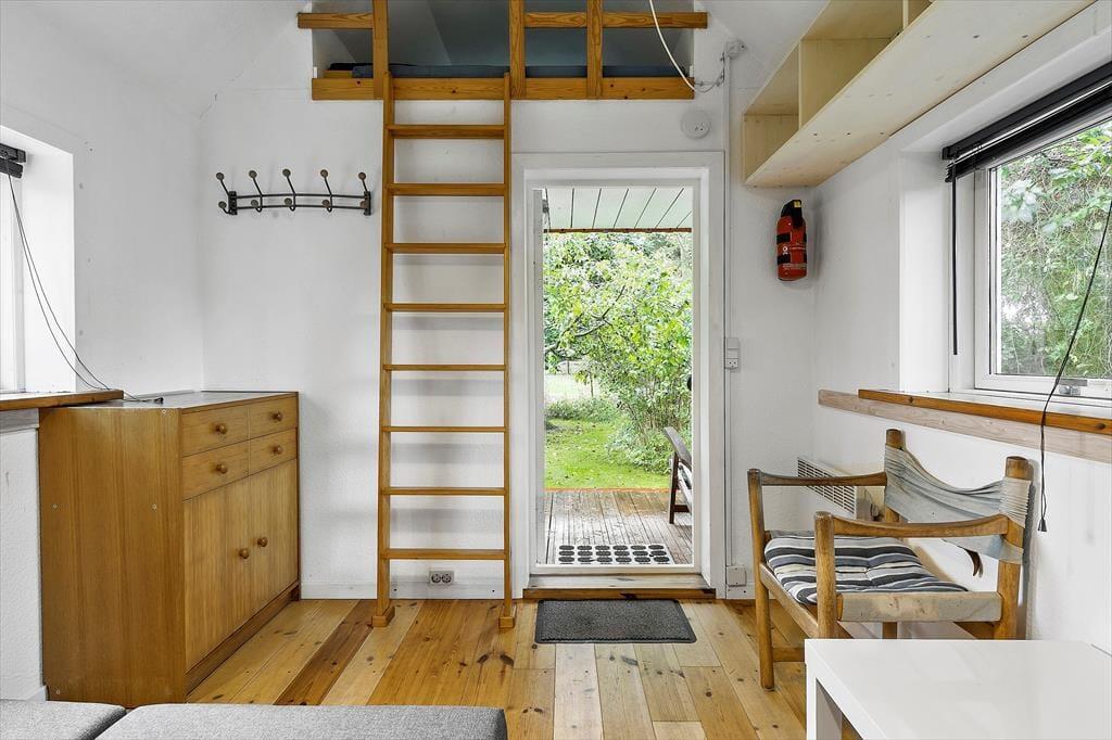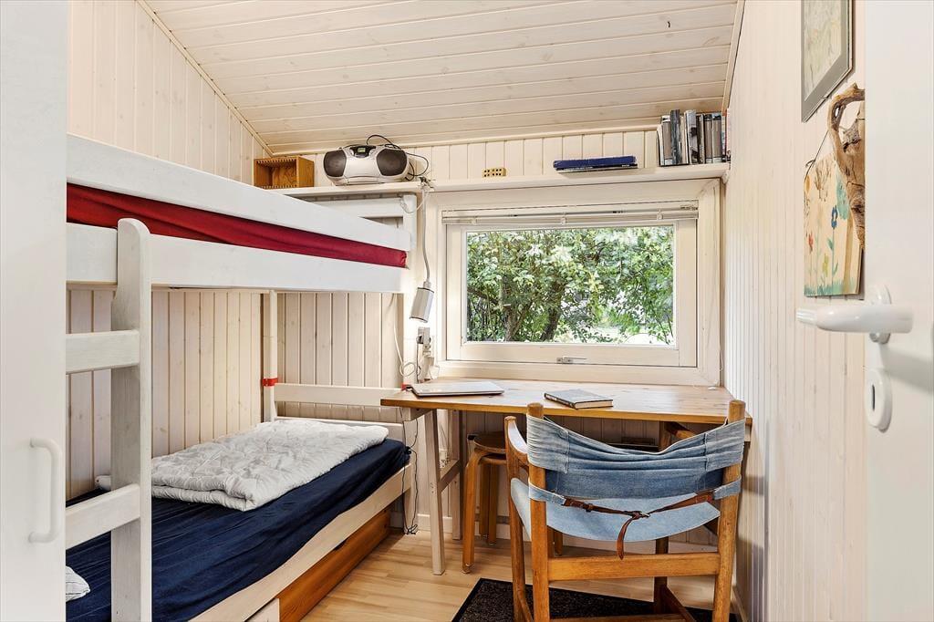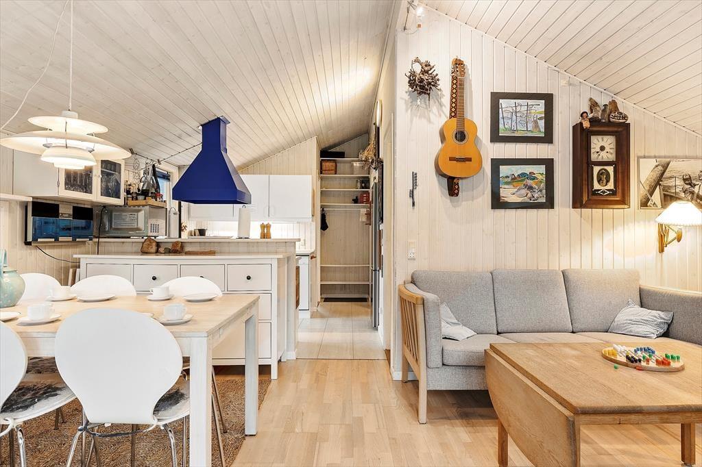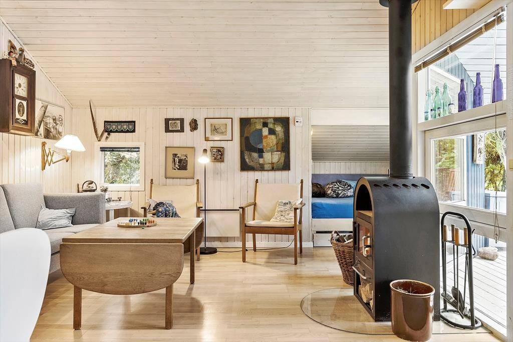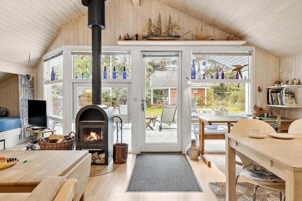 Når du træder ind i sommerhuset, bliver du mødt af en lys og indbydende atmosfære. Det åbne stue-køkkenområde er designet til at fremme hyggen, hvor du kan samles omkring brændeovnen, der skaber en varm og hyggelig stemning på kølige aftener. De tre dejlige soveværelser er rummelige og indbydende, hvilket sikrer, at alle kan finde deres eget fredelige hjørne til afslapning. Det funktionelle layout giver mulighed for både intime stunder og sociale sammenkomster, hvor du kan nyde madlavning og samtaler med dem, du holder af.