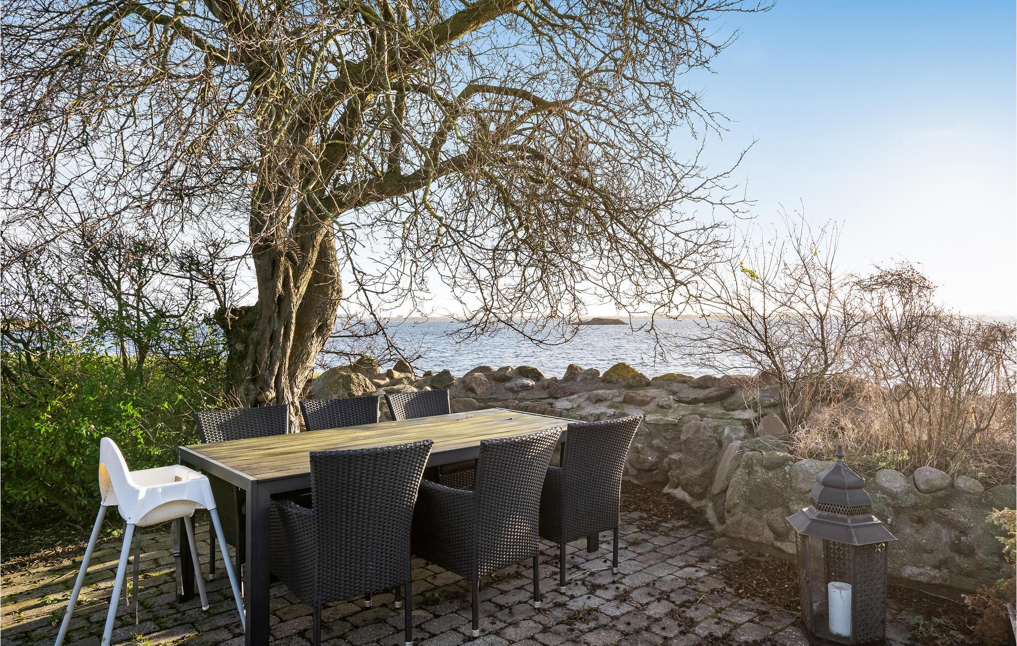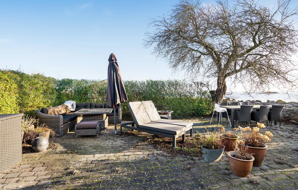 Udenfor har I en overdækket loungemøbel direkte ved vandet til rådighed, samt en stor, åben fliseterrasse med diverse havemøbler, parasol, en grill til hyggelige grillaftener og naturligvis udsigt over fjorden. Herfra kan I bogstaveligt talt kaste fiskestangen direkte i vandet og se, om aftensmaden bider på krogen.