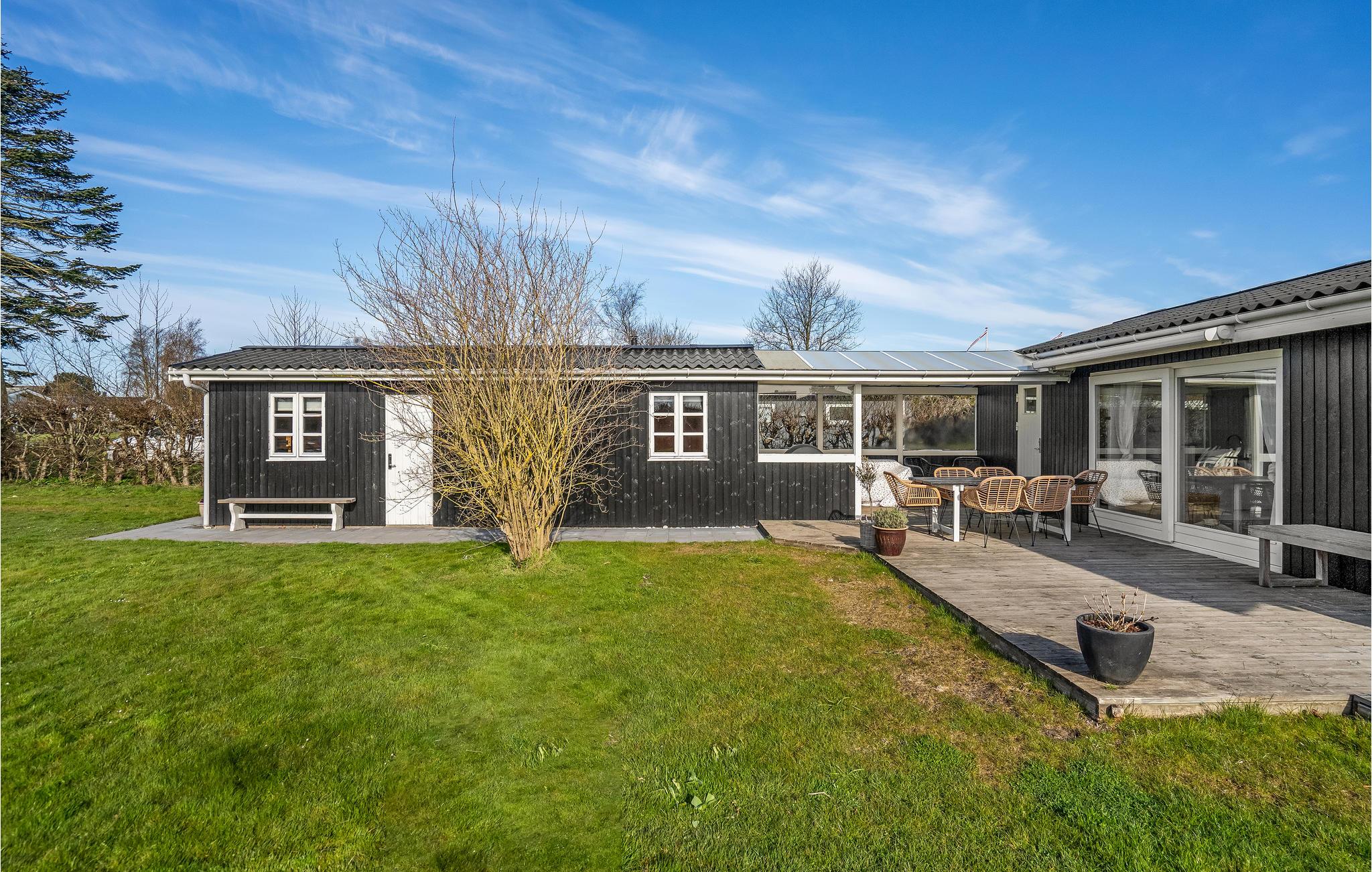 Hyggeligt sommerhus tæt på sandstrand ved Hasmark Strand med terrasse og trampolin.