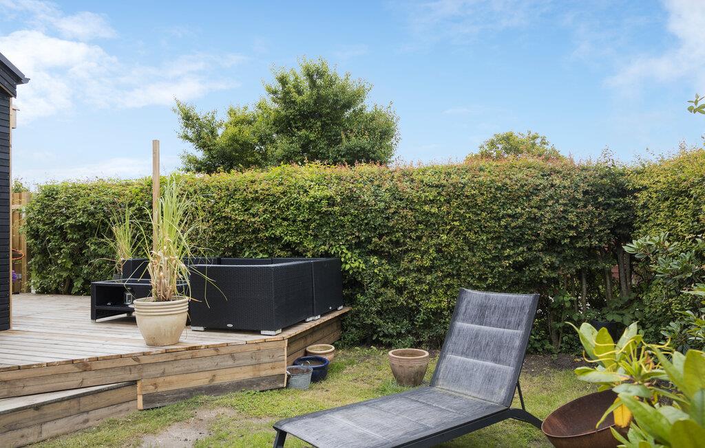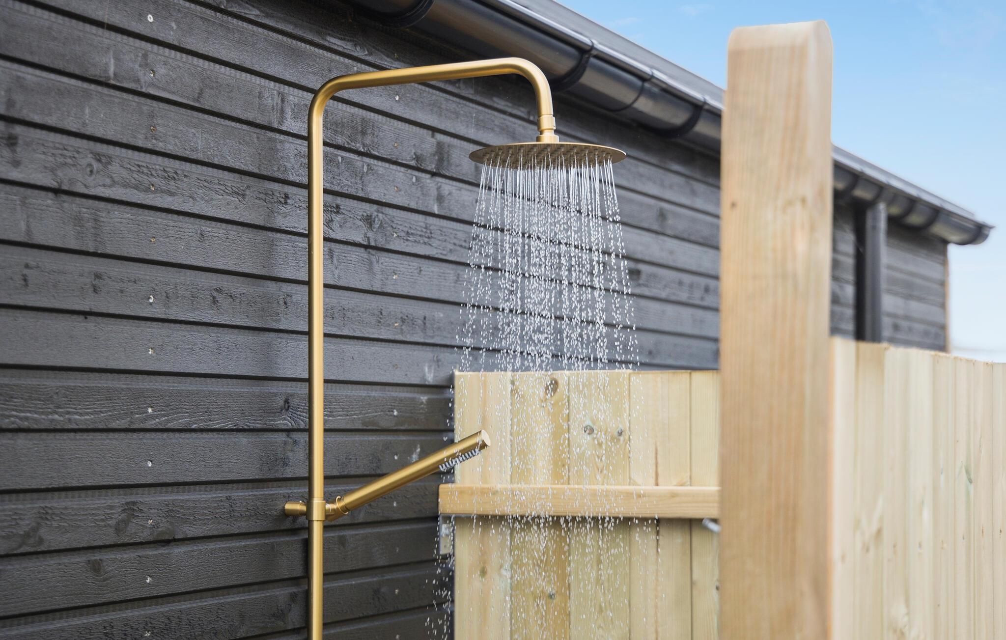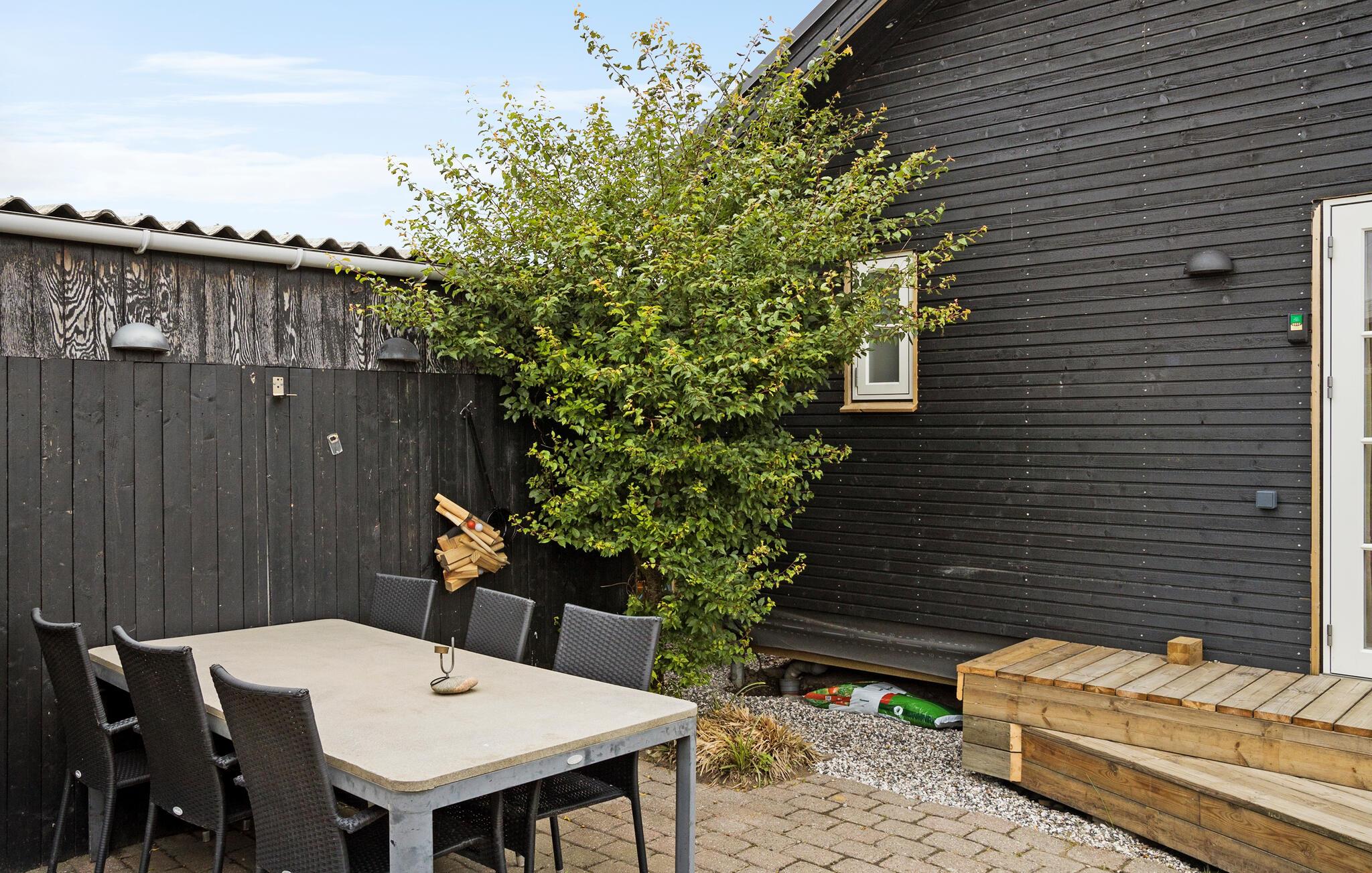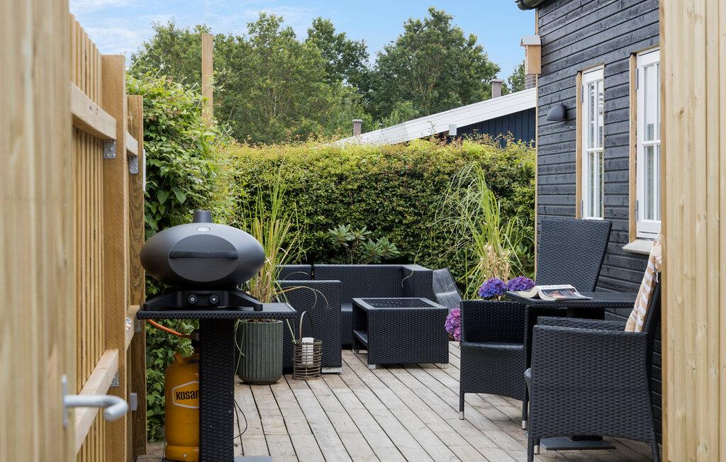Hvis I træder ud på træterrassen, som omkranser huset, kan I nyde den danske sol, tage en forfriskende skyller eller forberede til den store grillaften.