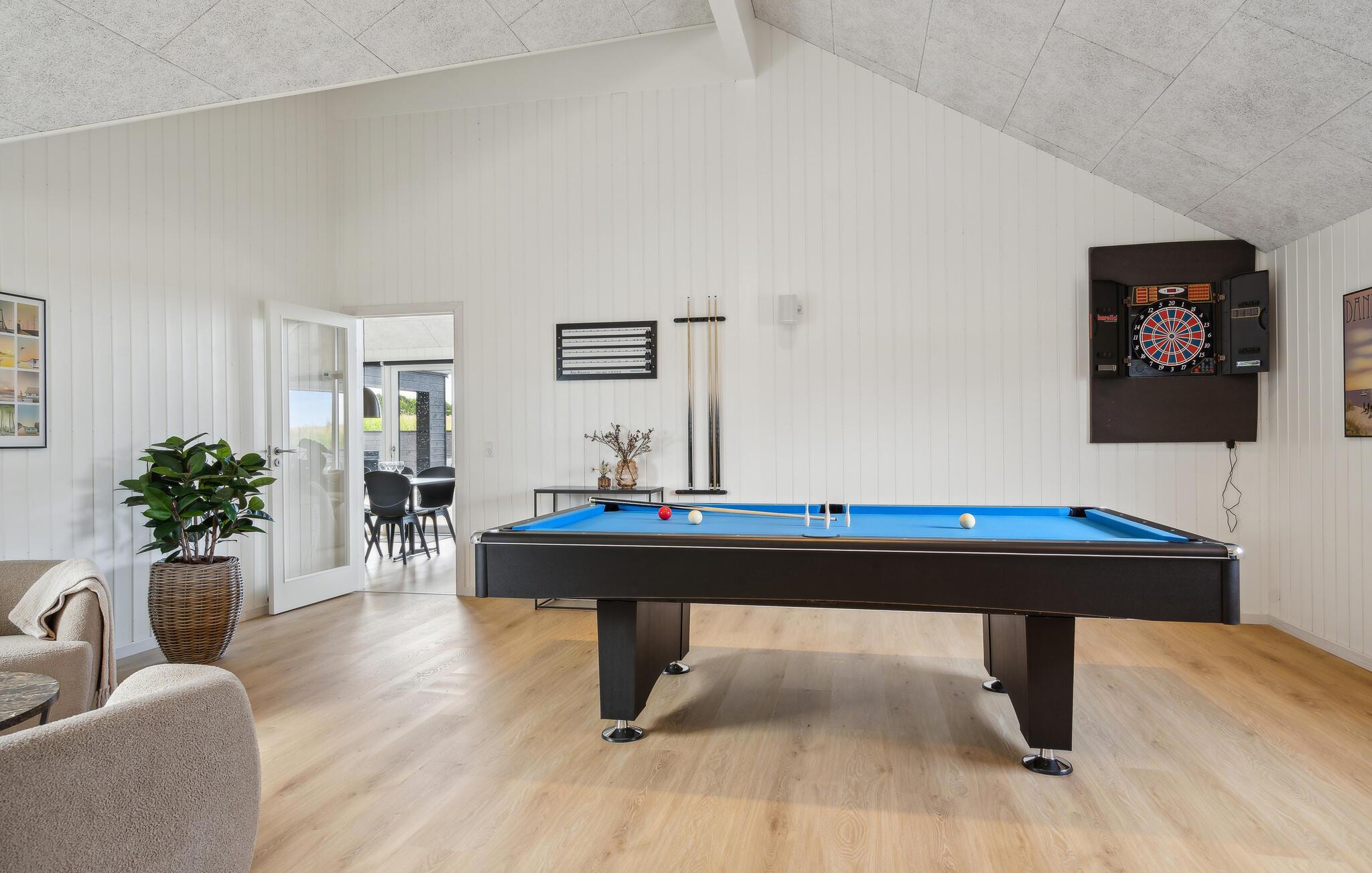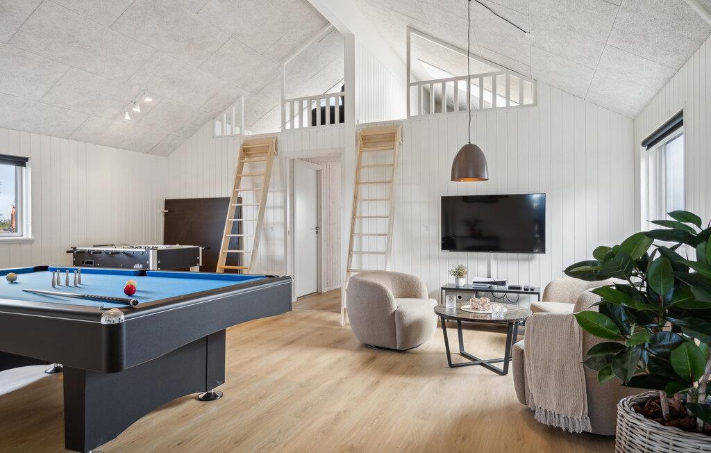 Tæt på Fyns nordlige kyst ligger dette fantastiske hus, som med sine mange kvadratmeter og høje komfortniveau danner de bedste rammer om en ferie med hele den udvidede familie på tværs af generationerne. Huset er utrolig veludstyret med moderne faciliteter over hele linjen, så her får alle aldre noget for pengene. Lad amatørkokkene kræse om livretterne i køkkenet og dæk op til den store festmiddag ved spisebordet. Efter aftensmaden kan I udfordre hele flokken til dueller ved billard-, bordtennis- eller bordfodboldbordet. På de kølige dage kan børnene plaske rundt i poolen, så tosset de vil, mens de voksne tager det lidt mere roligt og sveder godt igennem i saunaen. Rund aftenen af i sofaerne med brætspil, kortspil eller en god film, inden I går til køjs i de komfortable soveværelser.