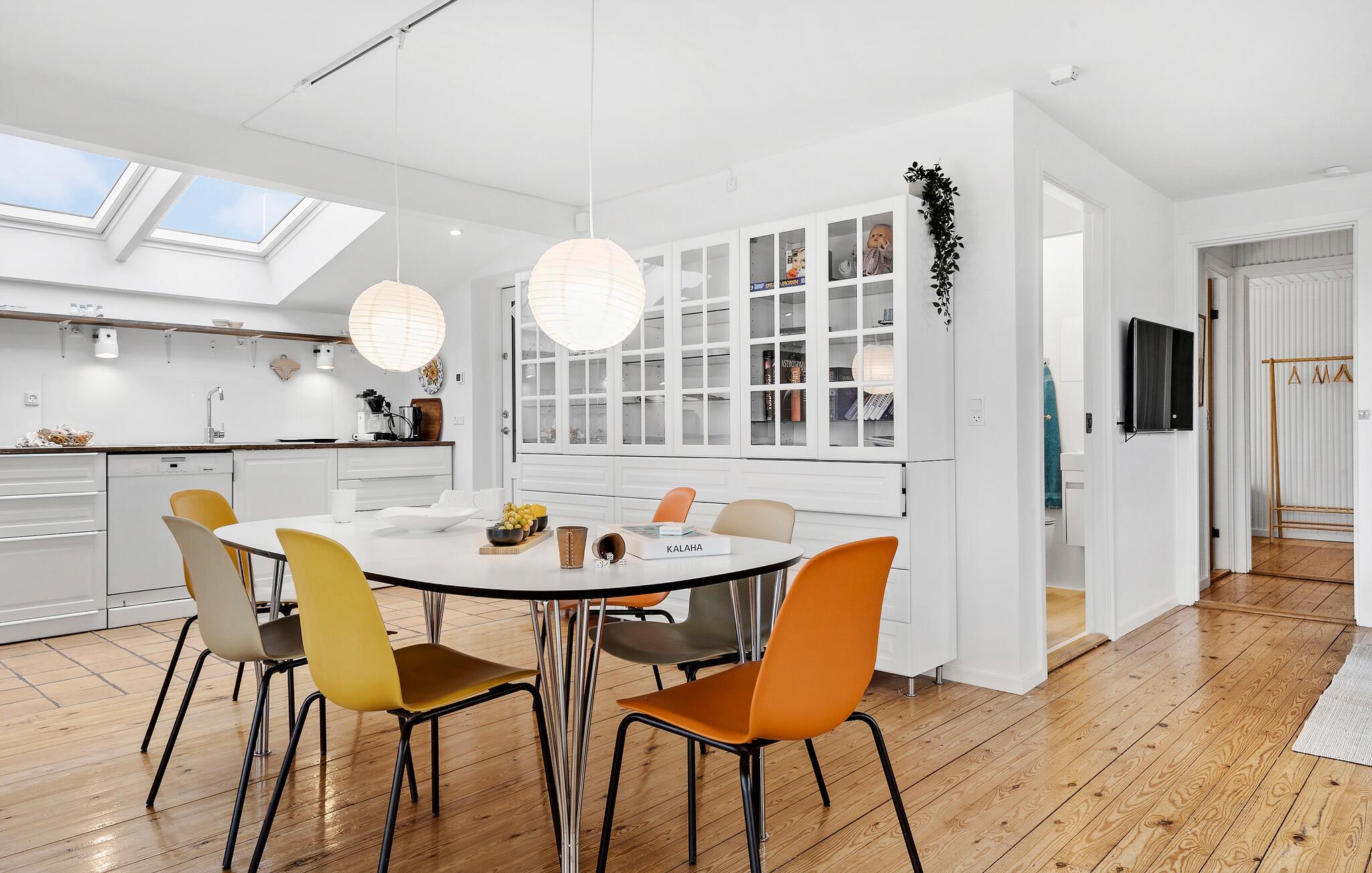 Huset er indrettet med pæne trægulve, finurlige udsmykningsdetaljer og en brændeovn, der giver varme og stemning på de lidt køligere dage. Nyd godt af de dejlige lysindfald fra vinduespartierne og ovenlysvinduerne og gør madlavningen til et fællesprojekt, inden I runder aftenen af i sofaen med brætspil eller hver jeres bog til langt ud på aftenen.