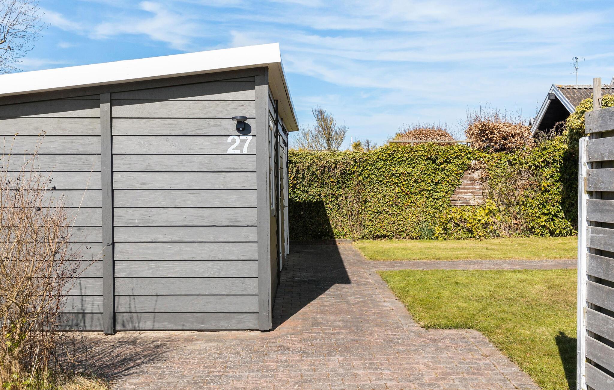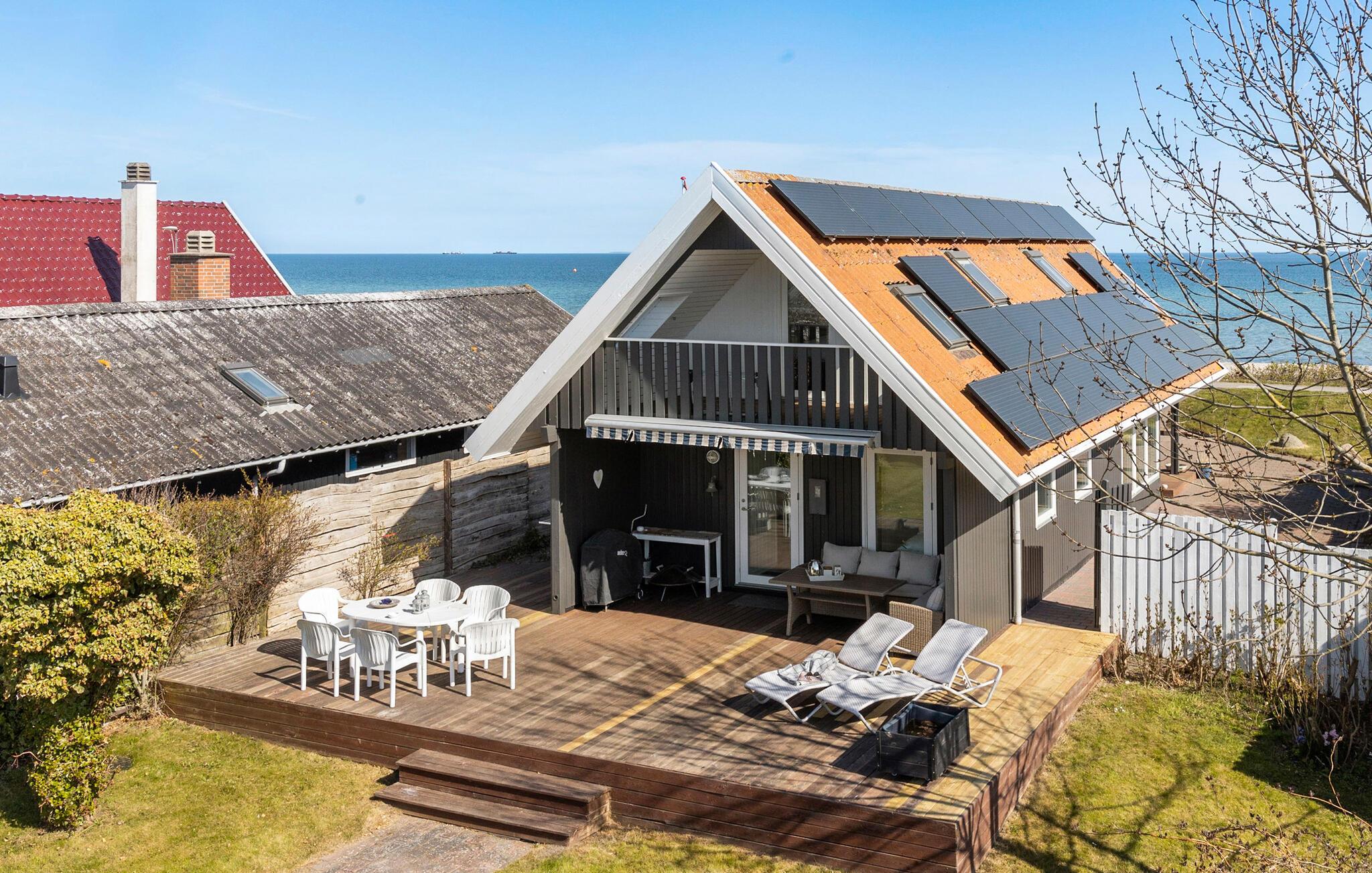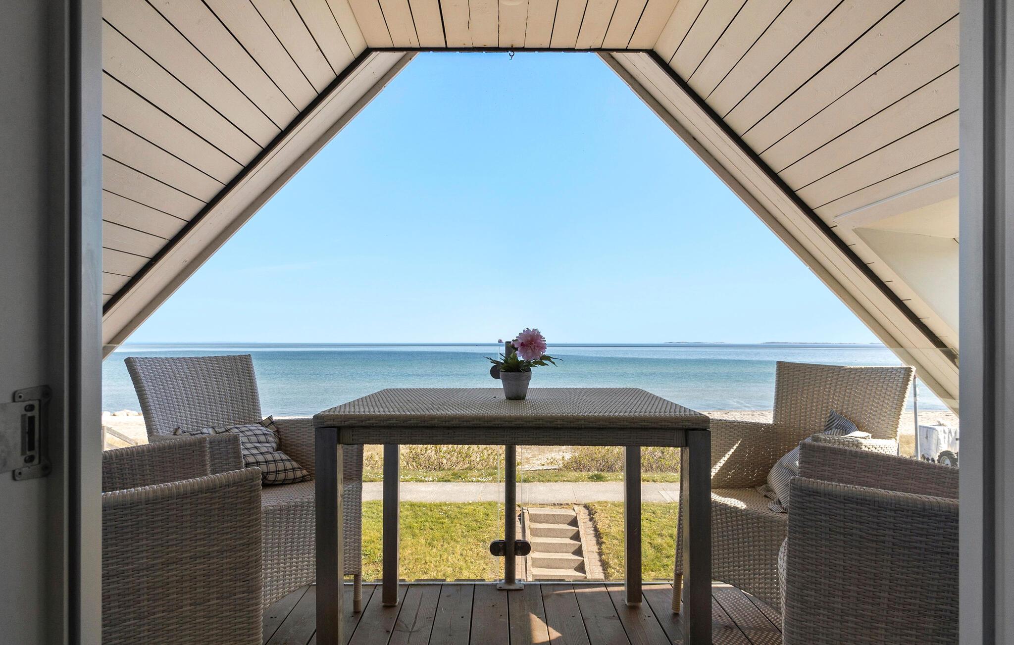 Udenfor er der en stor træterrasse med komfortable havemøbler og liggestole. Læn jer godt tilbage, mens I nyder den direkte udsigt over vandet. Den velholdte have byder på god plads til fritidsaktiviteter og lægger op til afslappede grillaftener. På sandstranden kan I tage morgenture eller snuppe en frisk dukkert i havet.