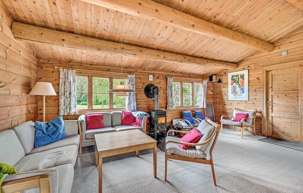 Rummeligt bjælke sommerhus nær Hasmark Strand med overdækket terrasse og aktiviteter for hele familien.