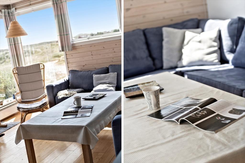 Dette charmerende feriehus er ideelt til jer, der kan lide at slappe af i solen med udsigt til masser af natur. Feriehuset ligger nemlig højt i landskabet på fjordsiden i Sønder Haurvig, og fra stuen og den sydvendte terrasse har I en pragtfuld panoramaudsigt over klitlandskabet, der strækker sig mellem Ringkøbing Fjord og Vesterhavet.