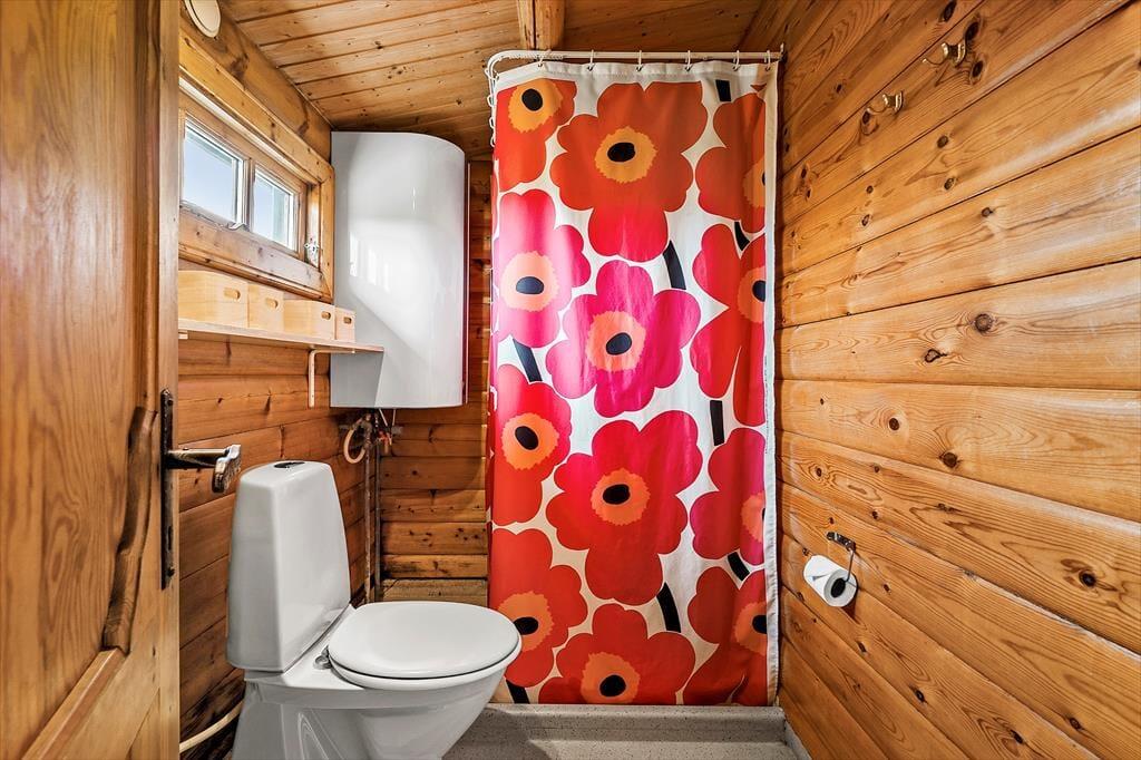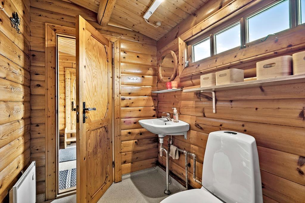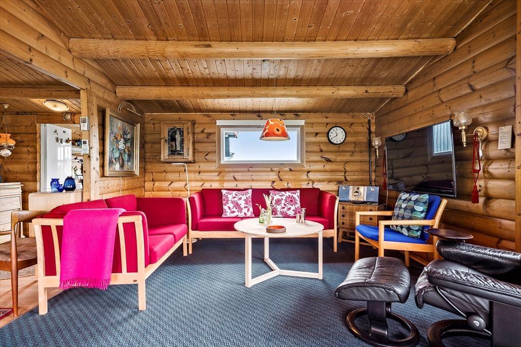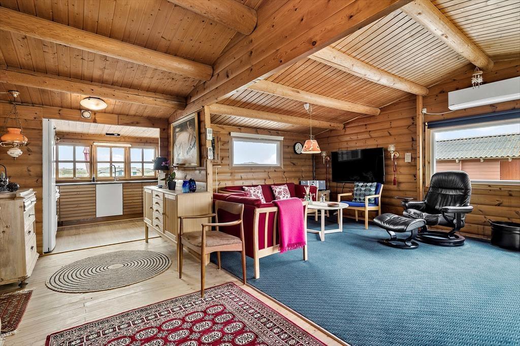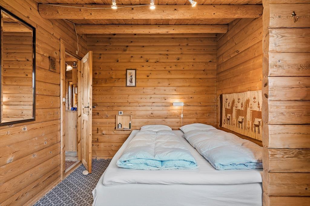 Det skønne bjælkehus emmer af charme og hyggelig stemning, og fra alle rum har I en smuk udsigt til den omkringliggende natur. Udsigten kan især nydes fra spisebordet i stuen. Her åbenbarer vinduespartier fra gulv til loft et smukt panorama, der danner bagtæppe til måltiderne, mens brændeovnen luner. Stuen byder også på et sofaarrangement, hvor aftenerne kan bruges på brætspil eller med tv’et tændt. Stuen ligger i åben forbindelse til køkkenet, der er veludstyret og har god plads til at være flere om at lave mad. Feriehusets to værelser giver sengepladser til fire personer, badeværelset er indrettet med bruseniche, og i entréen er der god plads til sko og overtøj.