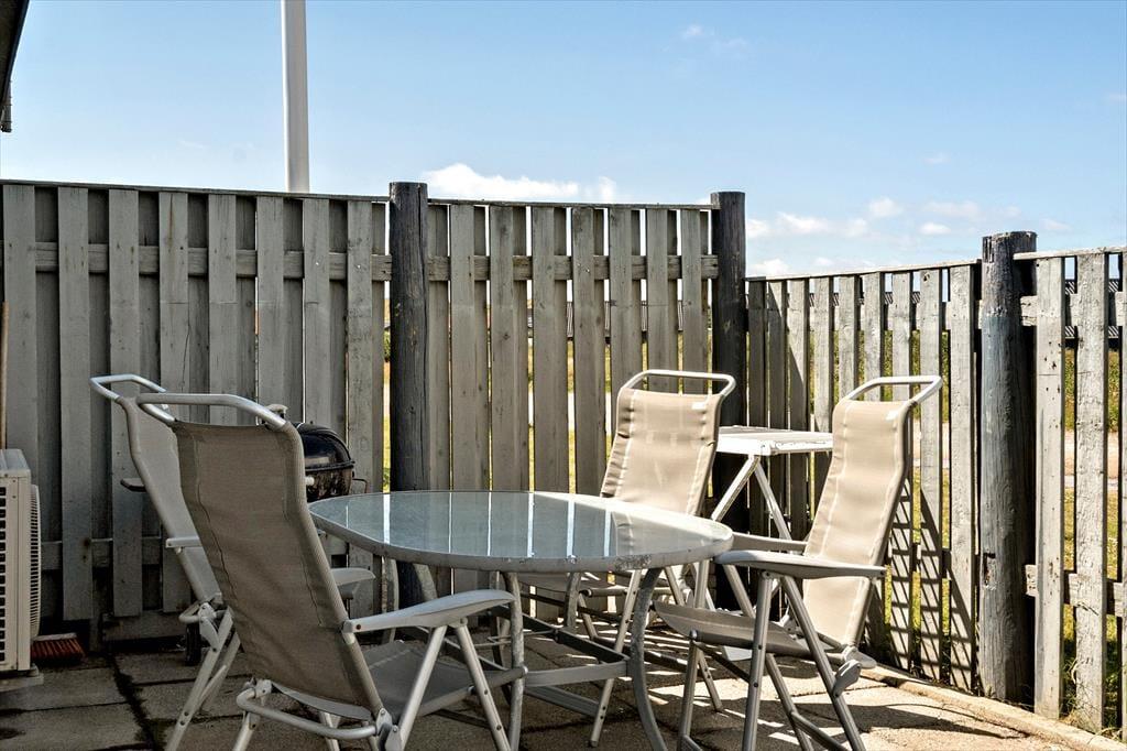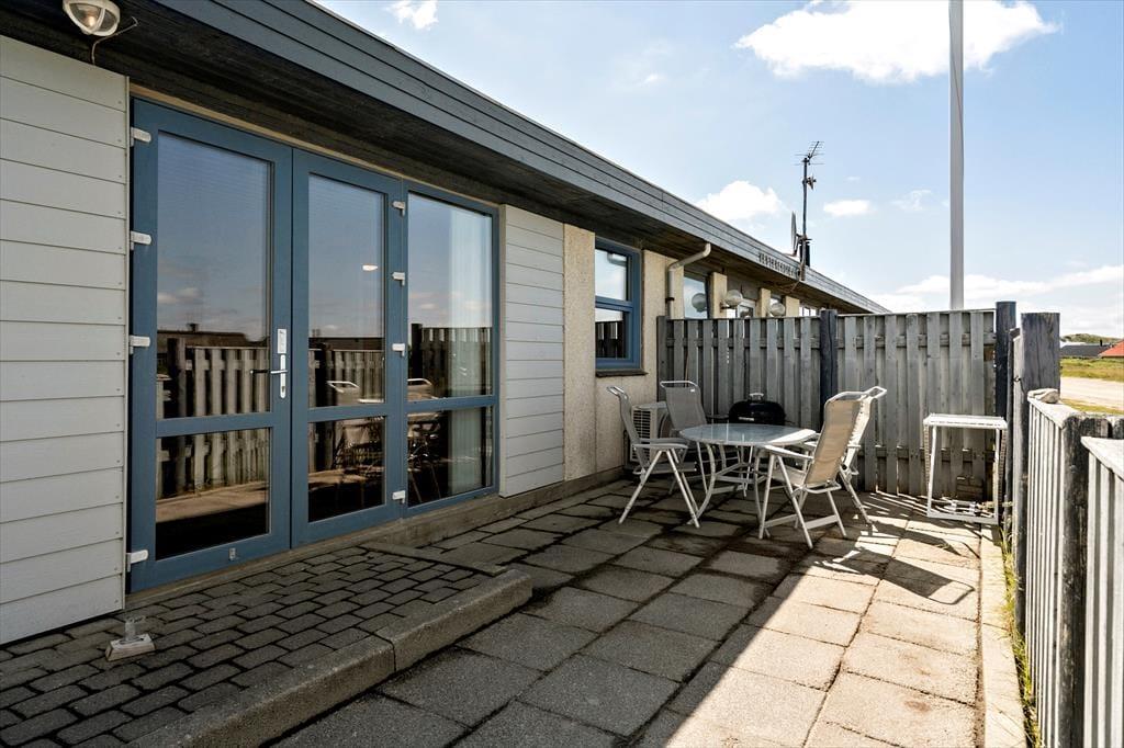 Fra stuen er der direkte adgang til et skønt terrassemiljø mod øst og nord. Når solen stiger op og farver Ringkøbing Fjord orangerød i morgengryet, er det oplagt at tage morgenkaffen med herud og nyde det smukke syn. Terrassen er også stedet, hvor I kan nyde en kølig forfriskning under åben himmel eller tænde op i grillen.