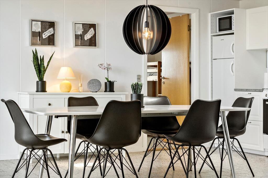 Lejligheden byder på en moderne og komfortabel indretning, og I kan glæde jer til at indtage et stort, åbent opholdsområde, hvor køkkenet og stuen glider i ét. Køkkenet er lækkert indrettet og giver god plads til at være sammen om at lave lækre retter, og takket være opvaskemaskinen slipper I for at bruge ferietiden på at vaske op. Spisebordet og sofaarrangementet giver god plads til måltider og aftenhygge, og med tv samt wi-fi er underholdningen sikret. Ovenlys og vinduespartier fra gulv til loft giver et skønt lysindfald og udsigt til naturen, og med både varmepumpe og brændeovn kommer I ikke til at fryse. De to soveværelser giver sengepladser til fem personer, og ferielejligheden fuldendes af et badeværelse med bruseniche.