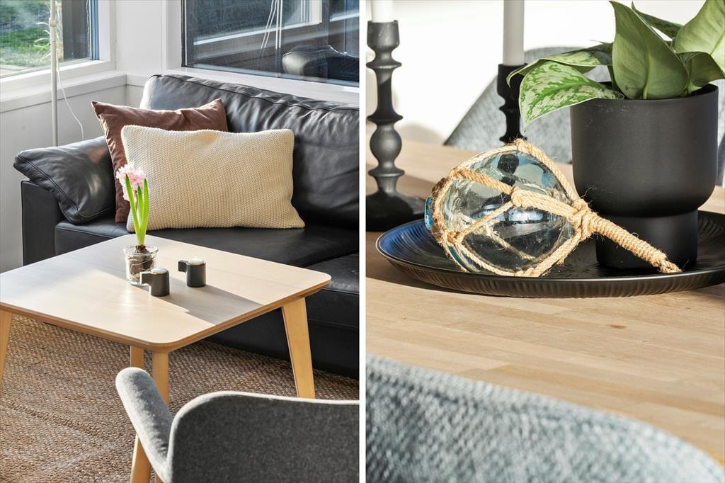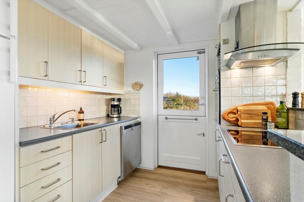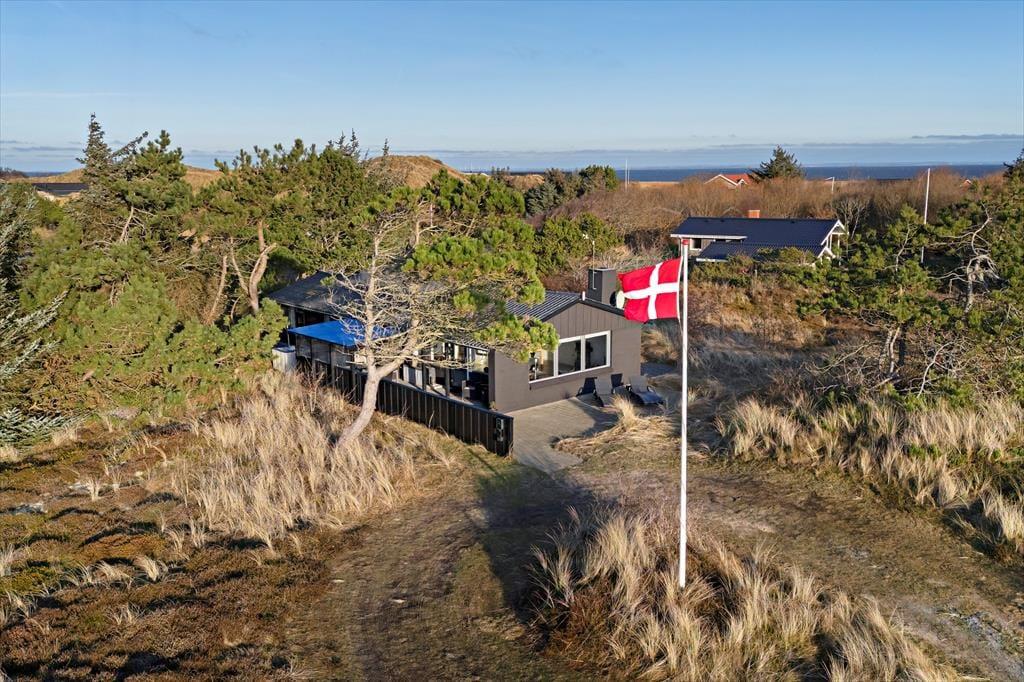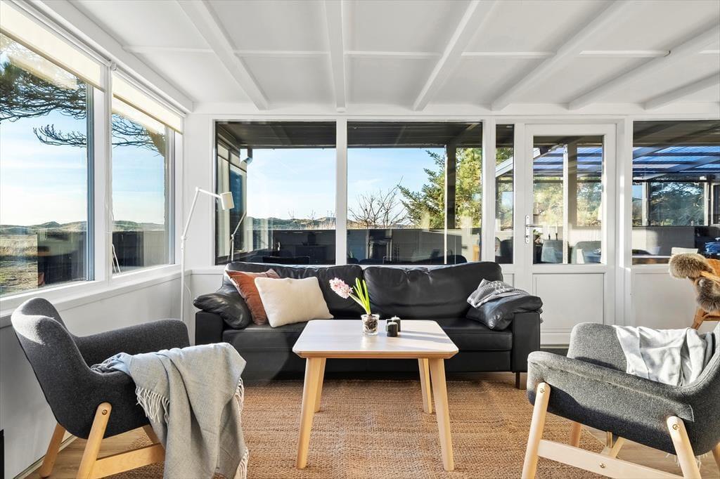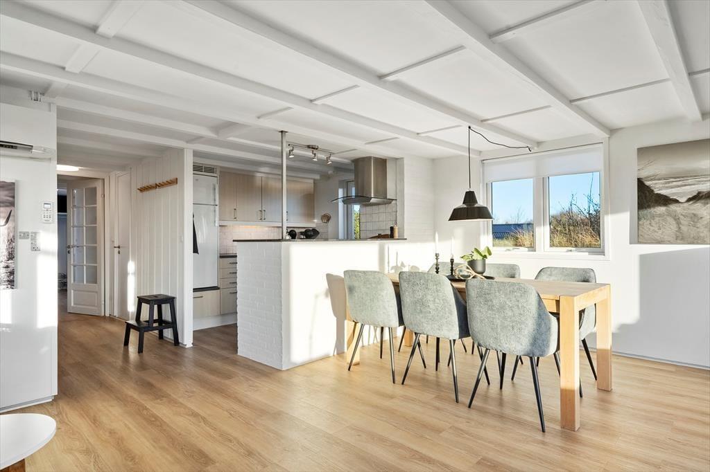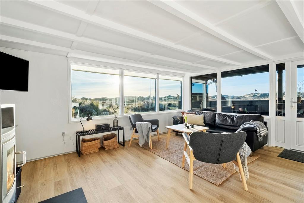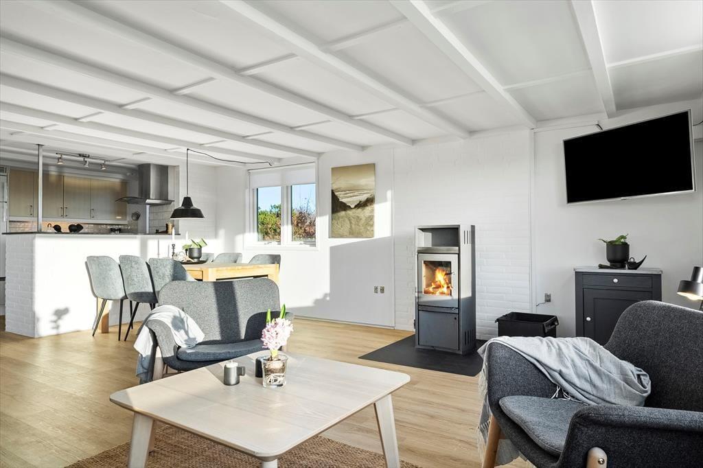Den fantastiske natur følger med indenfor via stuens store panoramavinduer, der giver jer en helt unik udsigt over klitlandskabet. På kølige dage kan I tænde op i brændeovnen eller lade varmepumpen skabe en behagelig varme, mens I nyder afslappende stunder i sofaen. Det åbne køkken gør det nemt at samles om madlavningen, og ved spisebordet kan I nyde dagens måltider med udsigt til den skønne natur.