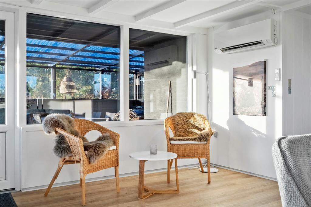 Haurvigs vidunderligt åbne landskab breder sig lige uden for vinduet, når I holder ferie i dette charmerende og indbydende sommerhus. Fra stuen kan I lade blikket glide ud over de bløde klitter og de fredelige marker, hvor heste går og græsser, mens Ringkøbing Fjord og den idylliske Vinterleje Havn kun ligger få hundrede meter væk.