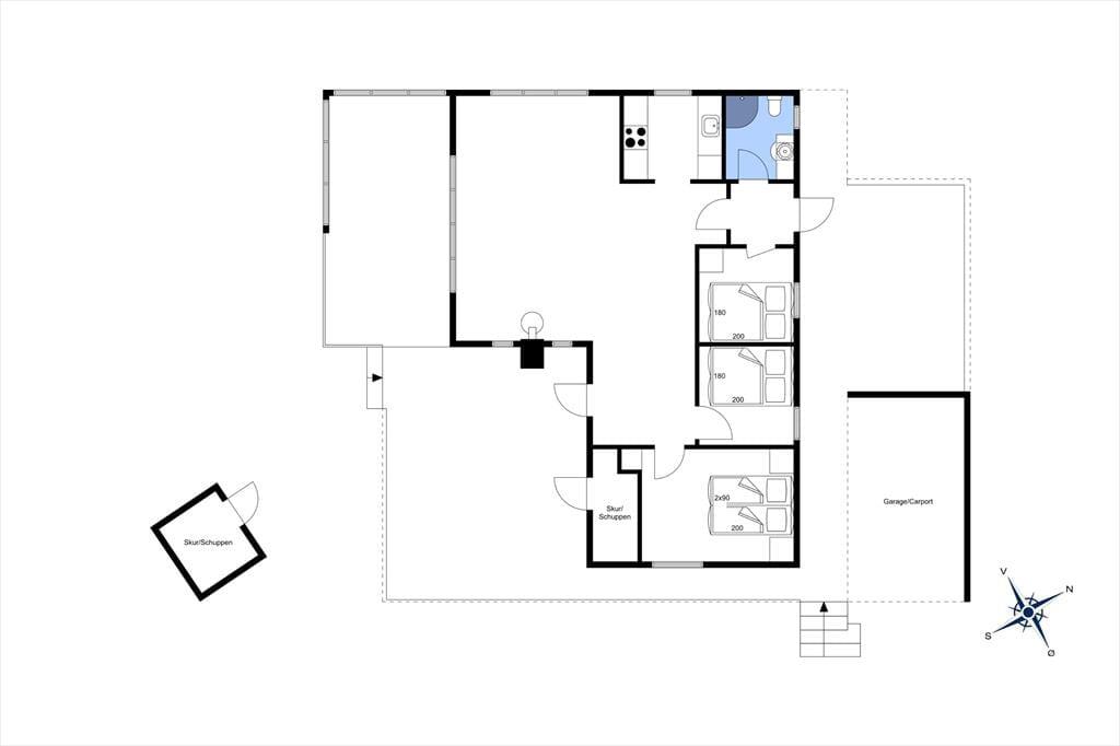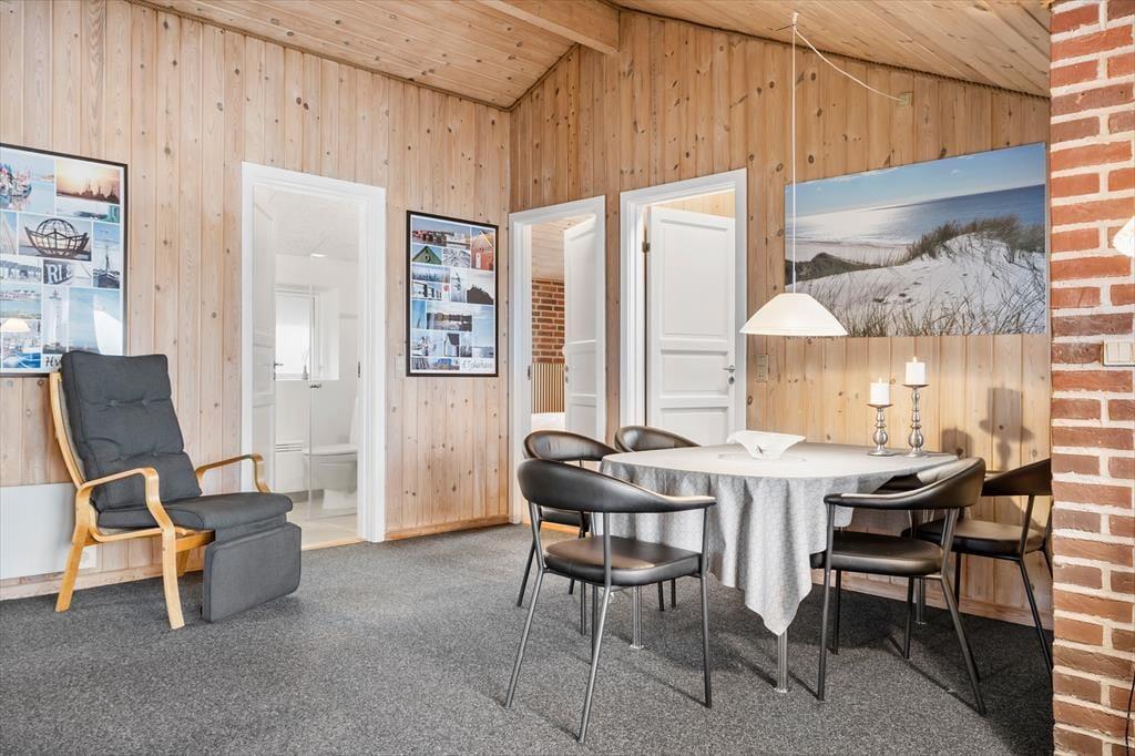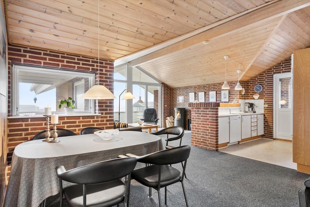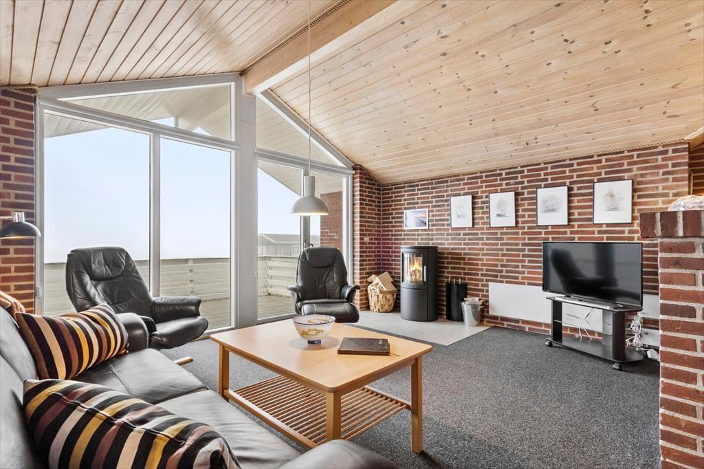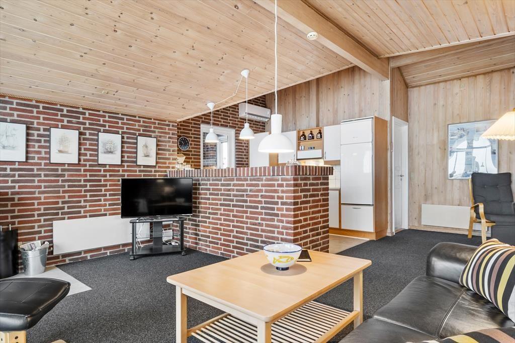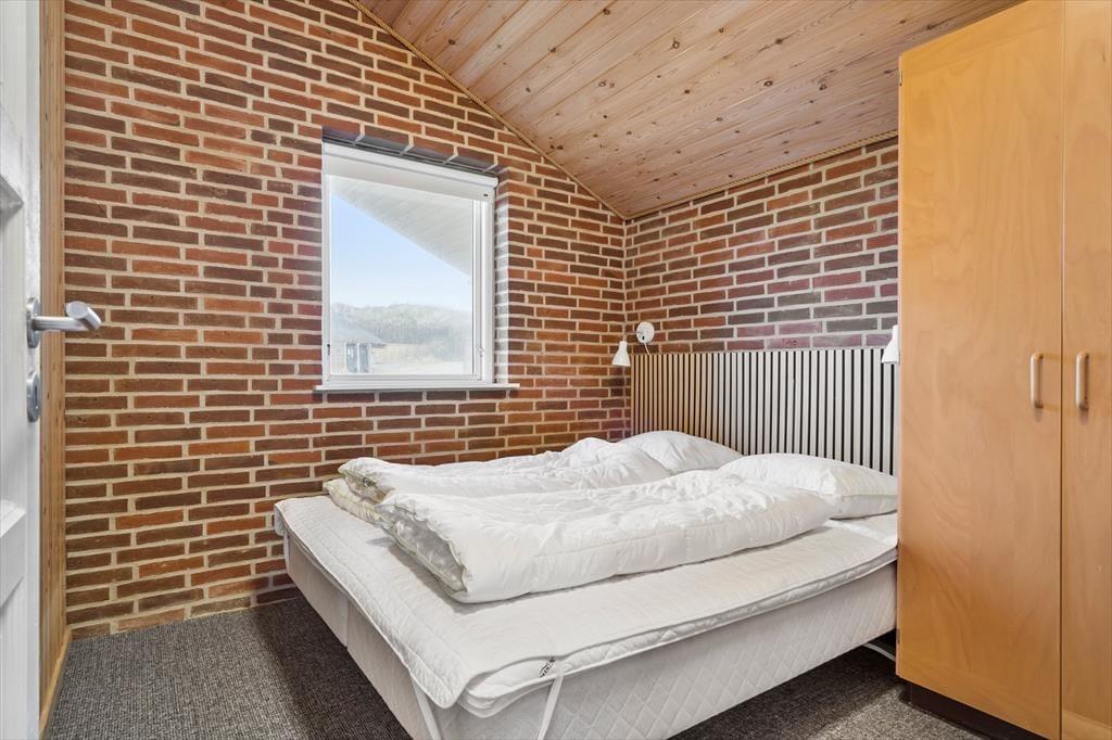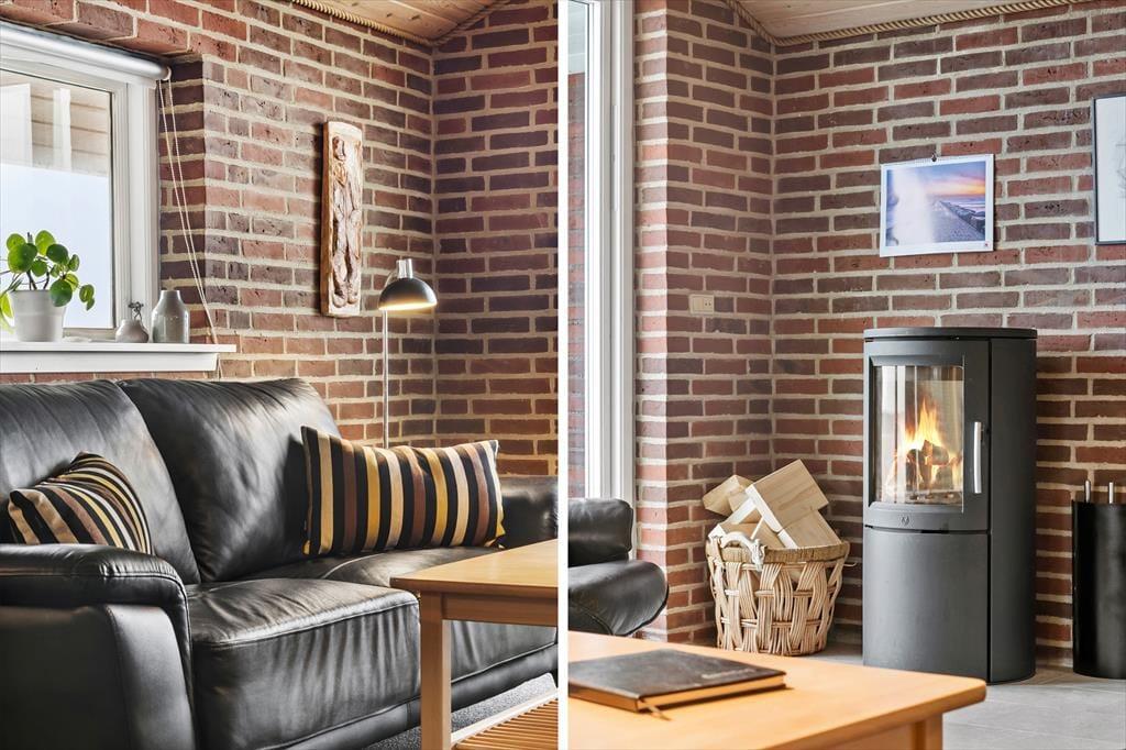 Feriehuset byder på tre store værelser, som tilsammen giver sengepladser til seks personer. I entréen er der god plads til sko, støvler og overtøj, og her er ligeledes en vaskemaskine samt praktisk fralægningsplads. Flisebadeværelset er indrettet med bruseniche, og med den tilstødende sauna får feriedagene wellness-faktor. Resten af ferieboligen består af opholdsafdelingen, der er opvarmet med en varmepumpe og en brændeovn. Det tosidede køkken giver god plads til at være flere kokke om at lave mad, og opvaskemaskinen gør rengøringen nem og bekvem. Retterne serveres let ved spisebordet, hvor I også har god plads til at spille brætspil eller planlægge morgendagens udflugter. Ved brændeovnen findes et sofaarrangement, hvor I kan se film eller læse den seneste krimi, men I kan selvfølgelig også nyde udsigten gennem det vestvendte vinduesparti til klitheden og “havbjergene” mod vest.