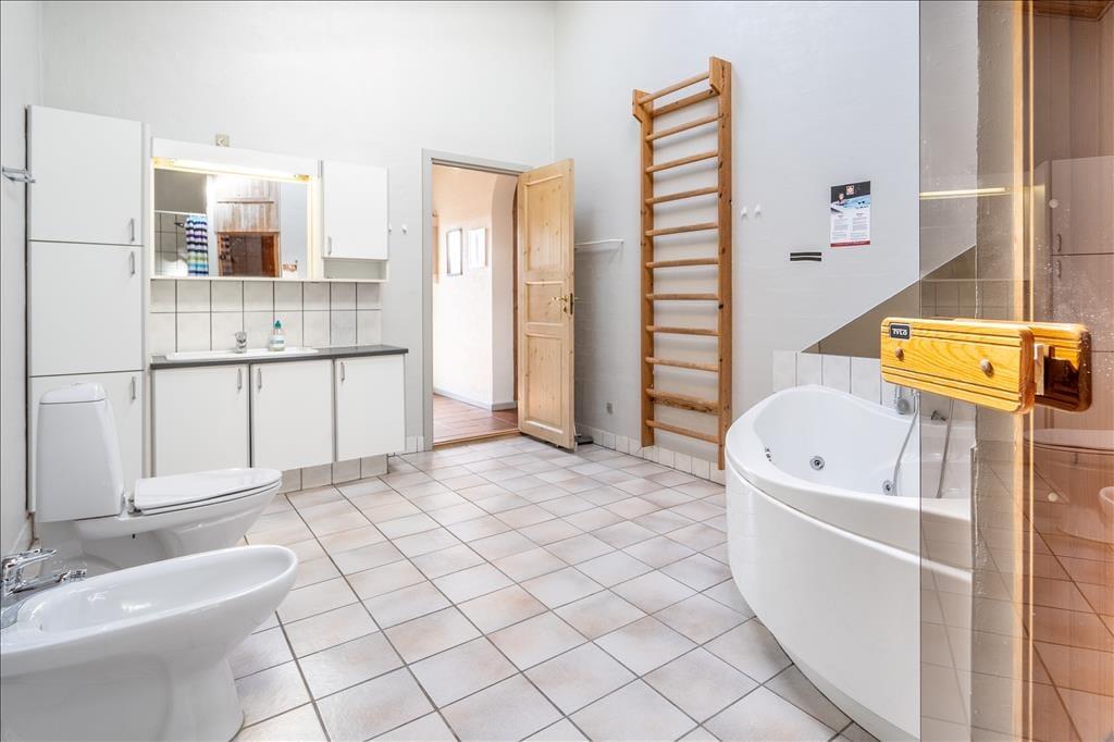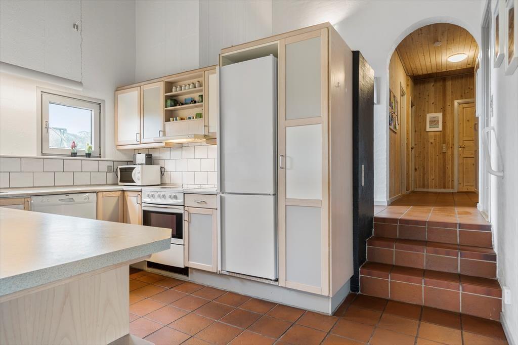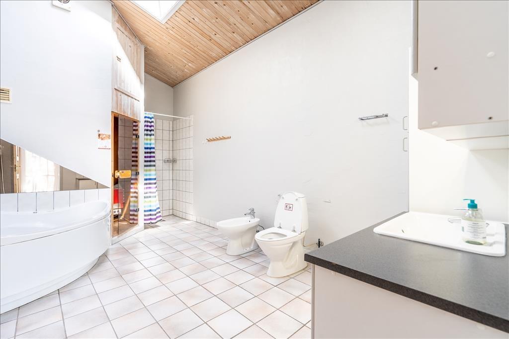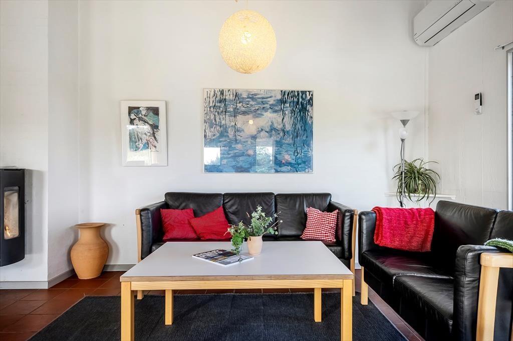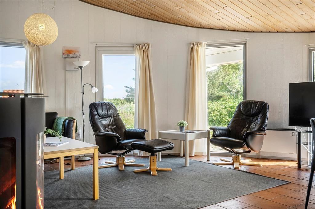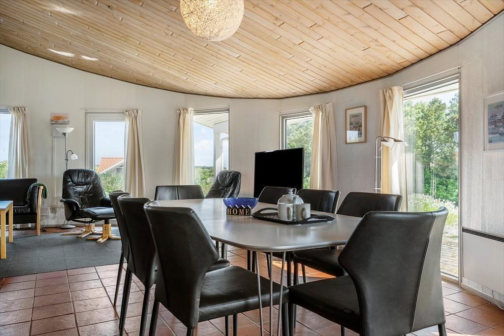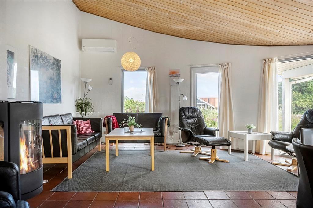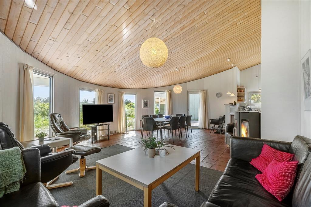 Huset byder på fire store soveværelser, som tilsammen giver sengepladser til otte personer. Det ene værelse har derudover en hems, hvor de yngste kan læse bøger eller se serier på tabletten via feriehusets wi-fi. Badeværelset er rummeligt og indrettet med bruseniche, sauna og et spabad, og planløsningen byder ligeledes på et gæstetoilet med vaskesøjle. Resten af ferieboligen består af opholdsafdelingen, hvor køkkenet og stuen glider i ét. Det veludstyrede køkken giver god plads til at være sammen om at lave mad, og opvaskemaskinen gør rengøringen nem. Retterne serveres let ved det store spisebord i stuen, hvor der også er et sofaarrangement med tv. Brændeovnen og varmepumpen sørger for en behagelig atmosfære, og rummets udformning i et cirkelslag med mange vinduer giver et skønt lysindfald.