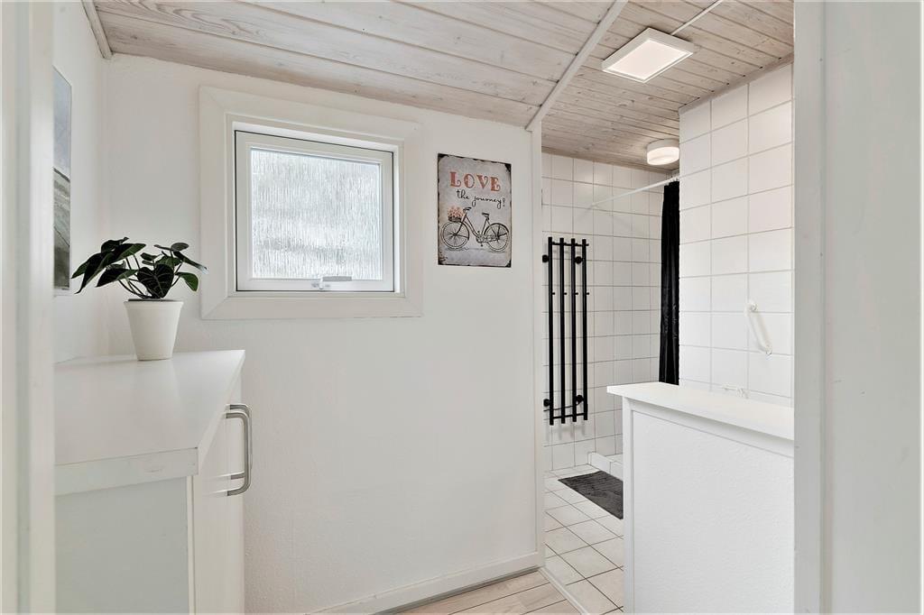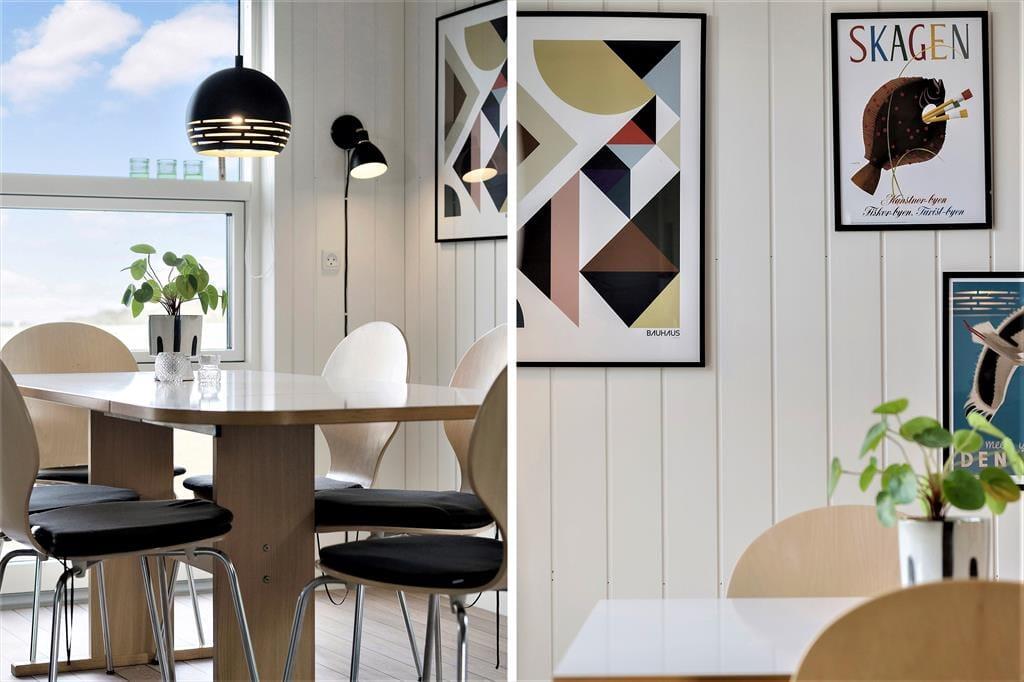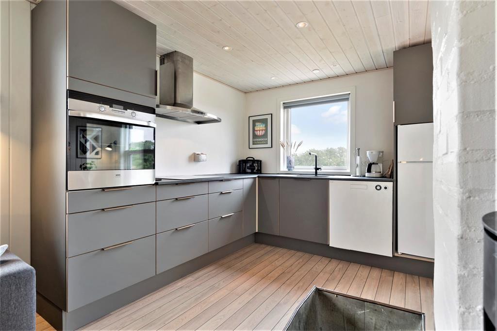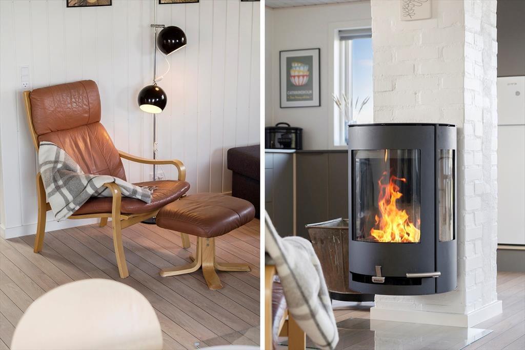 Feriehuset er lyst og venligt indrettet, og i opholdsafdelingen ligger køkkenet og stuen i åben forbindelse. Køkkenet er veludrustet og har god plads til, at I kan være flere kokke om madlavningen, og opvaskemaskinen gør den efterfølgende afrydning nem og bekvem. Stuen er indrettet med et spisebord og et sofaarrangement, og her har I god plads til at hygge med lækre måltider, gode film eller en bog og en varm kop te, mens ilden knitrer i brændeovnen. Huset byder på to gode soveværelser med i alt fire sengepladser, og badeværelset er indrettet med bruseniche og gulvvarme.