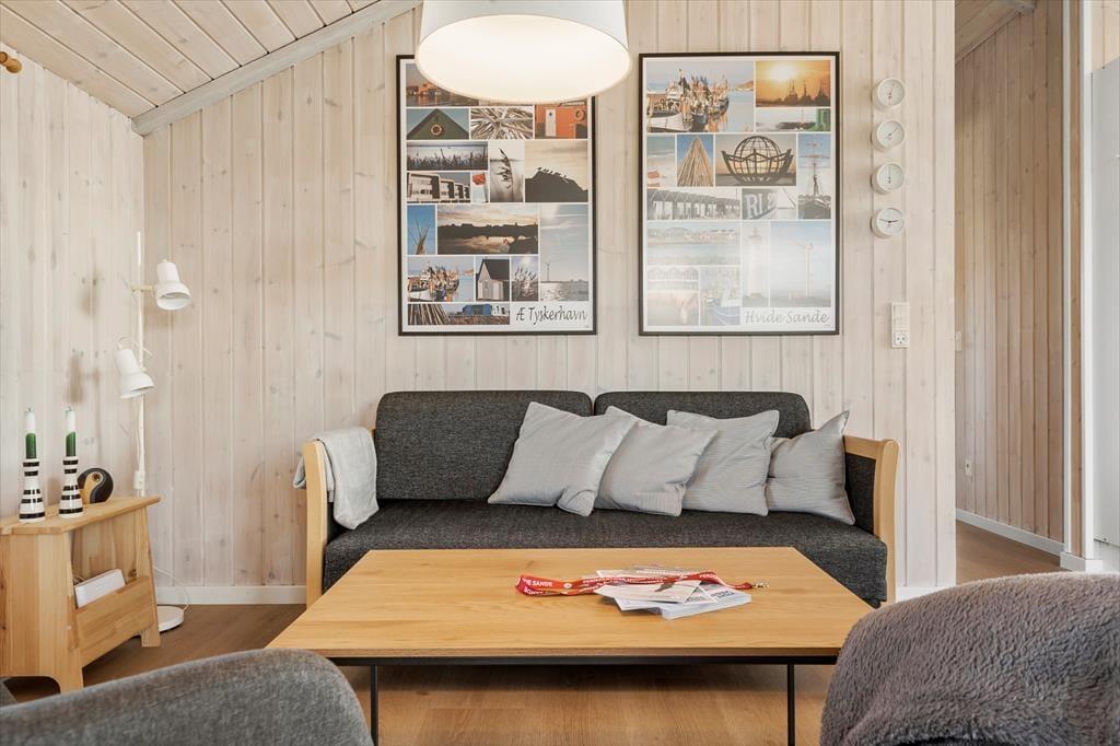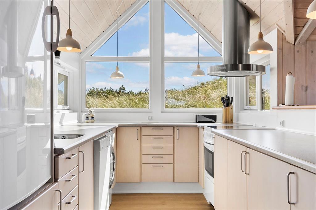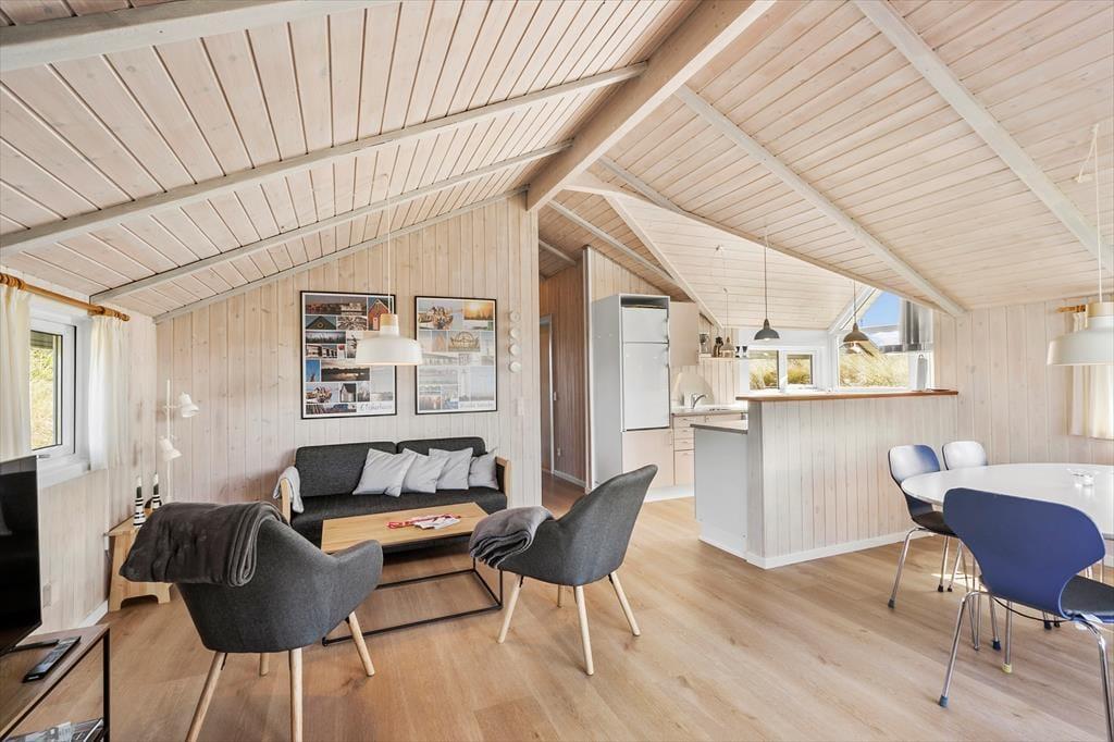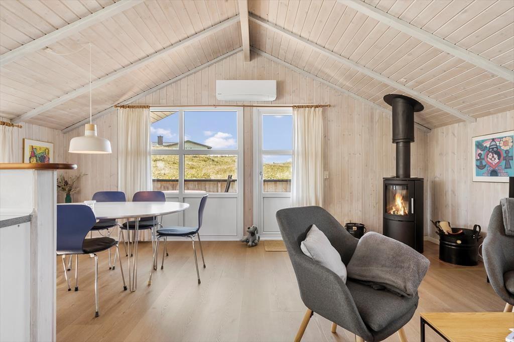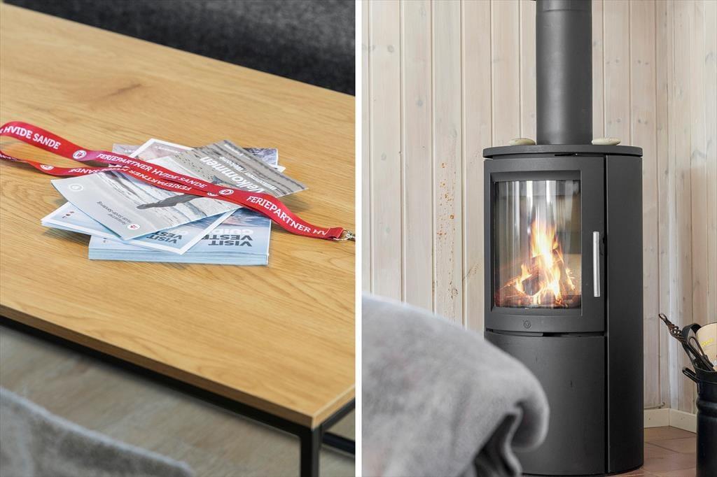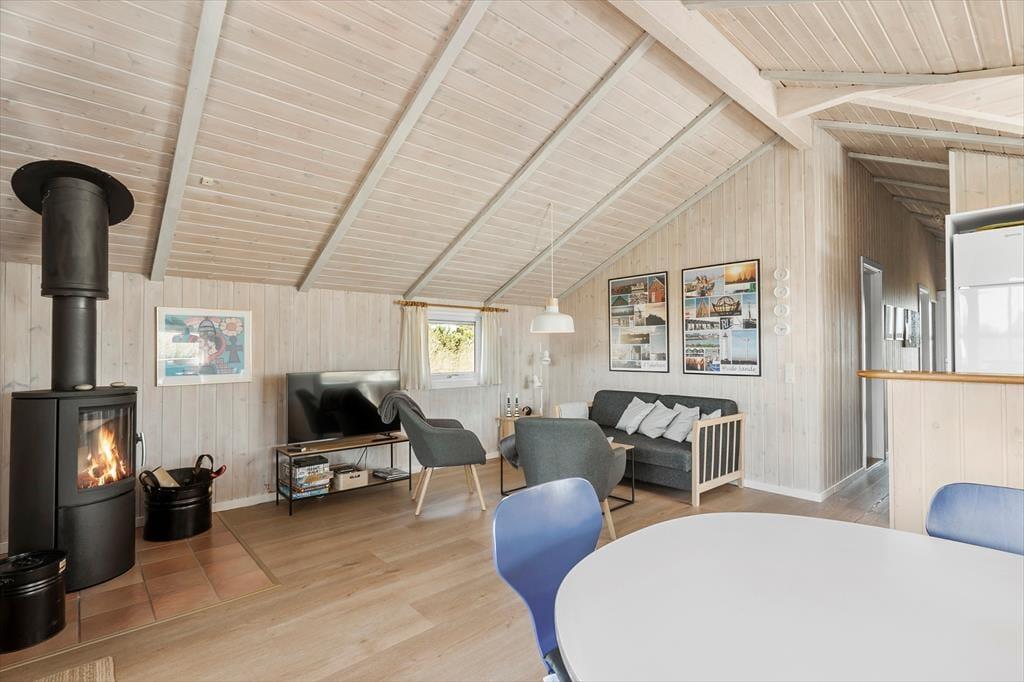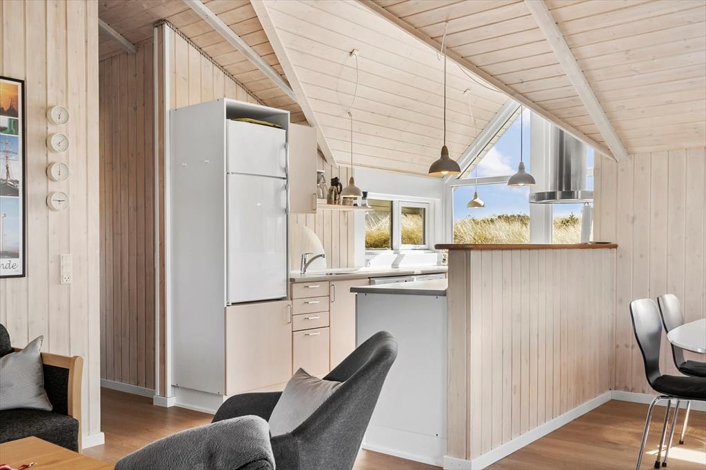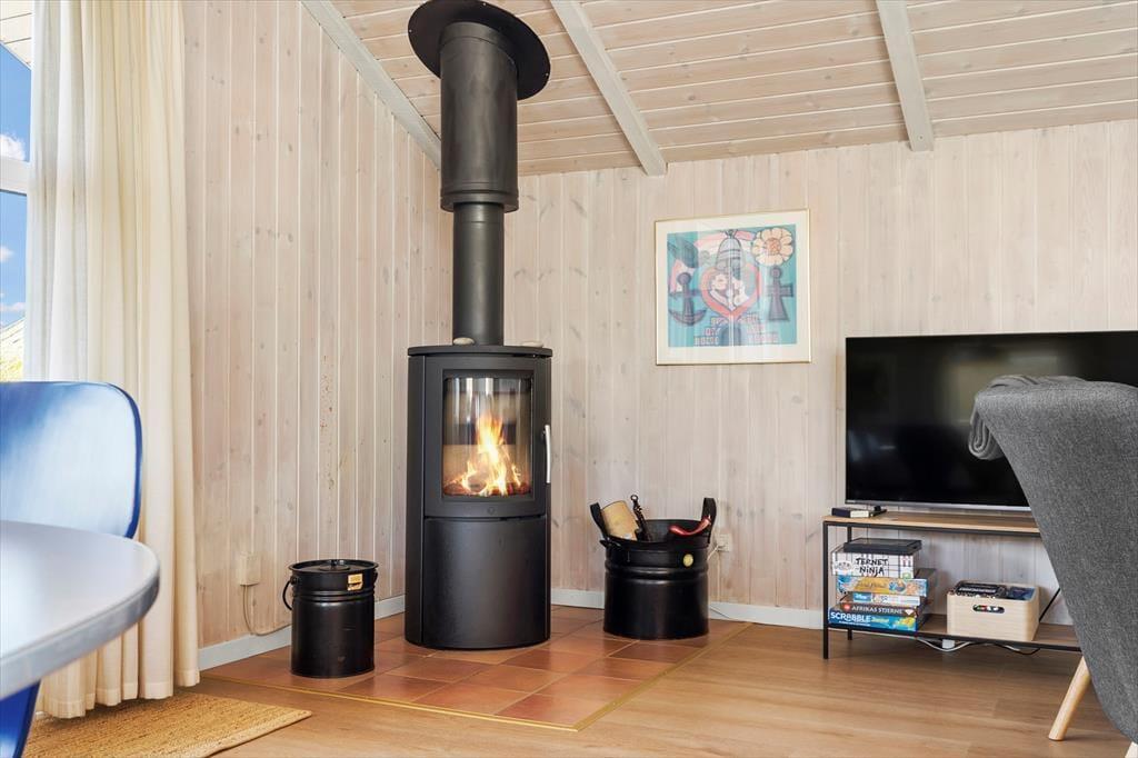 Saunaen og de naturskønne omgivelser er ikke det eneste, der giver huset den helt rette feriestemning, for også stuens brændeovn, det komfortable møblement, kiploftet og væggenes lyse træbeklædning bidrager til det hyggelige helhedsindtryk. Hvis du kan lide at lave mad, vil du blive begejstret for arbejdsforholdene i det åbne køkken: Her er der alt, hvad du skal bruge for at trylle noget lækkert frem, og så kan du endda se lige ud på den fri natur og nyde det smukke indfaldslys, som karnappen giver. Trænger du til at slappe af i sofaen, er der parabol-tv med danske og mange tyske kanaler, og hvis du hellere vil tage en bog med ud i det fri, giver havedøren dig direkte adgang til terrassen.