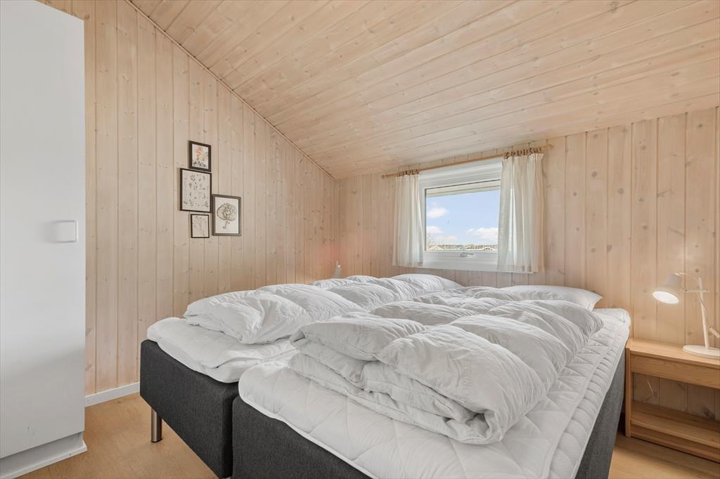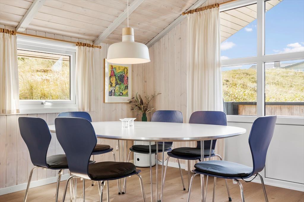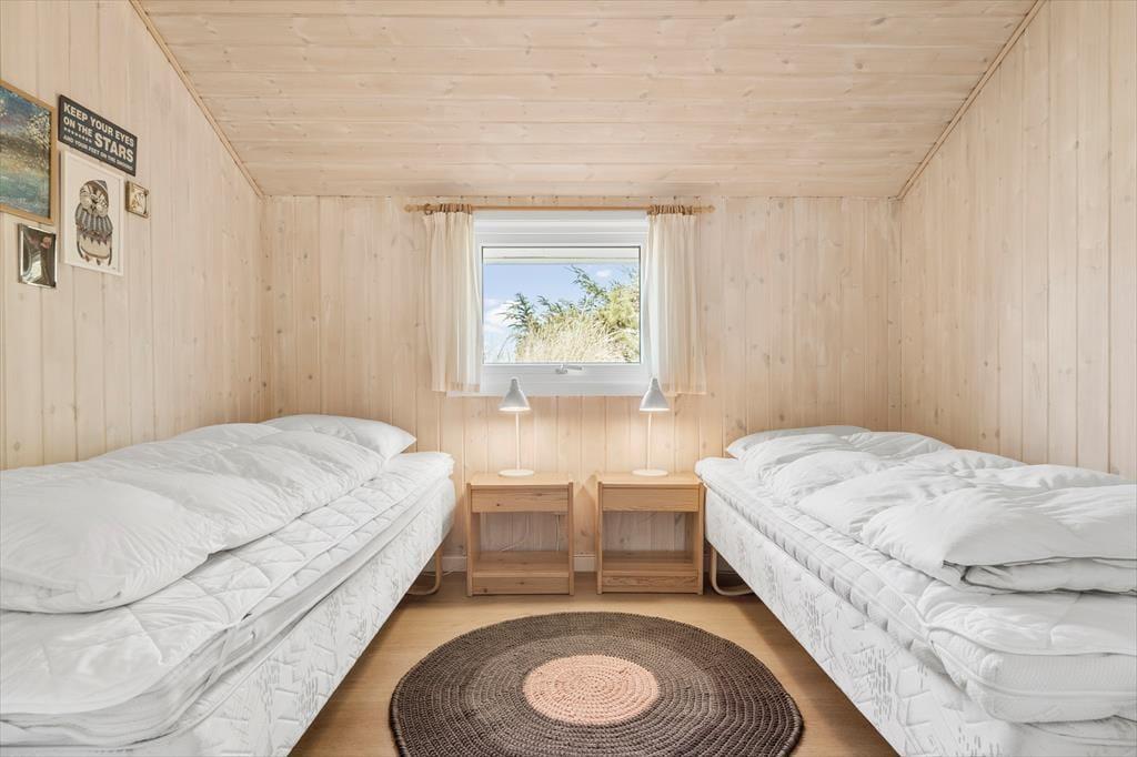 Dette fine sommerhus har en skøn beliggenhed på den lukkede Baunebjergvej i Haurvig. Fra både stuen, køkkenet og terrassen kan du nyde udsigten til områdets klitter og lillafarvede lyng – når du altså ikke slapper af i husets sauna eller sover længe på et af de tre soveværelser.