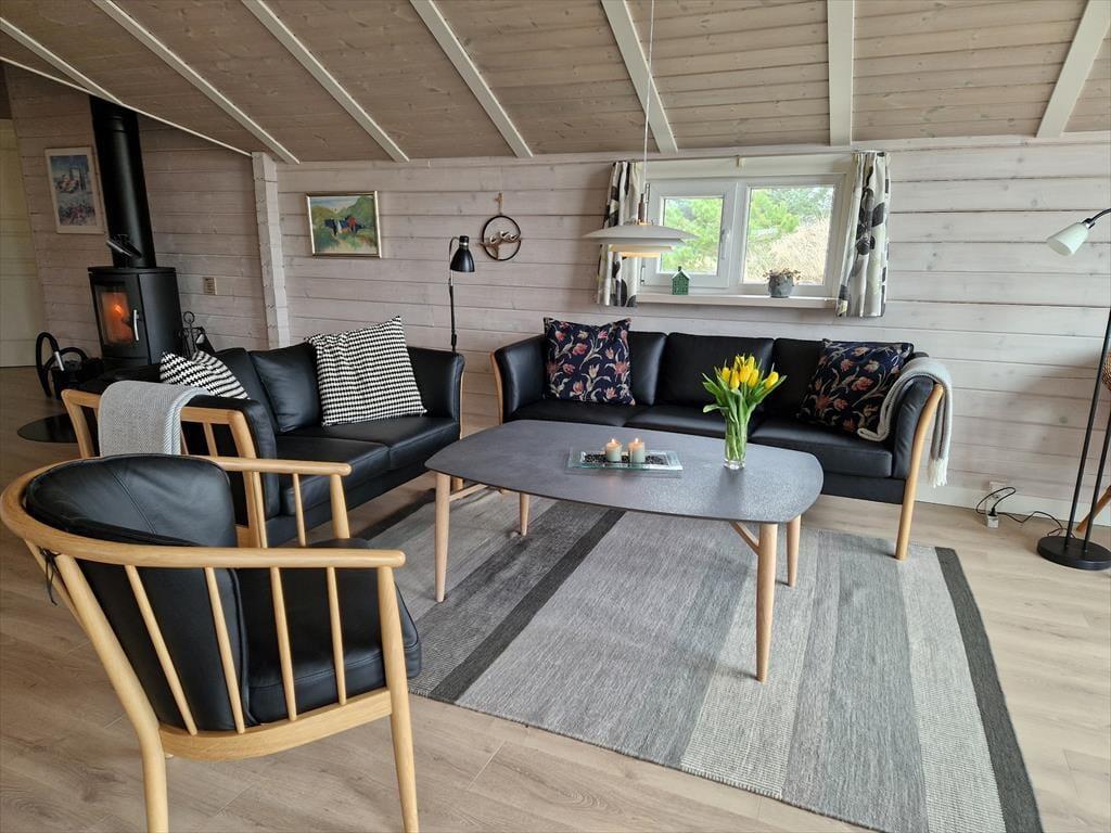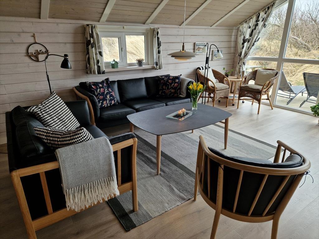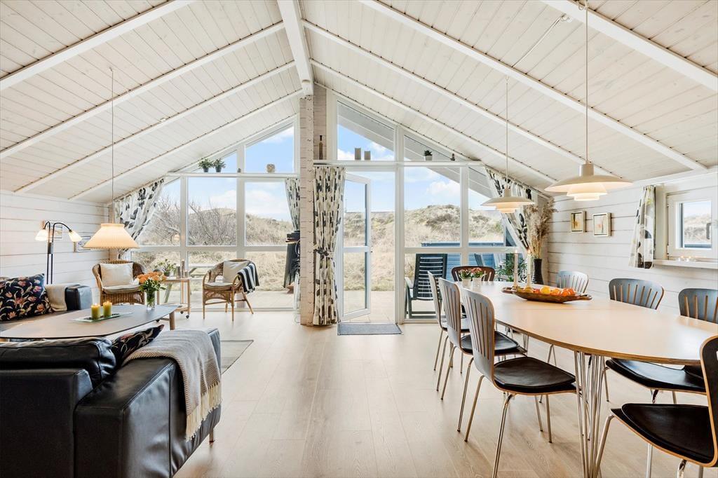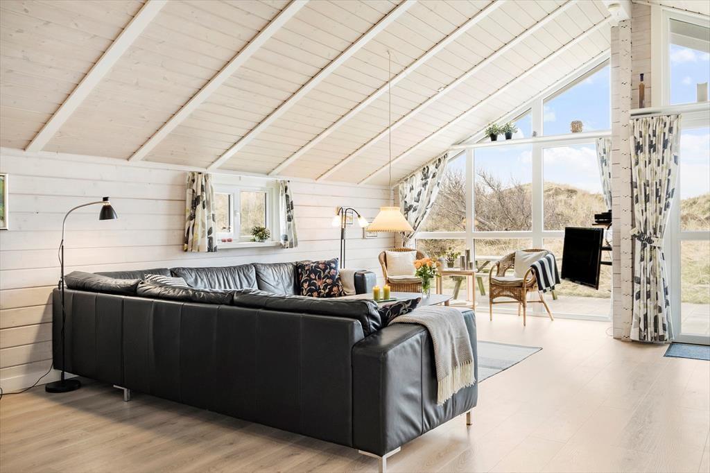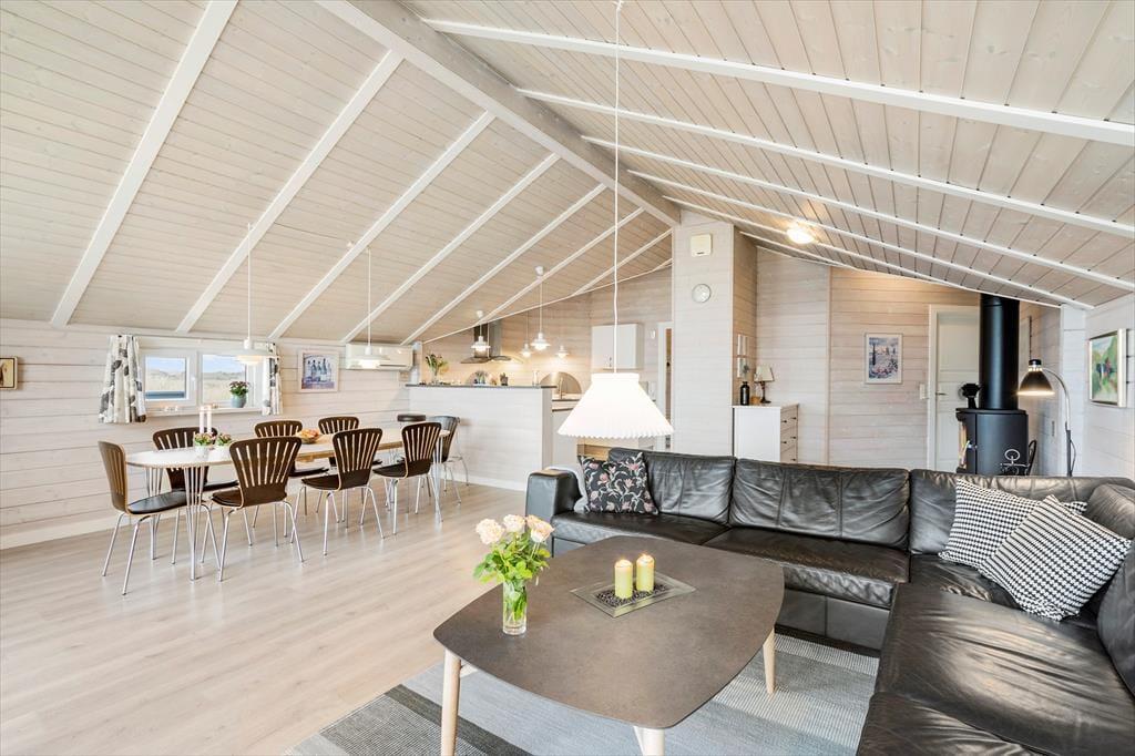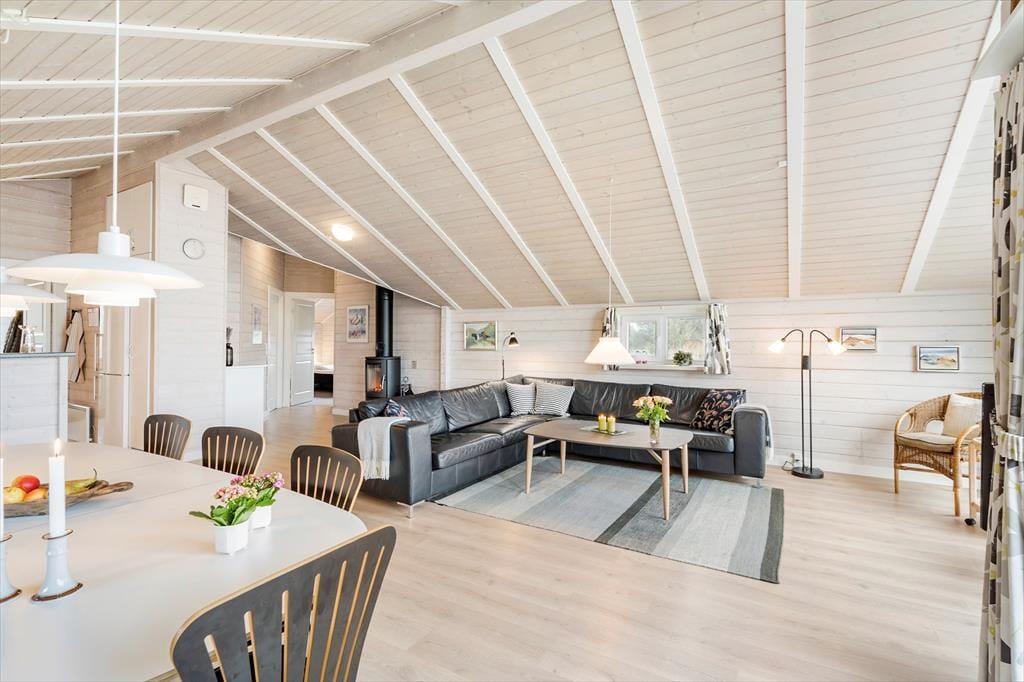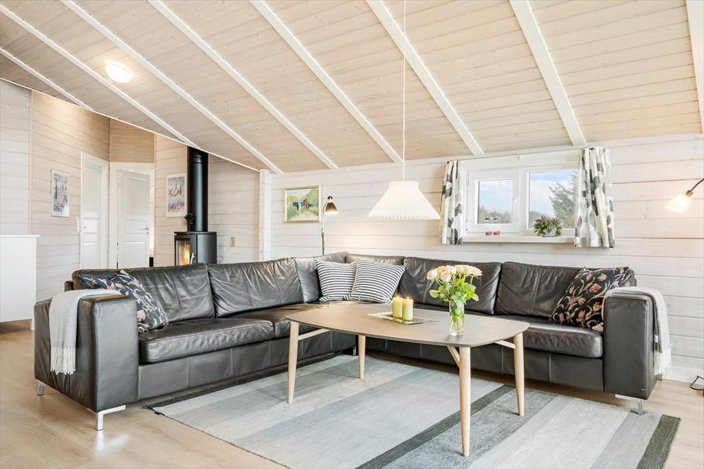 Huset byder på en lys og luftig atmosfære, og med fire soveværelser er her sengepladser til otte personer. Jeres feriedage får masser af wellness-faktor, for i det store badeværelse har I både et stort spabad samt en sauna. Entréen har god plads til sko og overtøj, og som en fin detalje byder gæstetoilettet på en vaskesøjle, så I kan få vasket i løbet af ferien. Resten af huset består af et stort, åbent opholdsområde, hvor loft til kip og sydvendte vinduespartier fra gulv til loft giver en skøn atmosfære. I det veludrustede køkken har I god plads til at være flere om at lave mad, og retterne serveres let ved spisebordet, mens opvaskemaskinen klarer rengøringen. Sofaarrangementet er stedet, hvor I kan se en god film eller læse en god bog, mens brændeovnen og varmepumpen holder temperaturen behagelig.