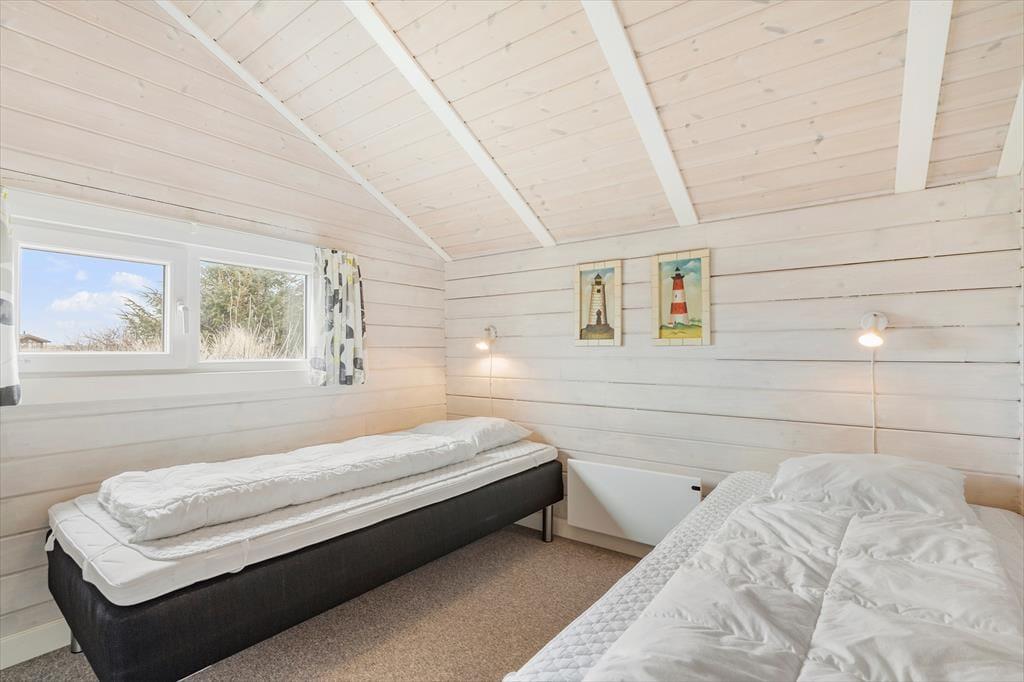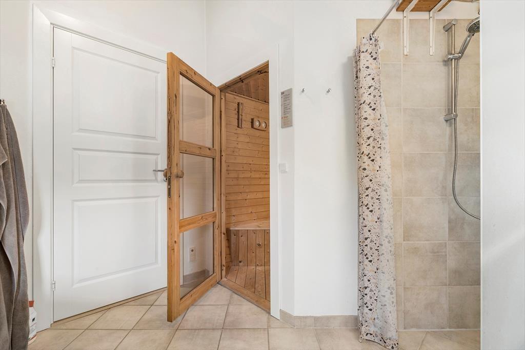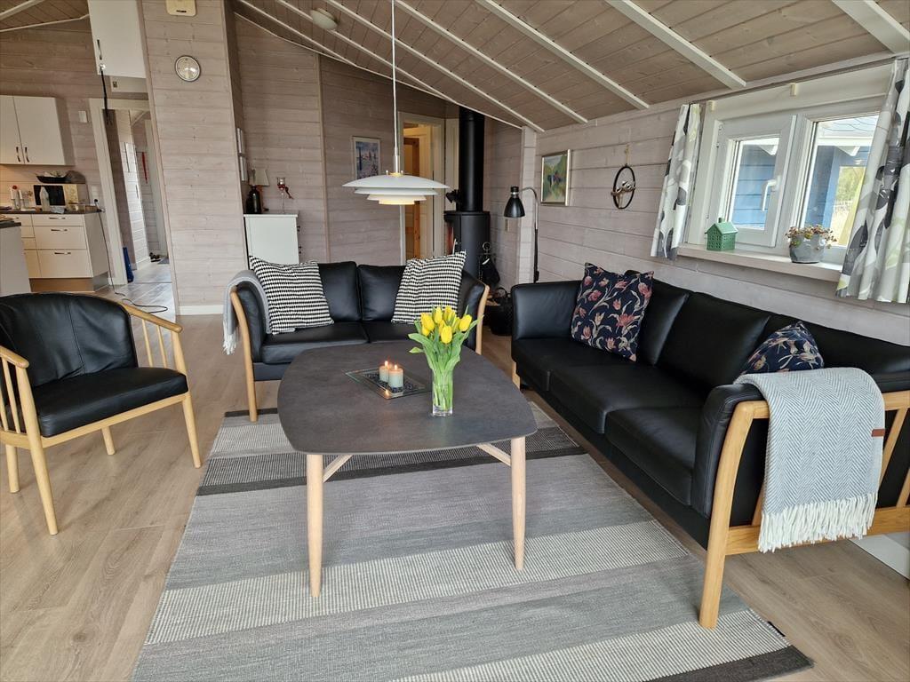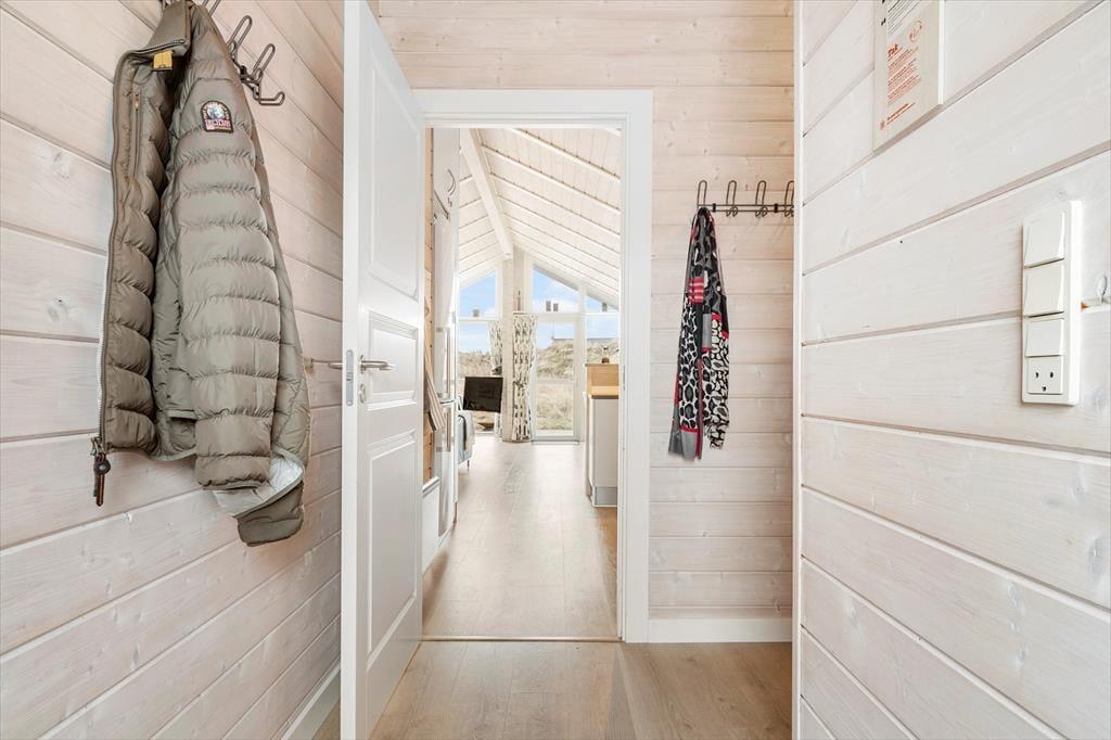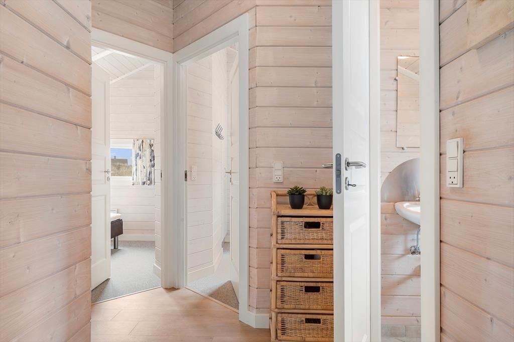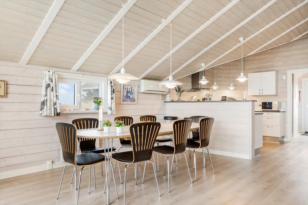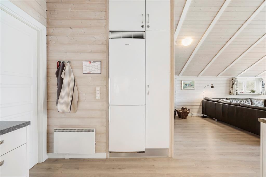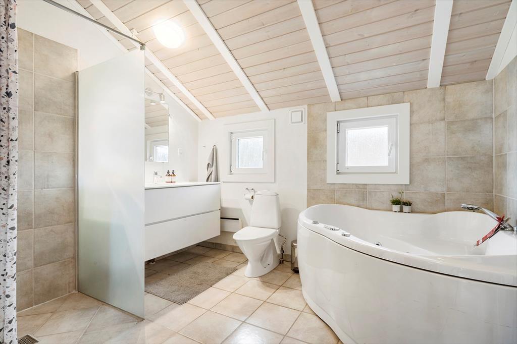 Huset byder på en lys og luftig atmosfære, og med fire soveværelser er her sengepladser til otte personer. Jeres feriedage får masser af wellness-faktor, for i det store badeværelse har I både et stort spabad samt en sauna. Entréen har god plads til sko og overtøj, og som en fin detalje byder gæstetoilettet på en vaskesøjle, så I kan få vasket i løbet af ferien. Resten af huset består af et stort, åbent opholdsområde, hvor loft til kip og sydvendte vinduespartier fra gulv til loft giver en skøn atmosfære. I det veludrustede køkken har I god plads til at være flere om at lave mad, og retterne serveres let ved spisebordet, mens opvaskemaskinen klarer rengøringen. Sofaarrangementet er stedet, hvor I kan se en god film eller læse en god bog, mens brændeovnen og varmepumpen holder temperaturen behagelig.