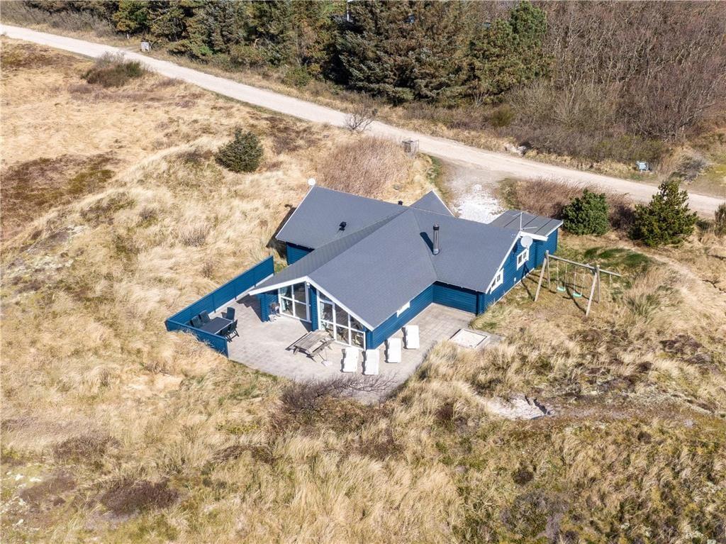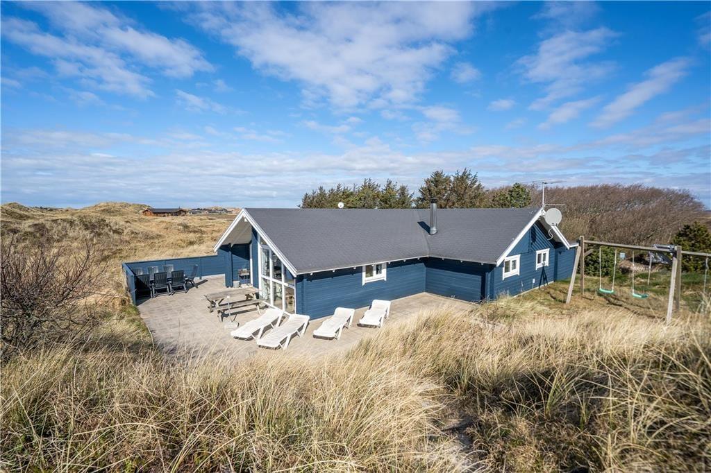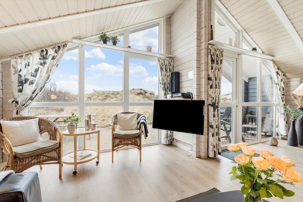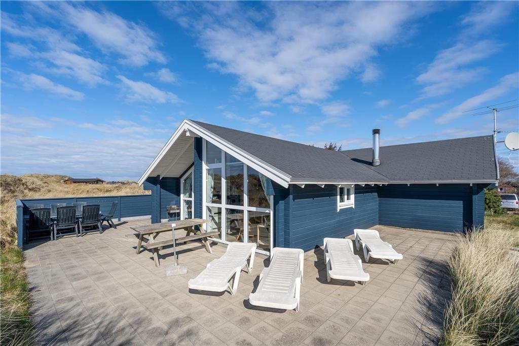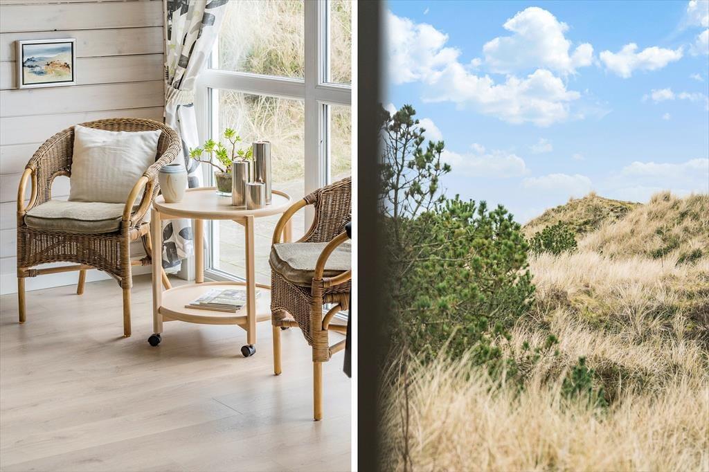 Fra stuen er der direkte adgang til et skønt terrassemiljø, der smyger sig om huset mod øst, syd og vest. Her kan I nyde sommerens sol fra morgen til aften, og det omkringliggende klitlandskab giver god læ for brisen, uanset om I slapper af i liggestolene eller nyder et godt glas vin og lækker mad fra grillen ved terrassebordet.