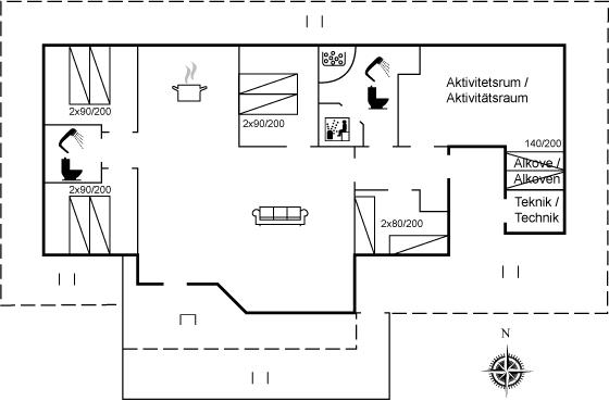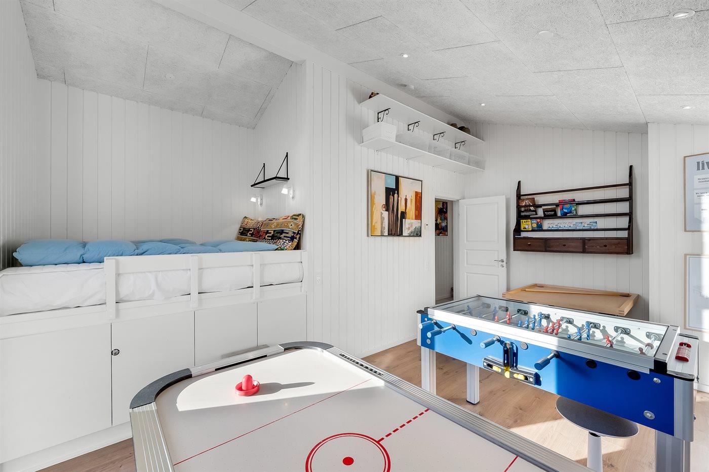 Glæd dig/jer til at svinge benene op foran den knitrende brændeovn med et godt glas vin i hånden, mens børnene spiller bordfodbold inde i aktivitetsrummet eller hygger sig med et brætspil i stuen. Efter en hyggelig middag, kan du nyde de varme bobler fra spabadet eller lade dig blive varmet rigtigt godt igennem i den store sauna. Et hus hvor du undgår kø foran badeværelset, da huset byder på to badeværelser til de op til 10 feriegæster. Huset har 4 soveværelser, 3 med dobbeltsenge, 1 med 2 enkeltsenge. Huset råder desuden også over en alkove med 2 sovepladser i aktivitetsrummet.