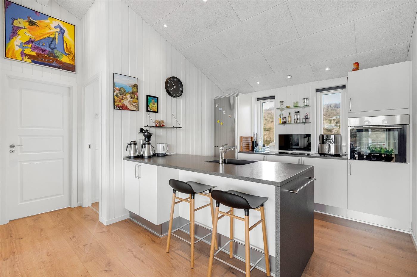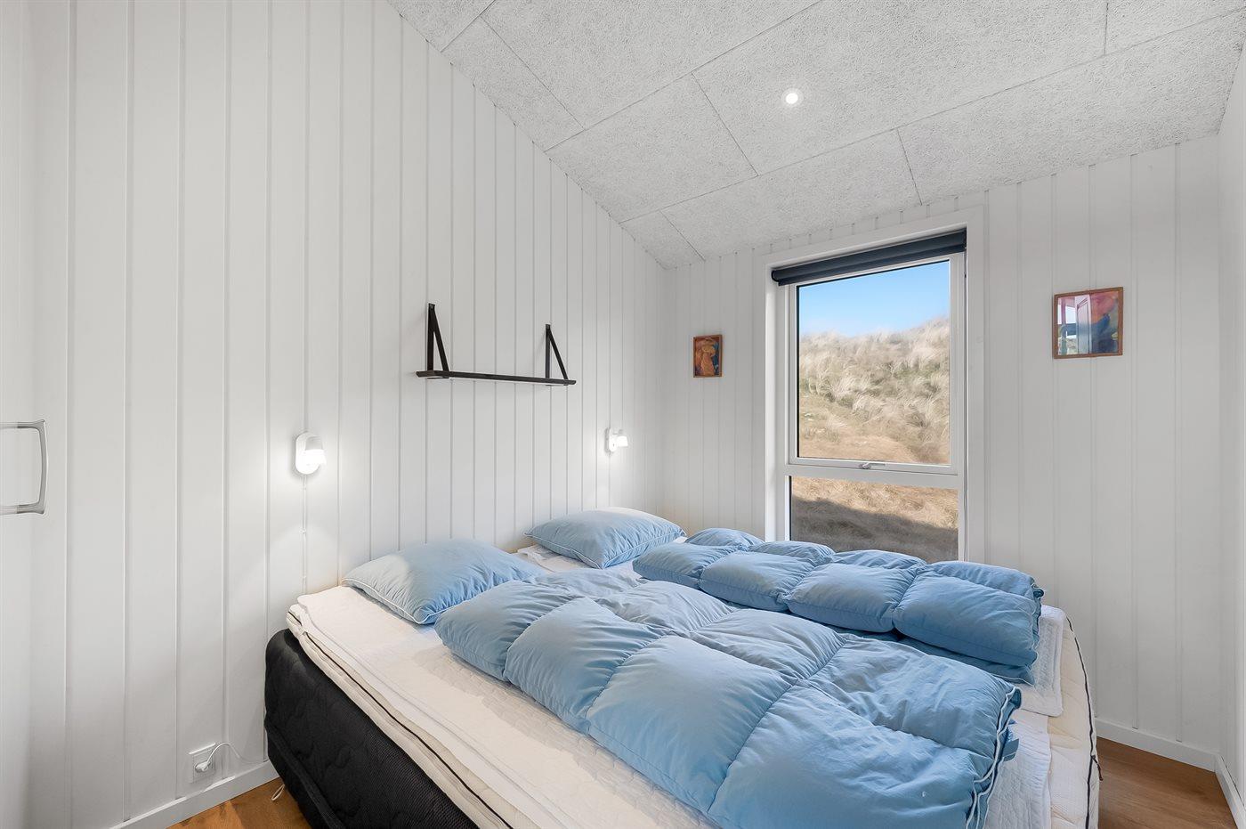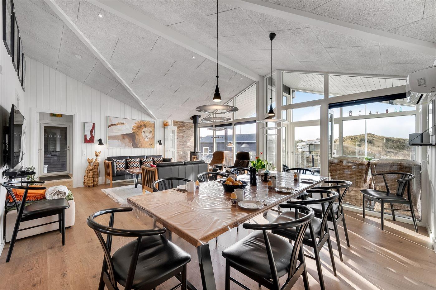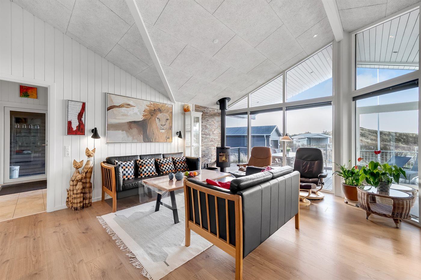 Dette feriehus ligger på Tornbjerrevej i Haurvig, på en skøn naturgrund mellem hav og fjord og med udsigt fra grunden til Ringkøbing Fjord og lyngbeklædte klitter. Der er sågar egen klit lige i "baghaven". Et hus med flot og moderne indretning. Vægge og lofter er hvidmalede, og sammen med de store vinduer skabes en indbydende og lys atmosfære i huset.