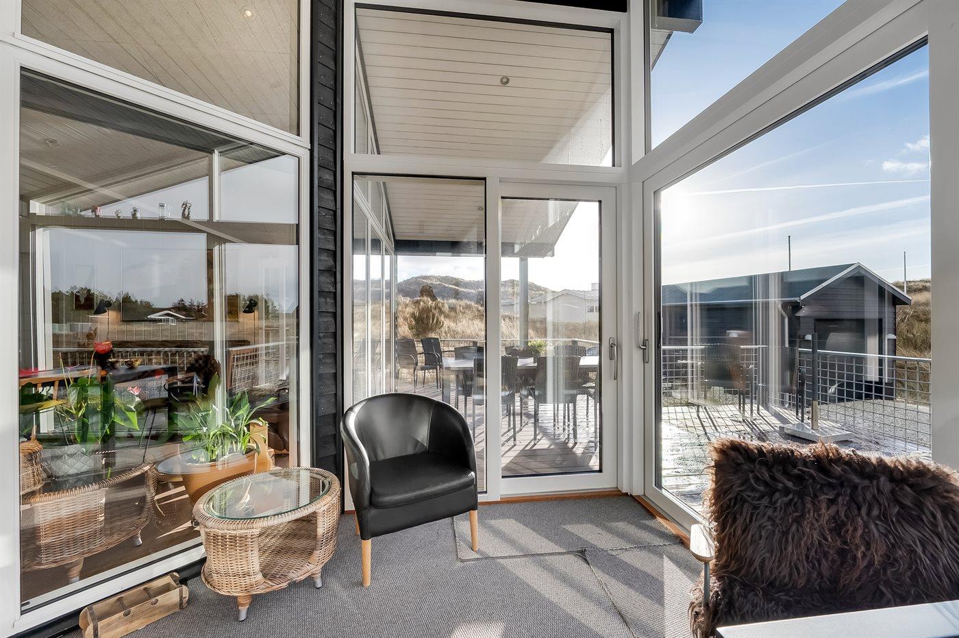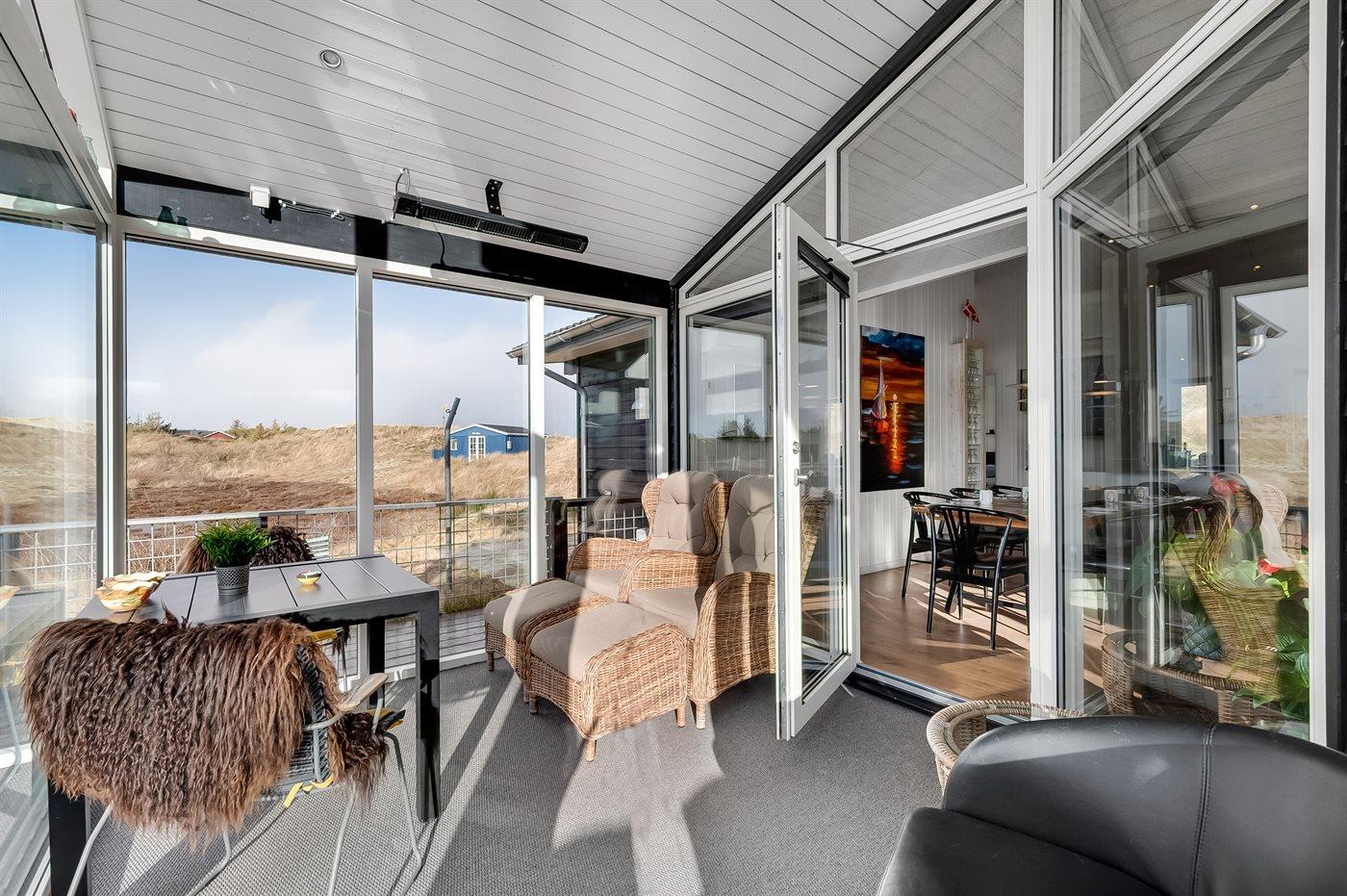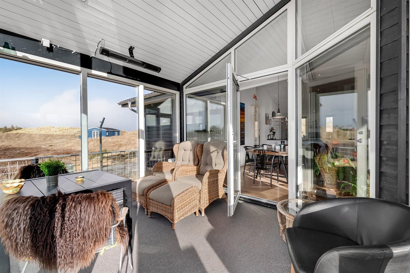 Feriehusets wellness faktor afrundes med den skønne store overdækkede terrasse mod syd/vest, der nærmest fungerer som en åben havestue. Her kan du lade batterierne op, mens familiens sande grillmester kan vise sine evner på alle årstider, til udsigten af klitter og lyng. På terrassen findes der naturligvis også både gode havemøbler, liggestole samt grill.