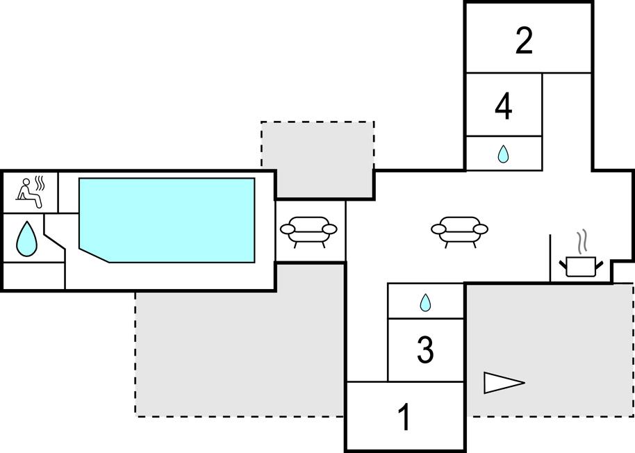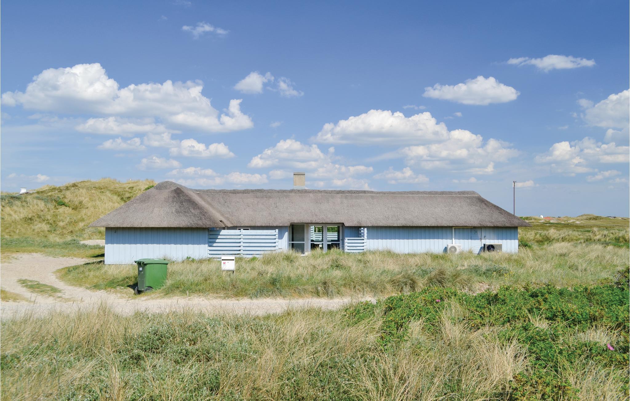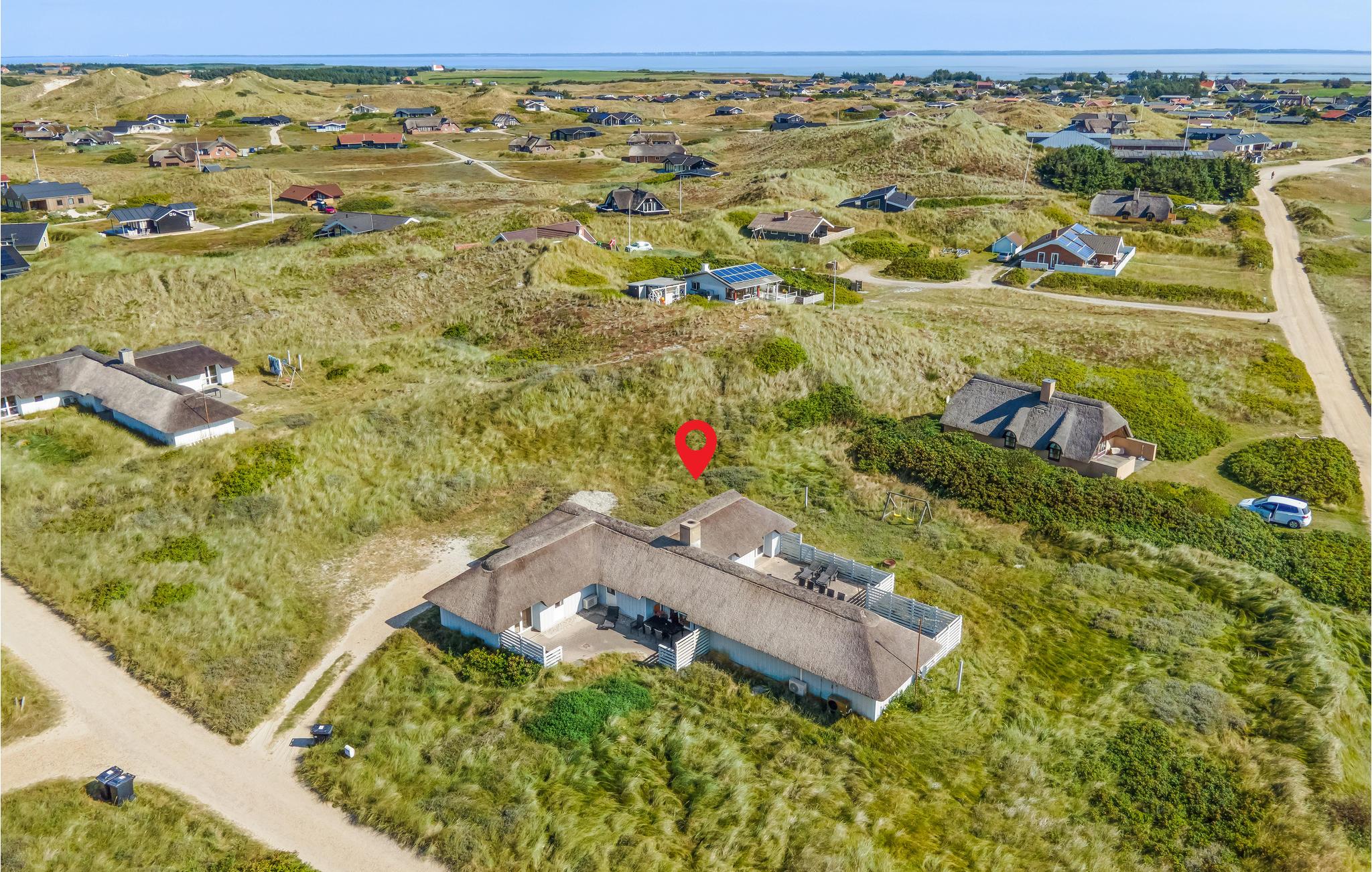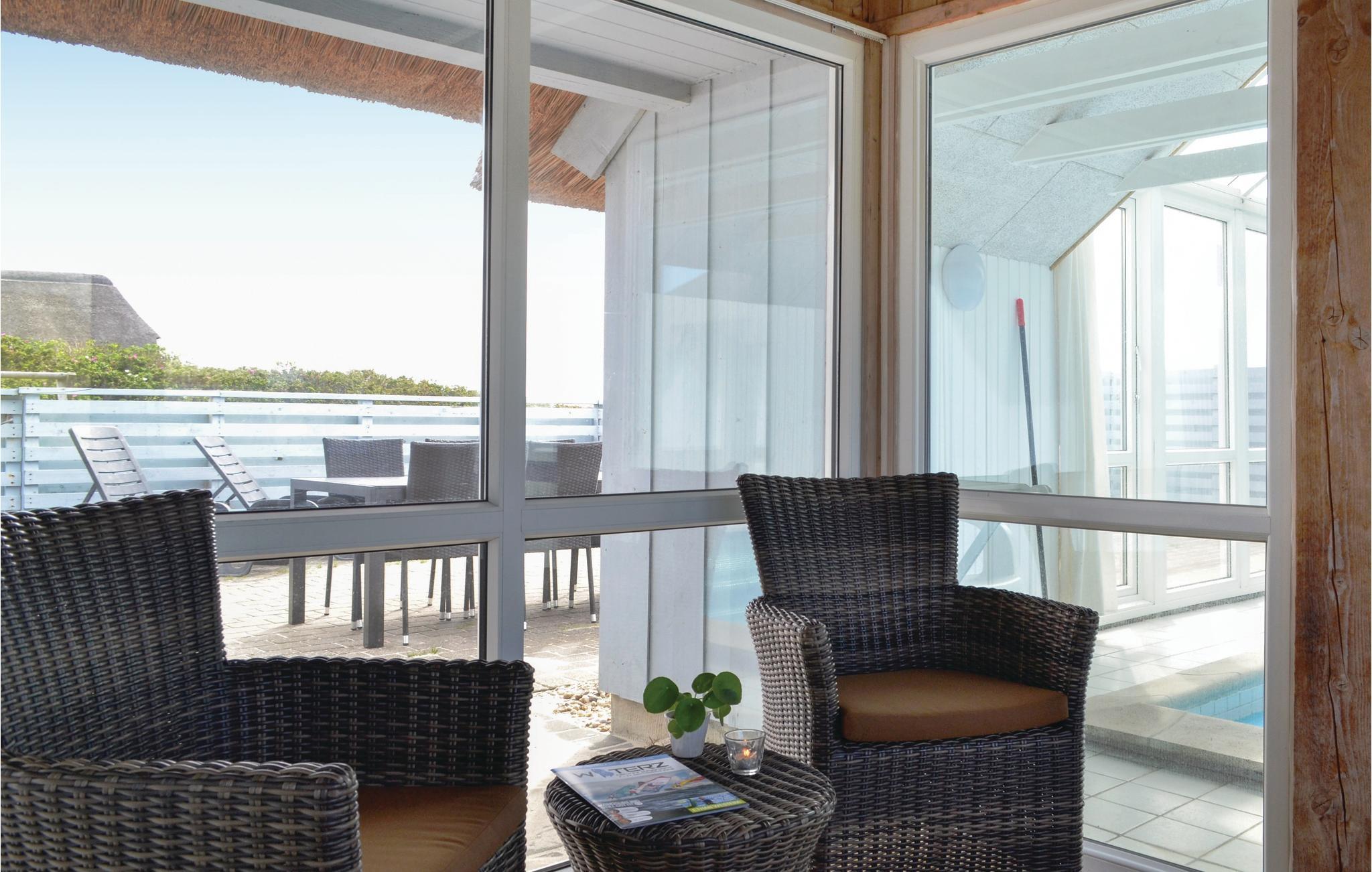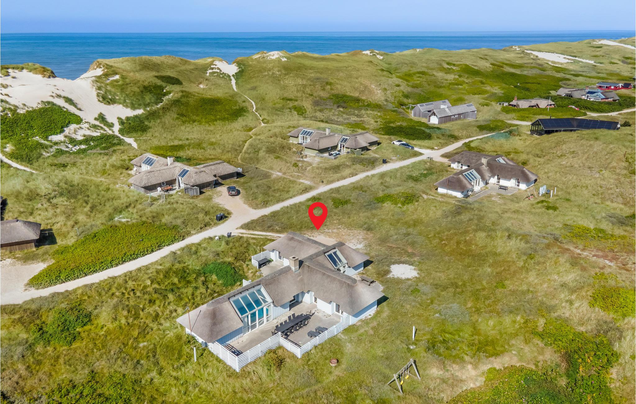 Dette spændende feriehus med swimmingpool ligger på en let kuperet klitgrund, tæt på sidste klitrække ud mod Vesterhavet. Huset er ideelt til to familier, idet soveafsnittet er opdelt i to afdelinger med hver sit badeværelse. Køkken/opholdsrummet er rummeligt og hyggeligt indrettet med loft til kip og synlige bjælker. Når årstiden er til det, er der mange dejlige timer i vente på en af husets delvis åbne og lukkede terrasser, hvorfra I både kan dufte og høre havet. Der er reelt ikke længere end, at I i løbet af et minut kan være nede ved vandet og tage jer en dukkert i Vesterhavet eller nyde en frisk travetur langs strandkanten. Mod syd ligger et stort, åbent, fredet hedeområde. Er havet for koldt til en dukkert, kan I også forkæle jer selv indendørs i husets wellnessafdeling med swimmingpool, sauna og spabad eller blot nyde en stille stund med ild i brændeovnen.