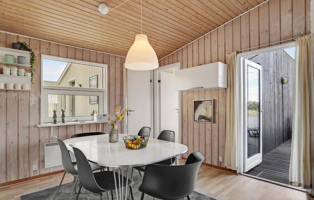 Rummeligt feriehus af træ med god plads til to familier. Det er indrettet med en stor stue med åben adgang til køkkenet. Derudover er der en stor, østvendt havestue med god plads og mulighed for at nyde morgenmaden. Udvendigt er huset omgivet af en større lukket, sydvendt terrasse. Et rigtig godt hus nær Vesterhavet og fjorden. Det ligger kun 5 km fra fiske- og turistbyen Hvide Sande, der byder på mange aktivitetsmuligheder, som bl.a. lystfiskeri, shopping, windsurfing og en vandskibane.