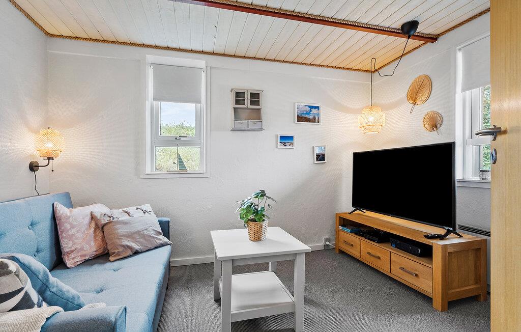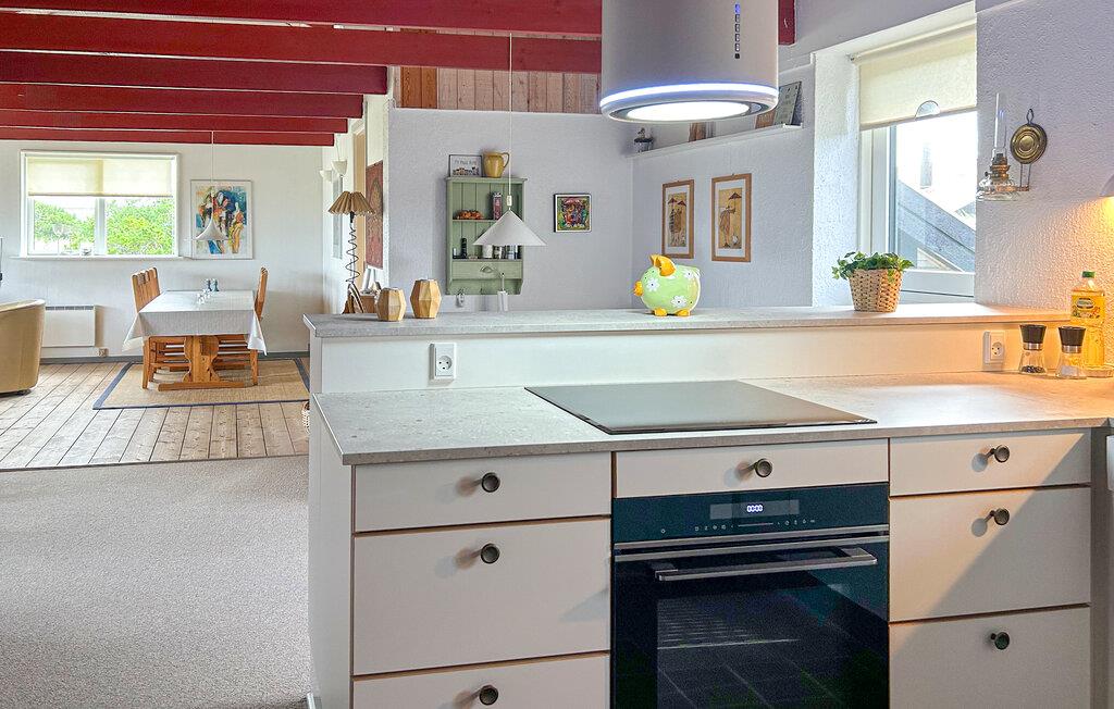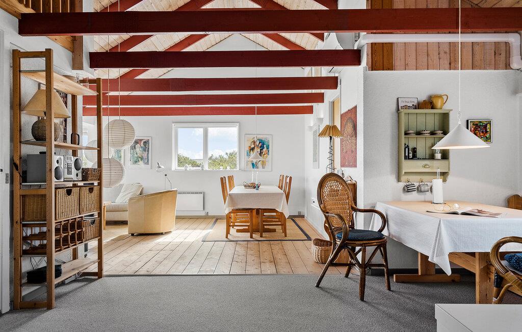 Der er lagt op til en skøn ferie tæt ved Vesterhavet i denne charmerende feriebolig. Her venter jer en varm og hjemlig atmosfære, der understreges af træbjælkerne, de store vinduespartier og det åbne rum, der er husets hjerte. Her kan familiens amatørkokke folde sig ud i køkkenet, mens andre hygger sig med en god bog, en podcast eller en krydsogtværs i sofaen.