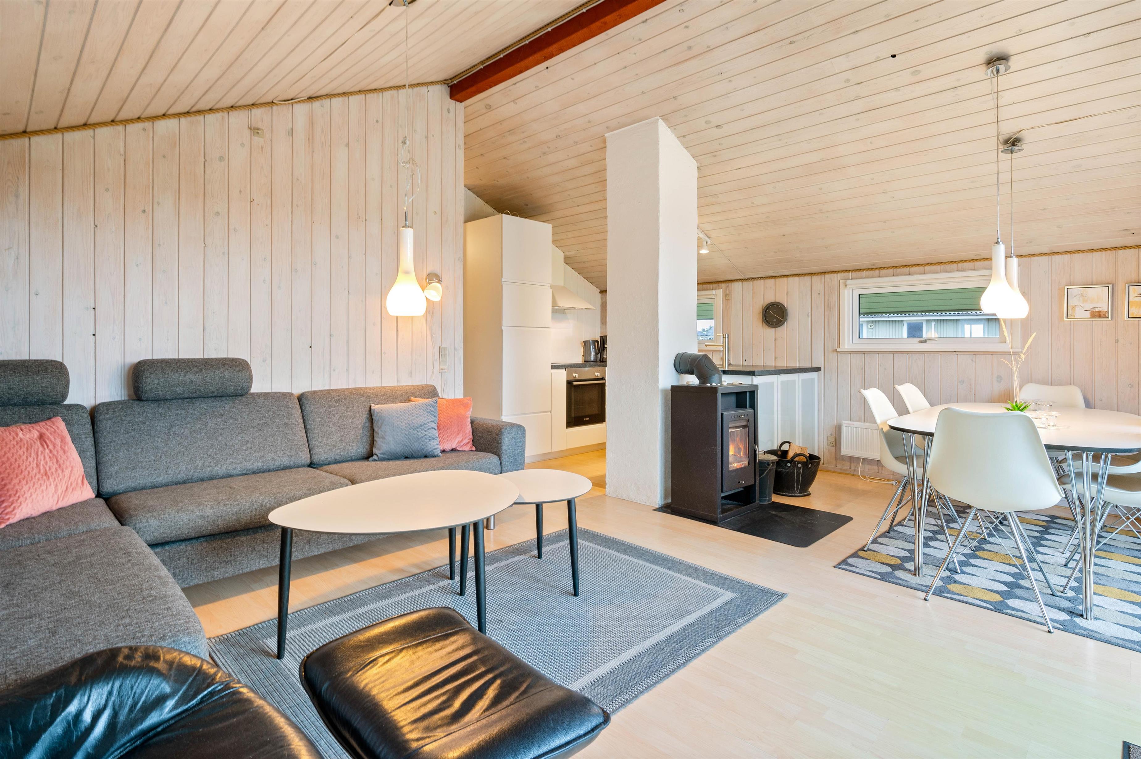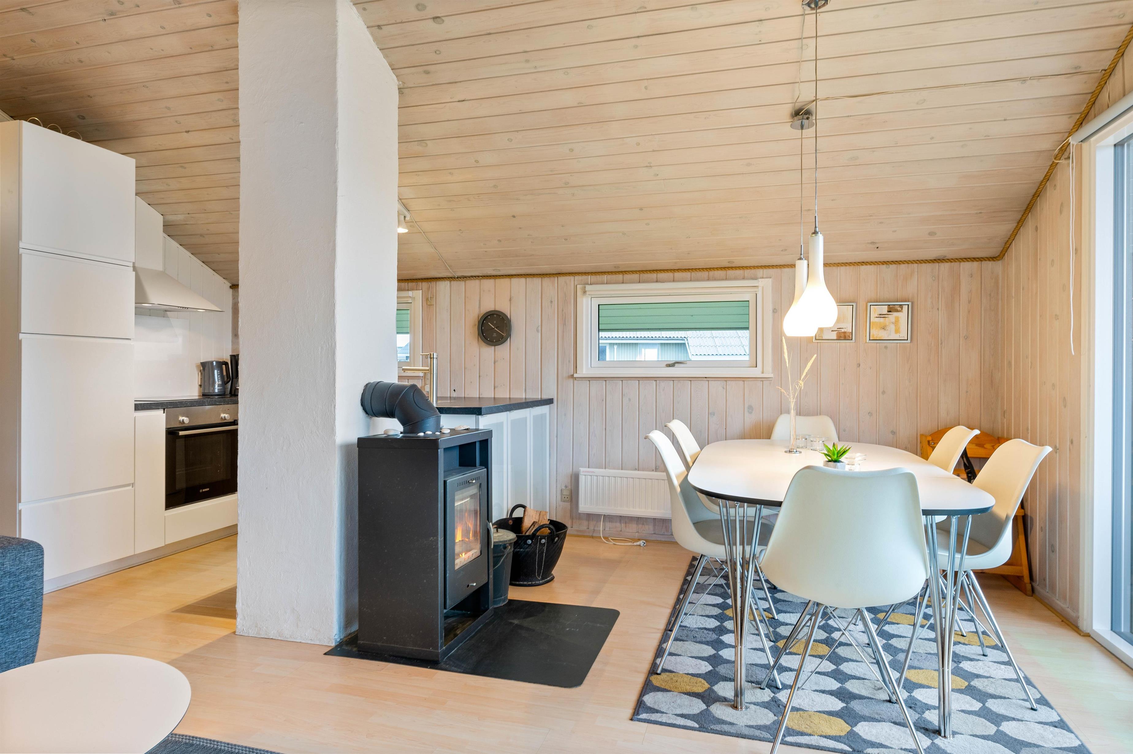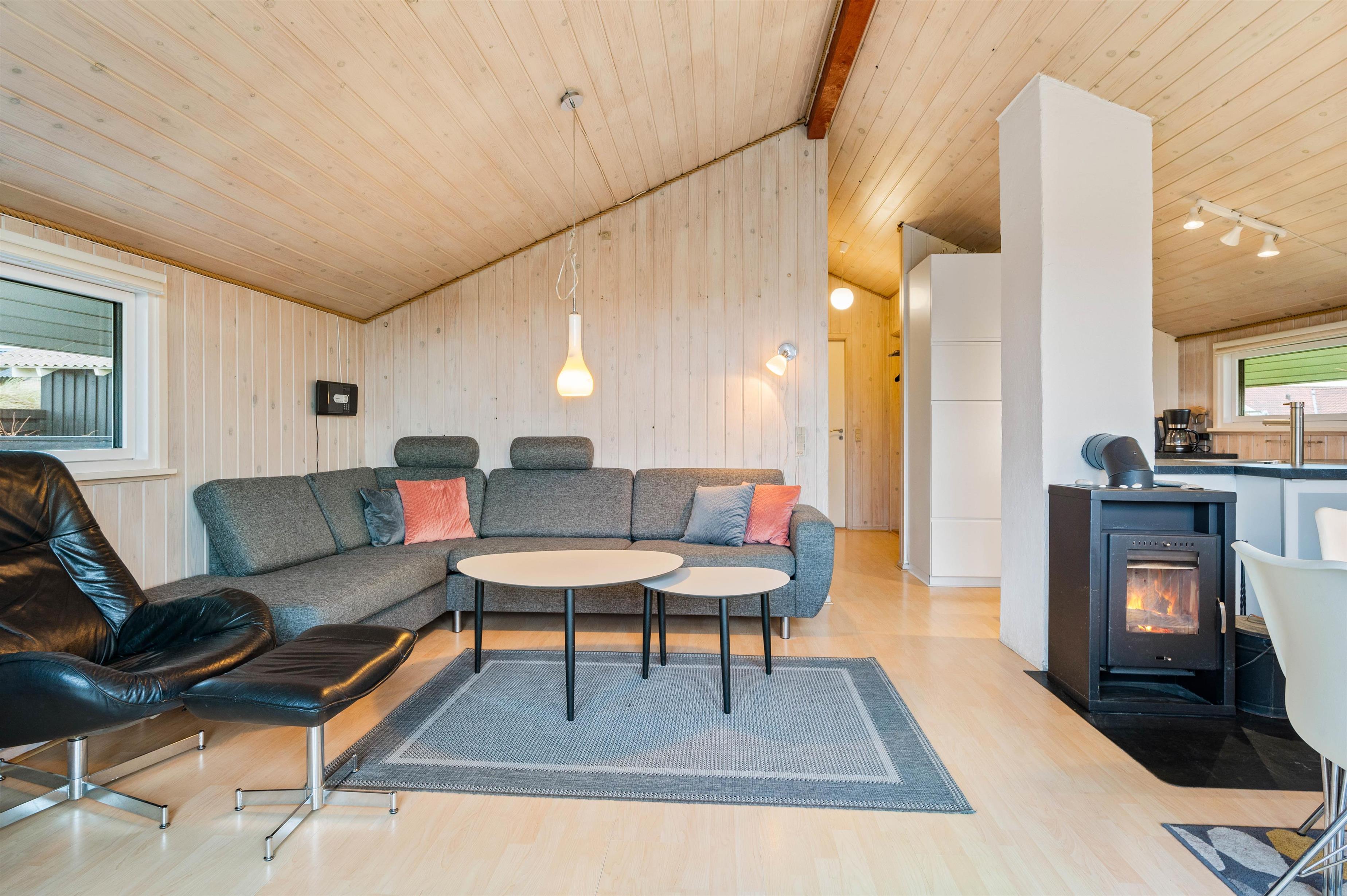 Det dejlige feriehus på Vesterledvej 50 er indrettet helt enkelt i sort og hvidt med enkelte farvestrejf i form af træmøbler og træ på vægge og lofter. Træoverfladerne skaber et dejligt varmt indtryk i sommerhuset, som passer godt til feriestemningen. Også på de køligere dage er her hyggeligt - slap af i sofaen foran den knitrende ild i brændeovnen og med en god film - der er Chromecast til TV'et.
