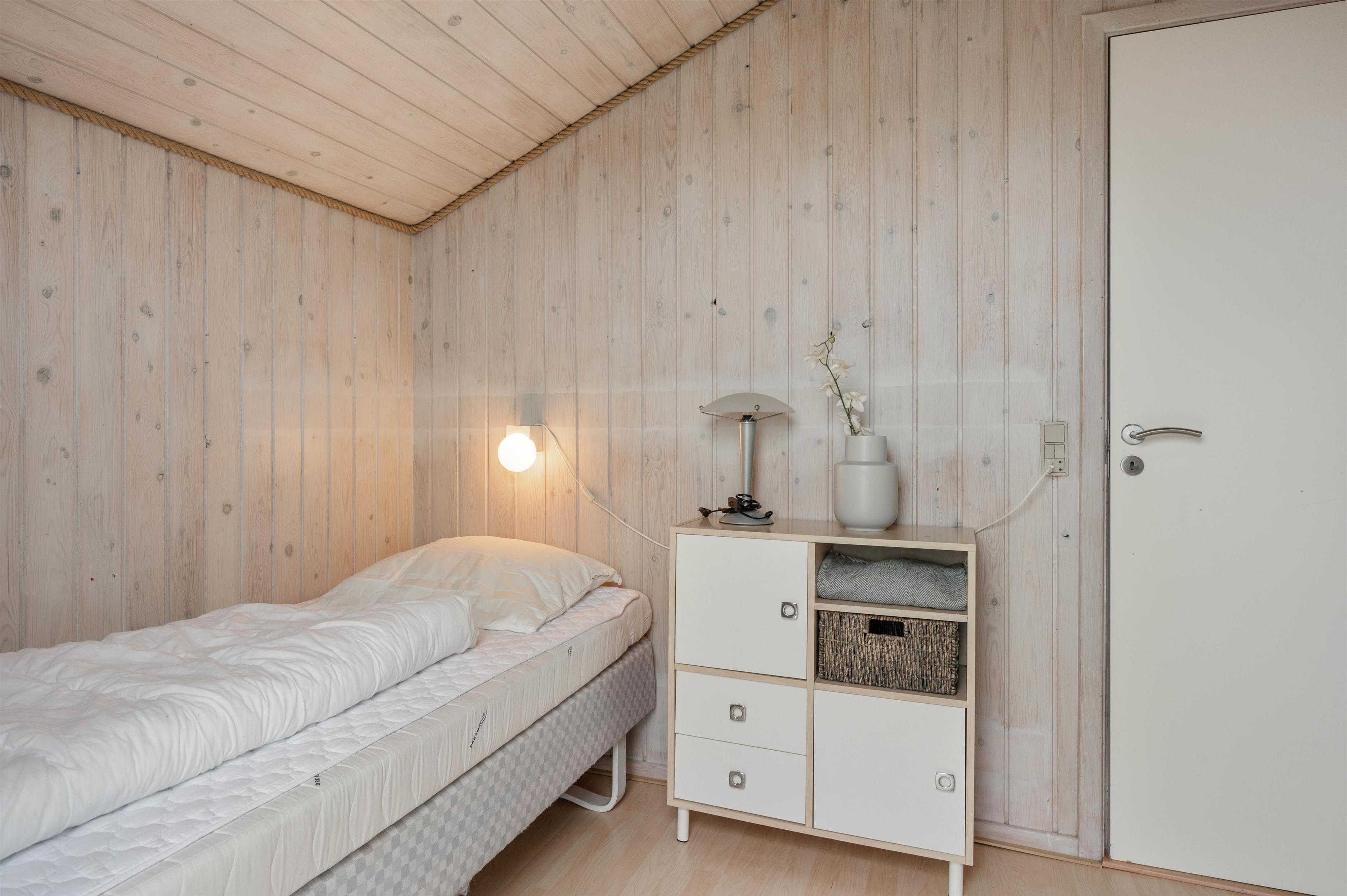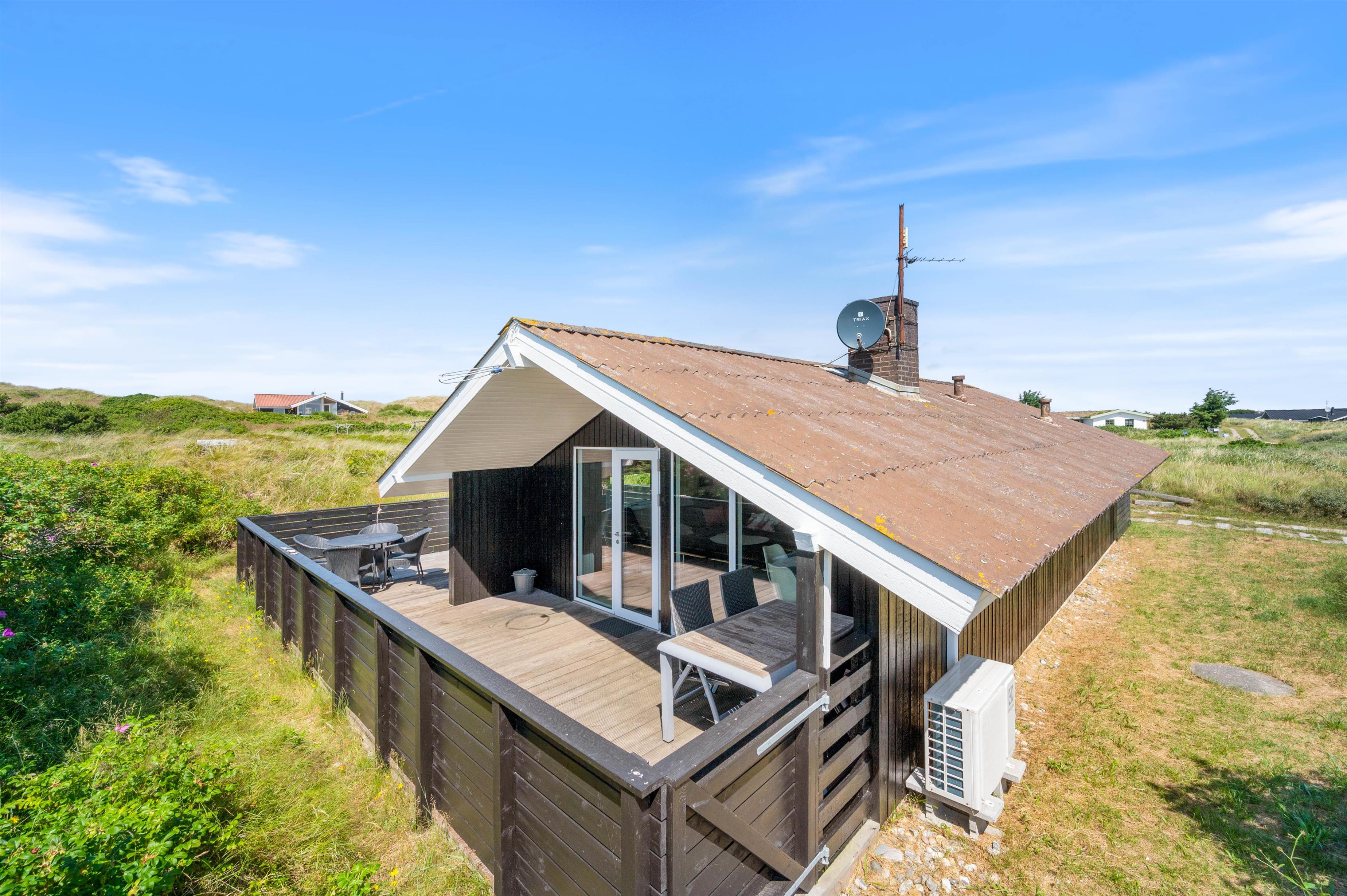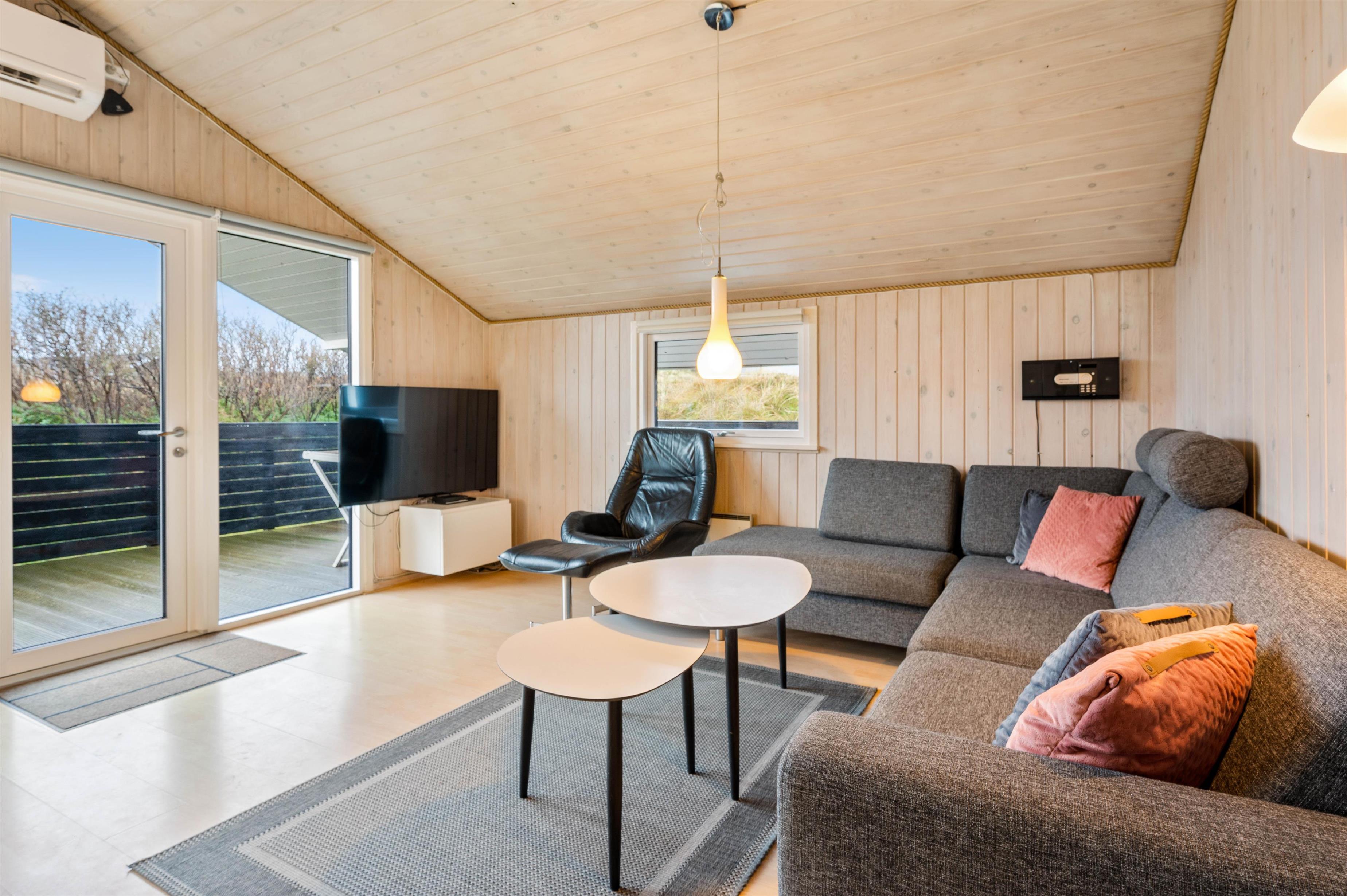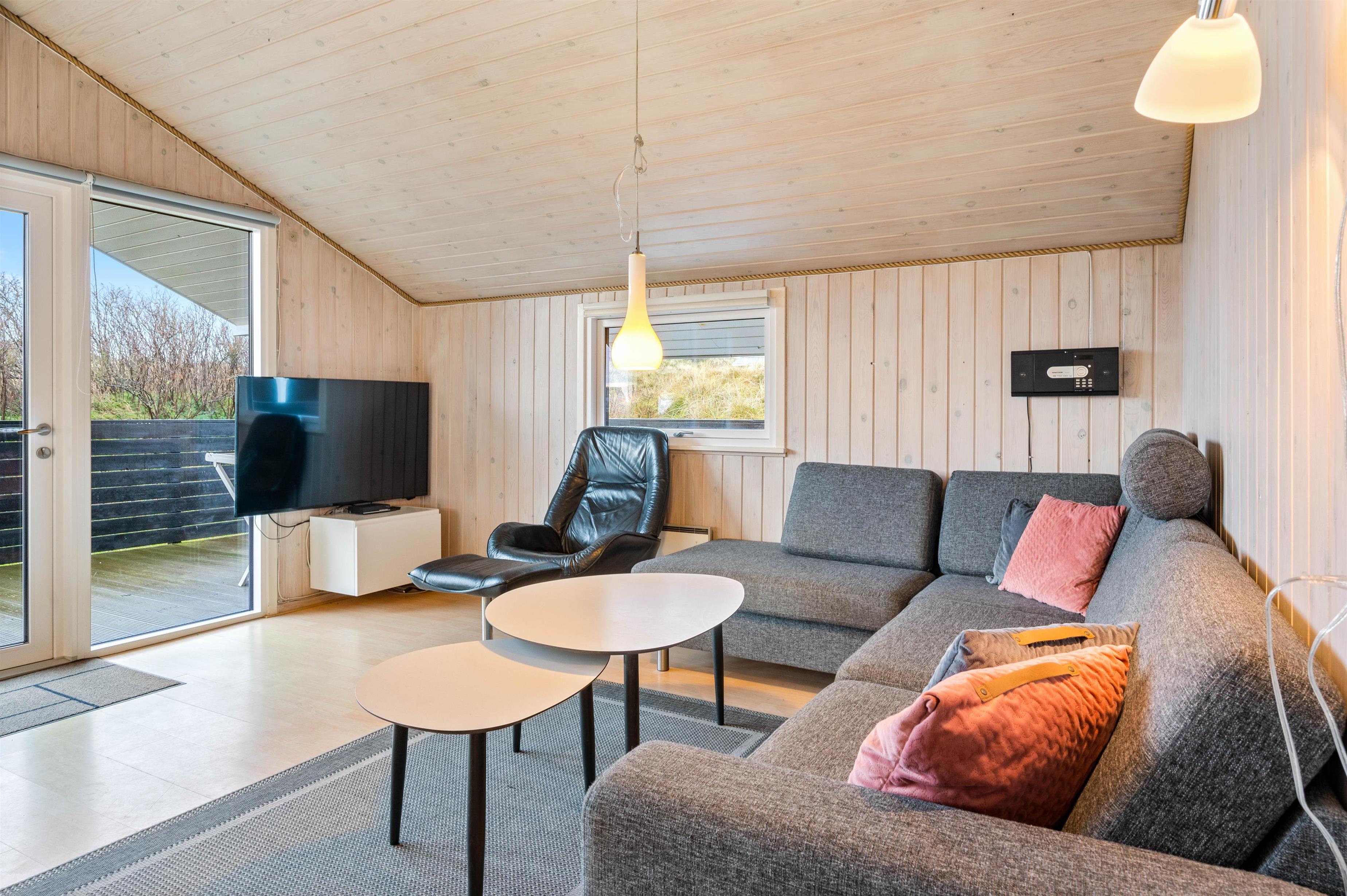 Det dejlige feriehus på Vesterledvej 50 er indrettet helt enkelt i sort og hvidt med enkelte farvestrejf i form af træmøbler og træ på vægge og lofter. Træoverfladerne skaber et dejligt varmt indtryk i sommerhuset, som passer godt til feriestemningen. Også på de køligere dage er her hyggeligt - slap af i sofaen foran den knitrende ild i brændeovnen og med en god film - der er Chromecast til TV'et.