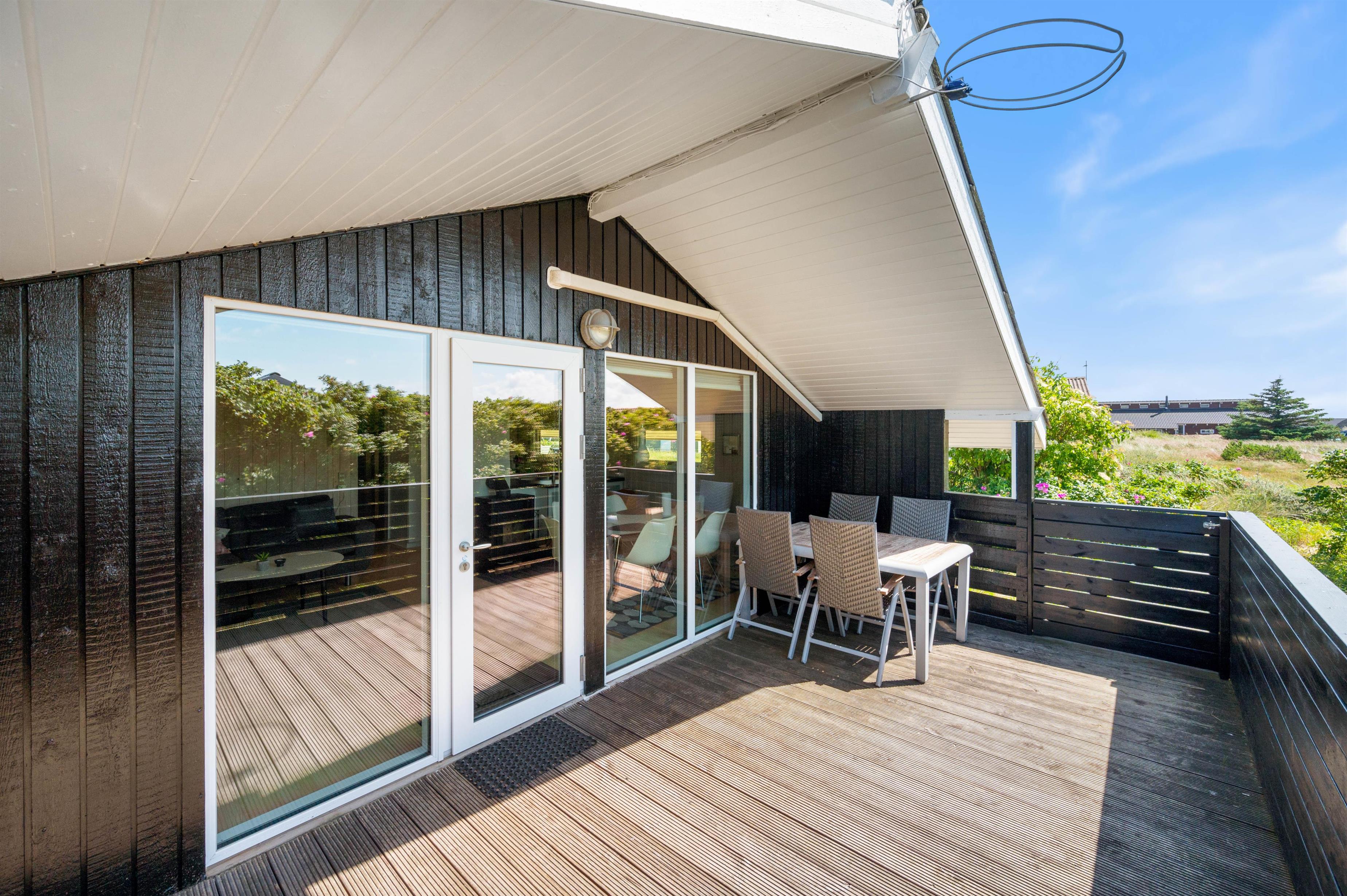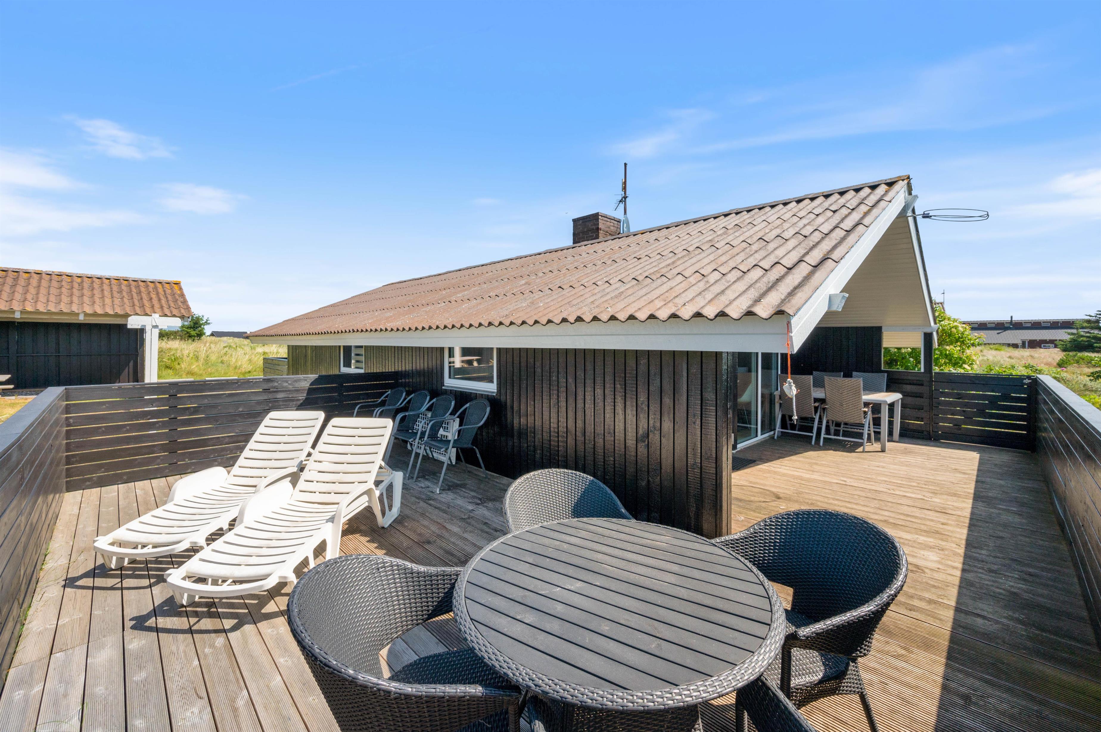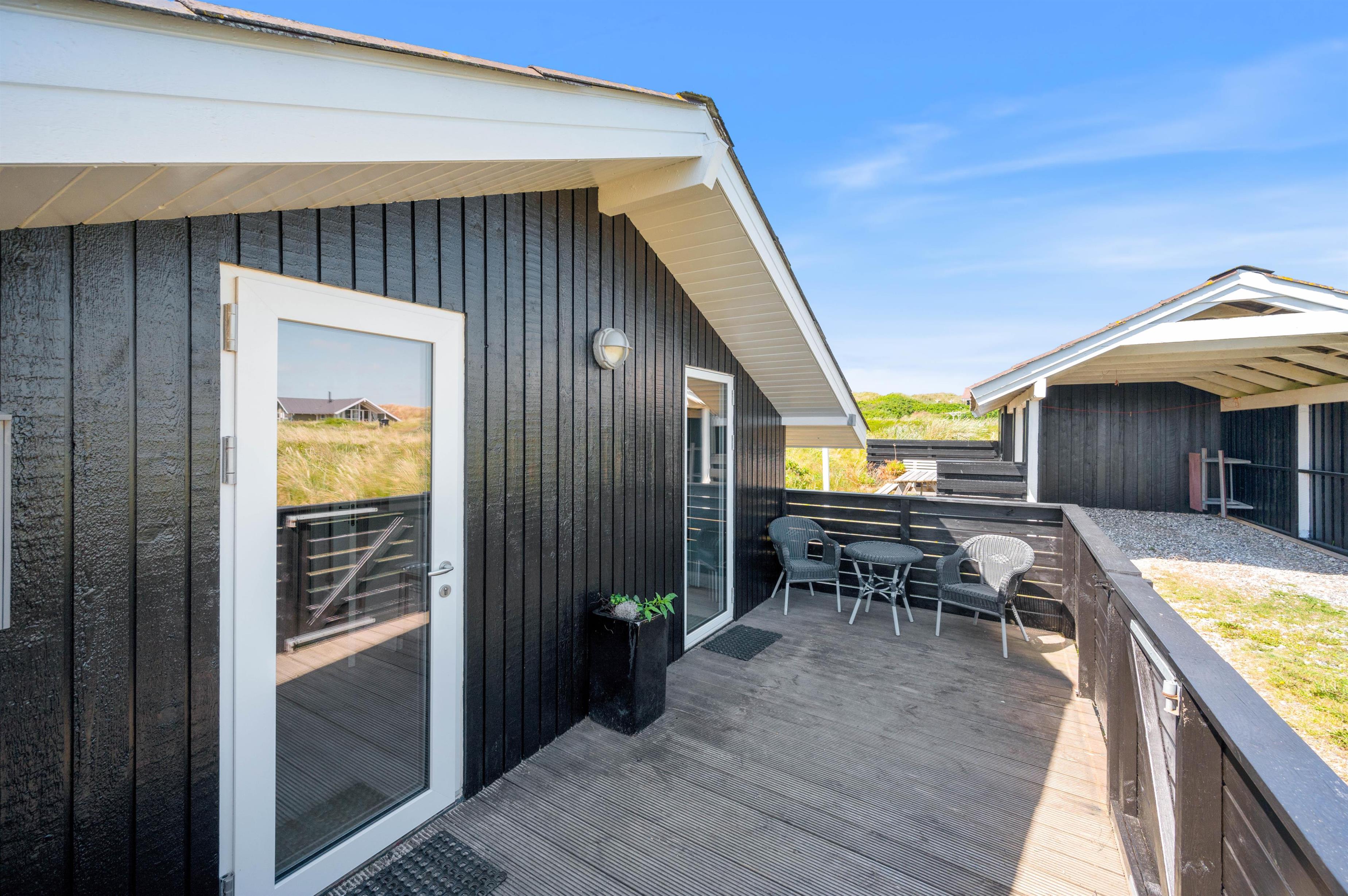 Feriehuset har to helt lukkede terrasser, hvor I kan sidde helt i fred og ro og nyde en lækker middag fra grillen – uden at skulle bekymre jer om, at familiens mindste løber væk – eller at hundene kan smutte væk. En del af den ene terrasse er overdækket. Det er med til at forlænge de dejlige, lyse sommeraftener på terrassen. Samtidig betyder det også, at terrassen ofte kan tages i brug i det tidlige forår.