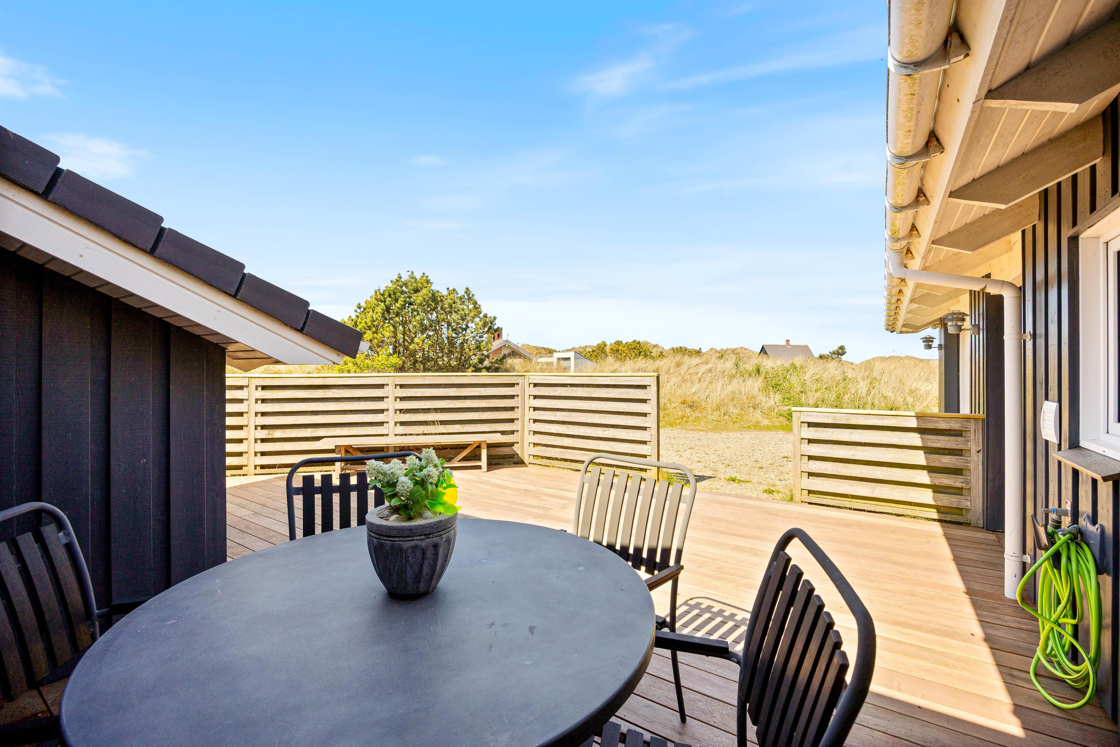 Fra opholdsrummet kan I gå direkte ud på den store, overdækkede og afskærmede træterrasse. Her er der rig mulighed for at nyde udsigten over den flotte naturgrund med klitter.