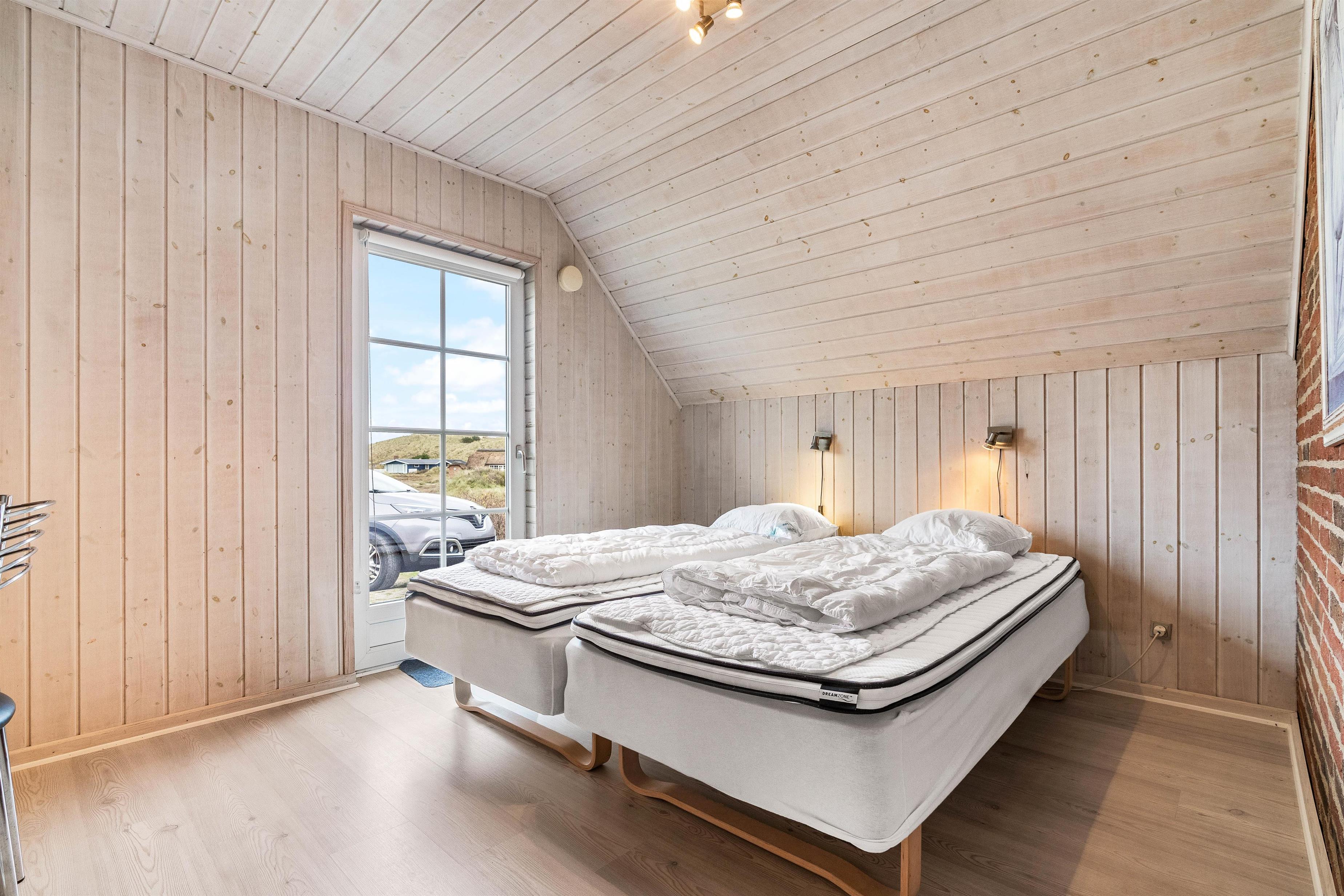Der er 4 soveværelser i sommerhuset, alle med trægulve og dobbeltsenge. Begge badeværelser er med gulvvarme og bruseniche, mens der på det store badeværelse endvidere er en indmuret hjørnespa samt en sauna. Her kan I for alvor koble af fra hverdagen.