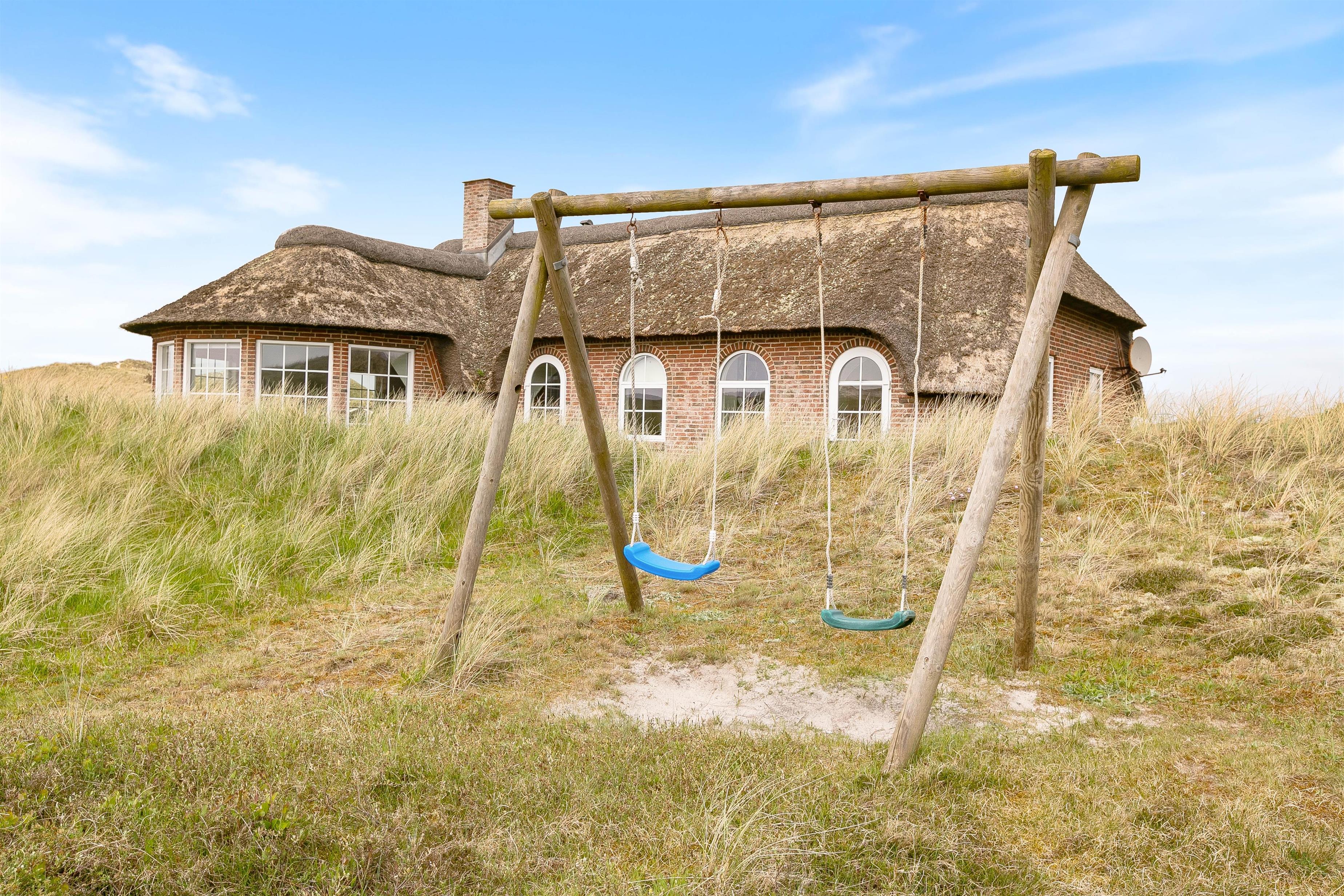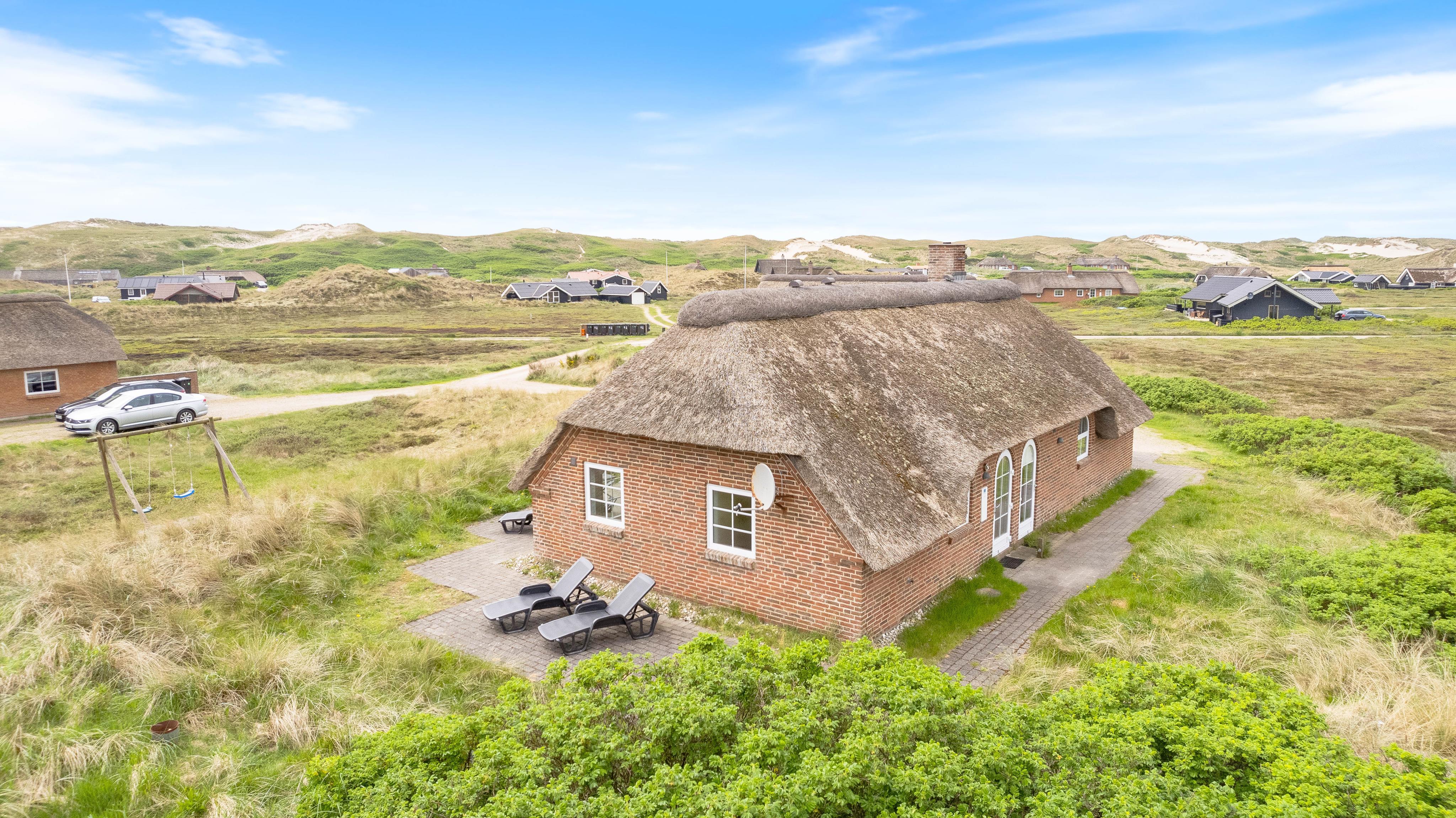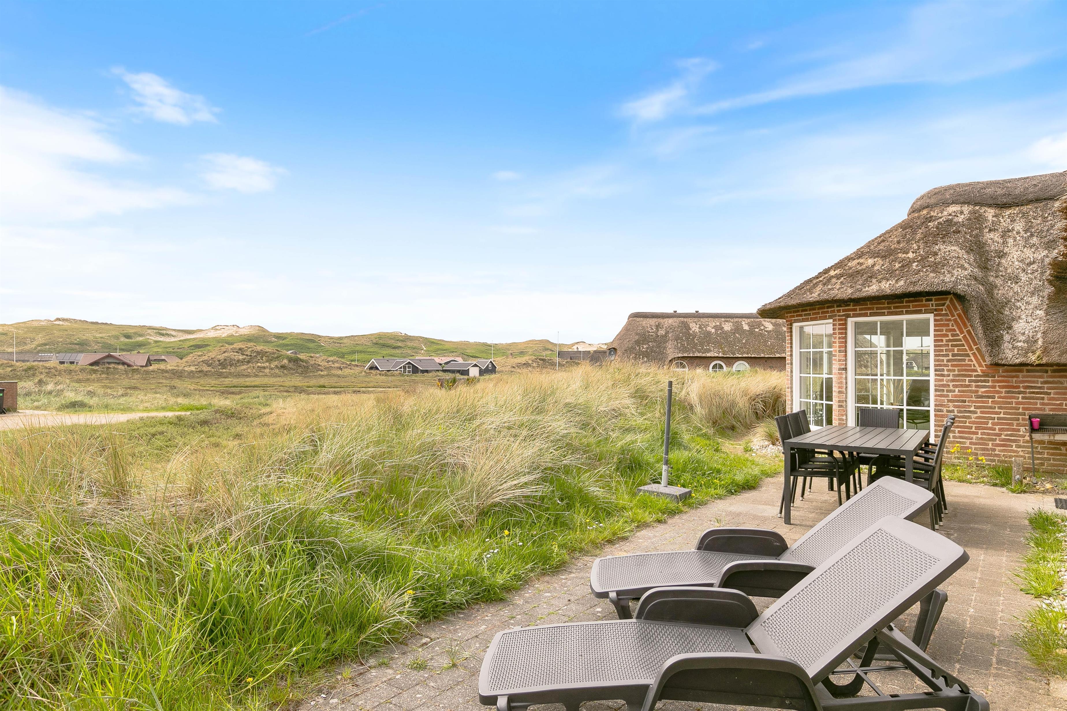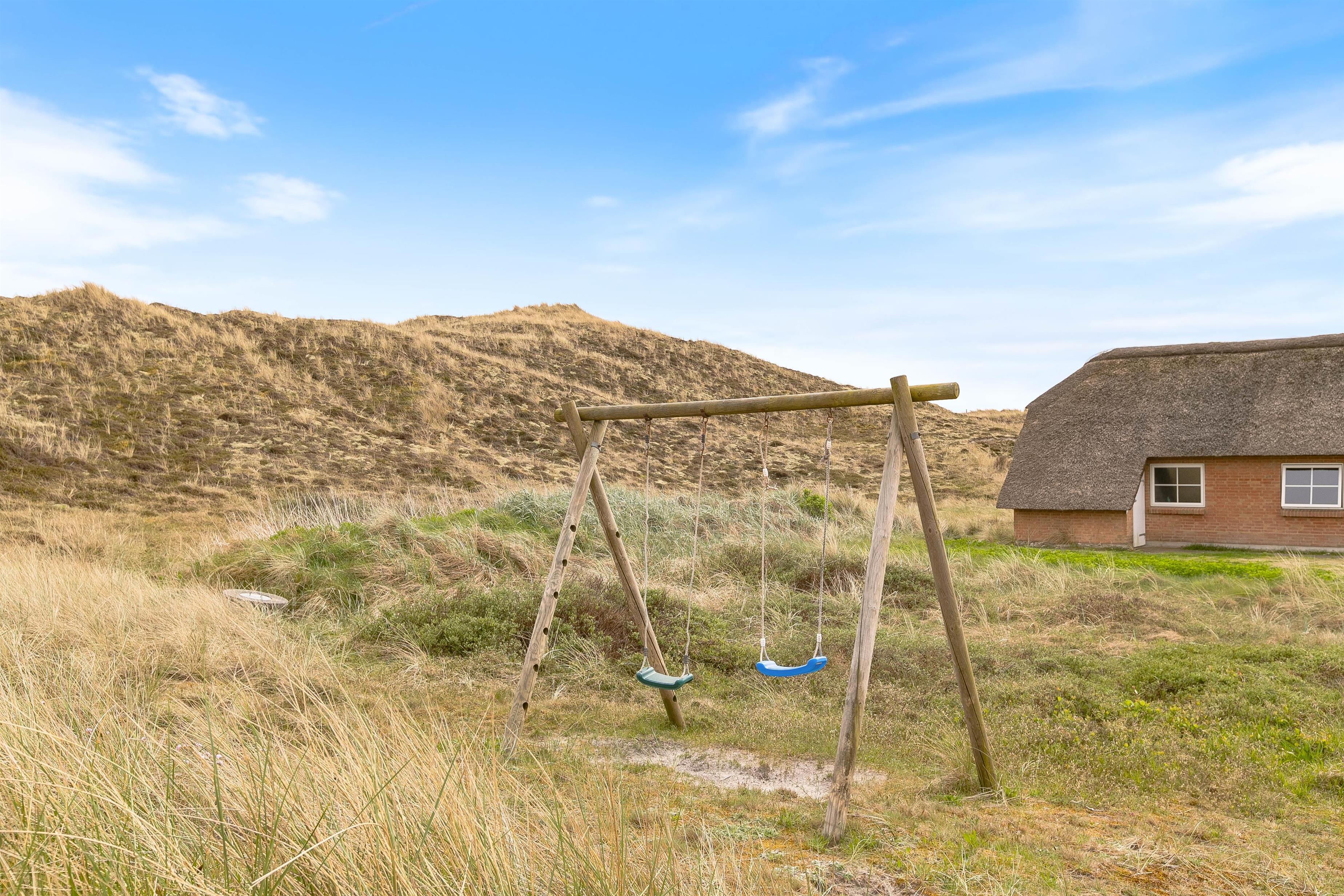 Der er en skøn udsigt både indenfor og fra feriehusets terrasser. Det storslåede klitlandskab er helt unikt, og her er der mulighed for mange lange gåture med børn og hund. Der er flisebelagte terrasser omkring huset mod syd, øst og mod vest. Og dette giver derfor god mulighed for at nyde solen eller at finde læ, hvis vinden kommer fra vest. På naturgrunden er der også en sandkasse til familiens mindste.