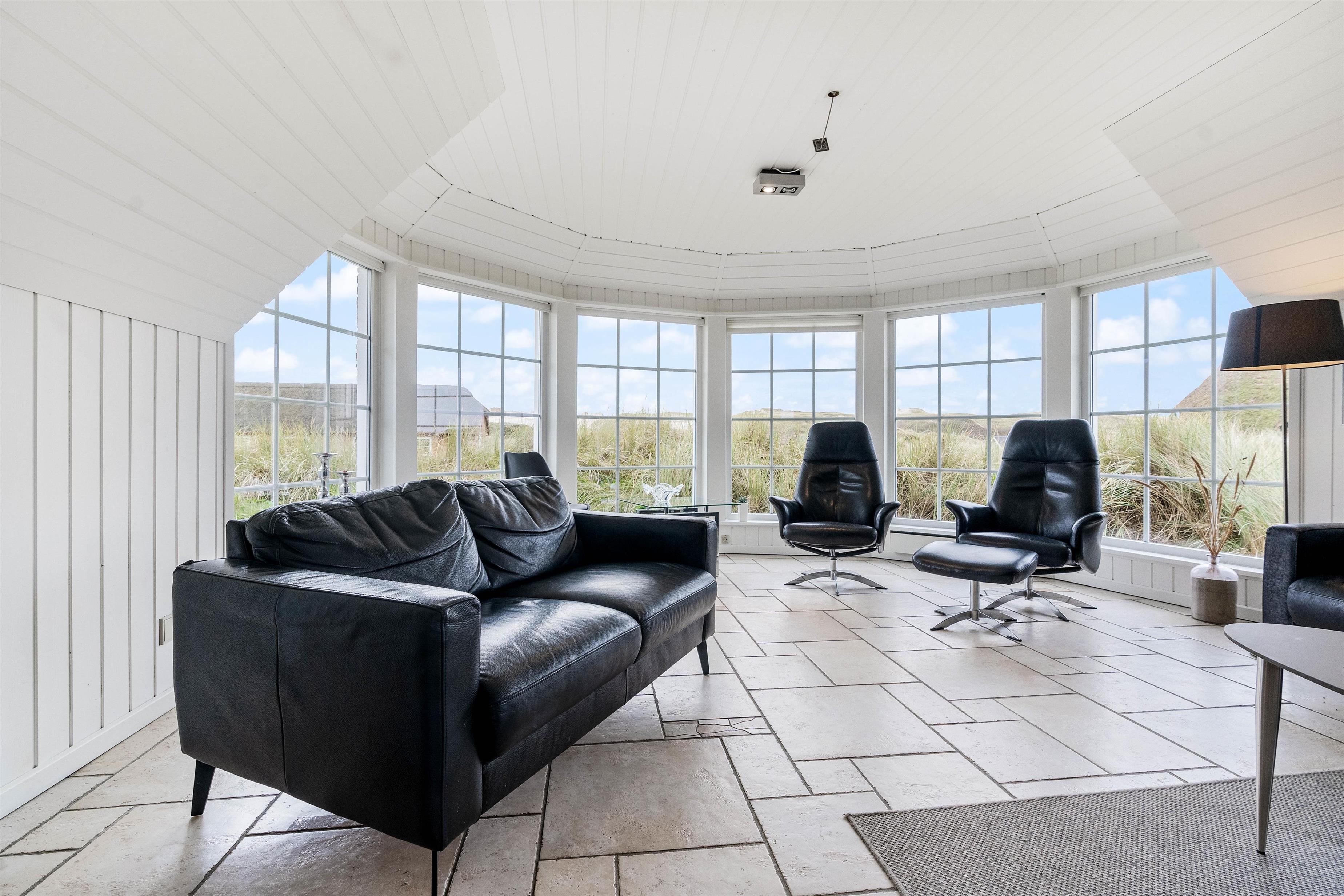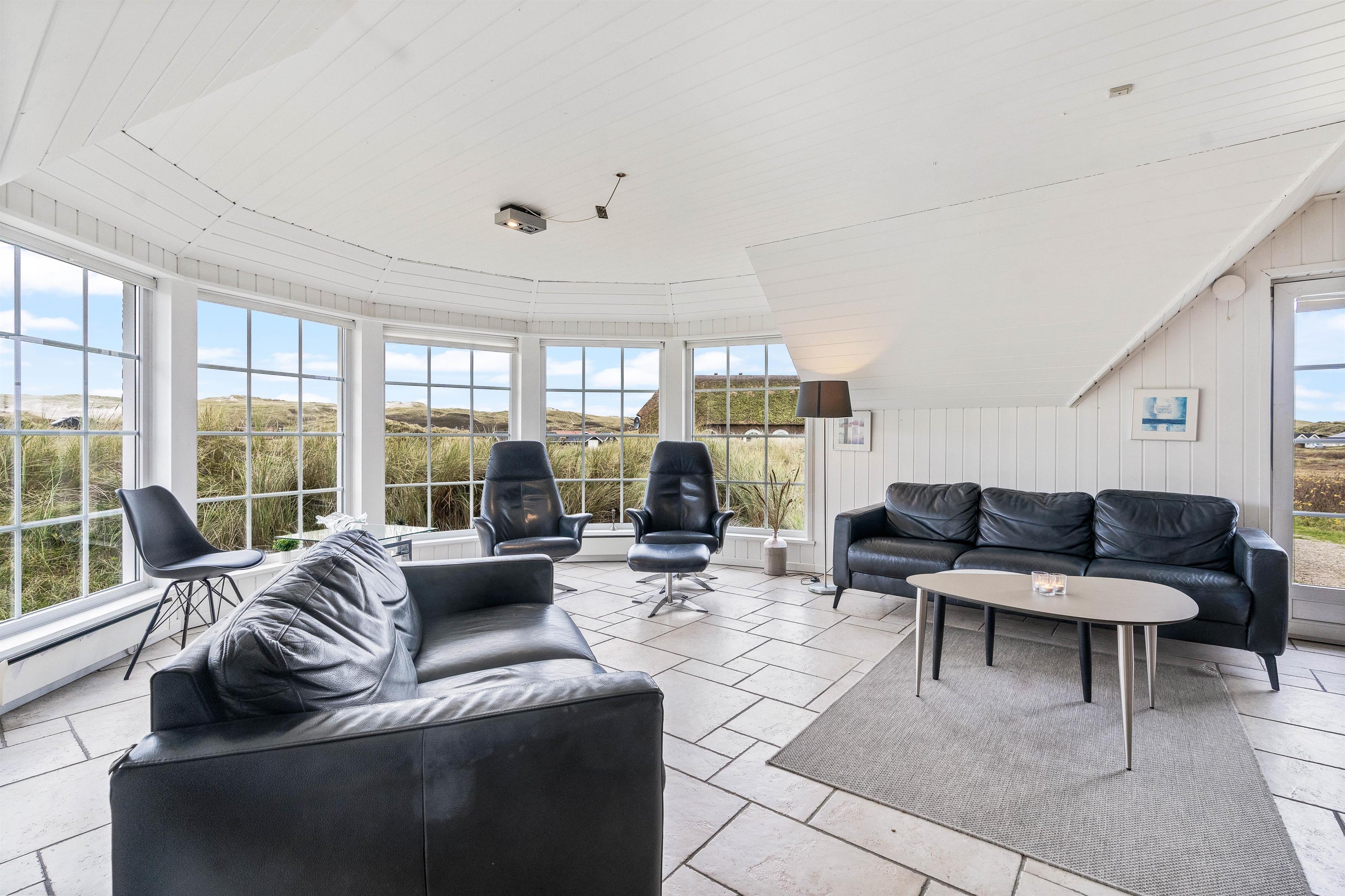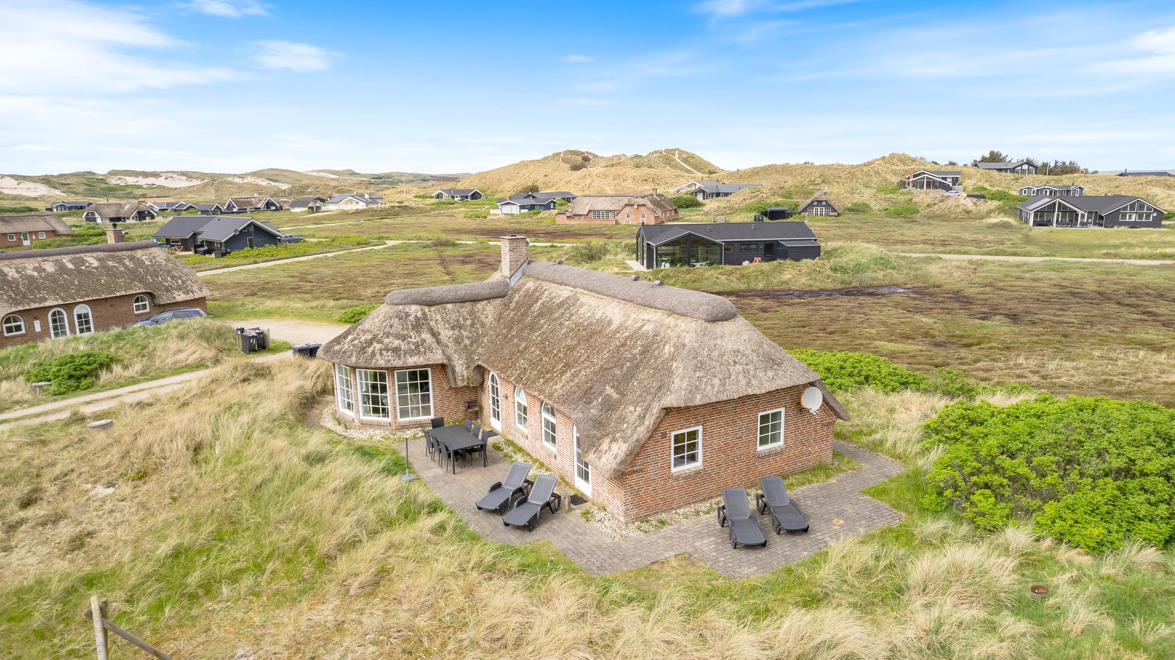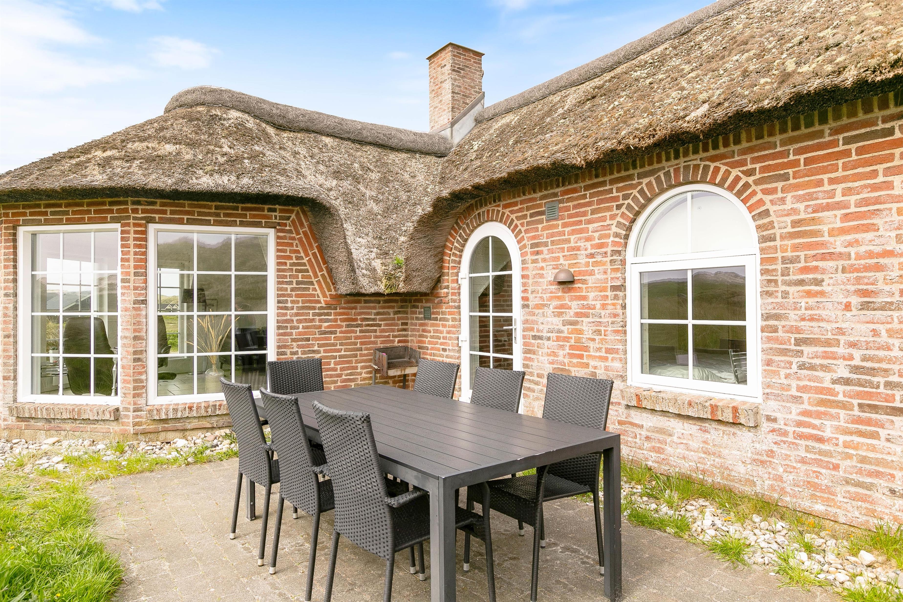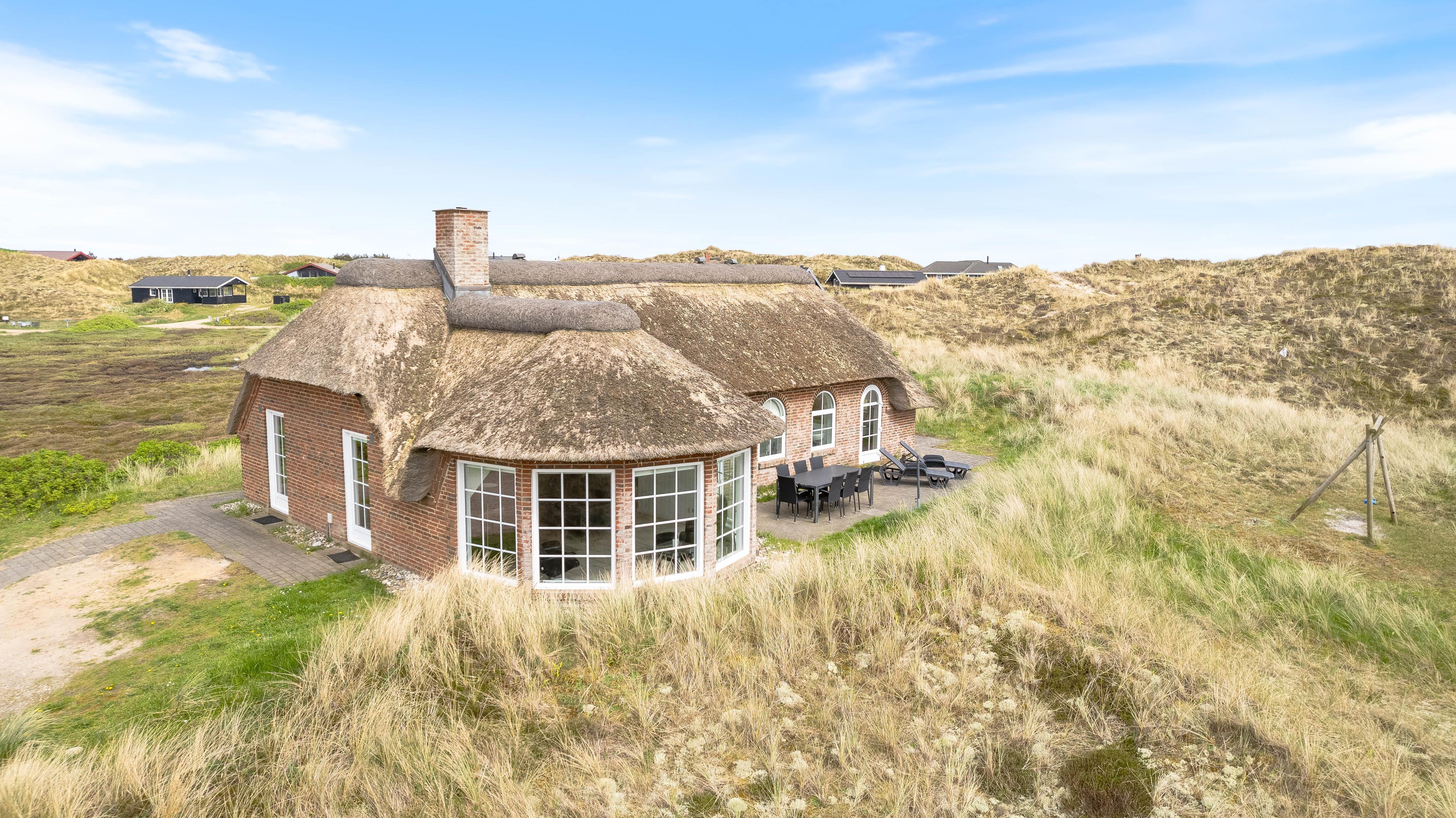 Der er en skøn udsigt både indenfor og fra feriehusets terrasser. Det storslåede klitlandskab er helt unikt, og her er der mulighed for mange lange gåture med børn og hund. Der er flisebelagte terrasser omkring huset mod syd, øst og mod vest. Og dette giver derfor god mulighed for at nyde solen eller at finde læ, hvis vinden kommer fra vest. På naturgrunden er der også en sandkasse til familiens mindste.