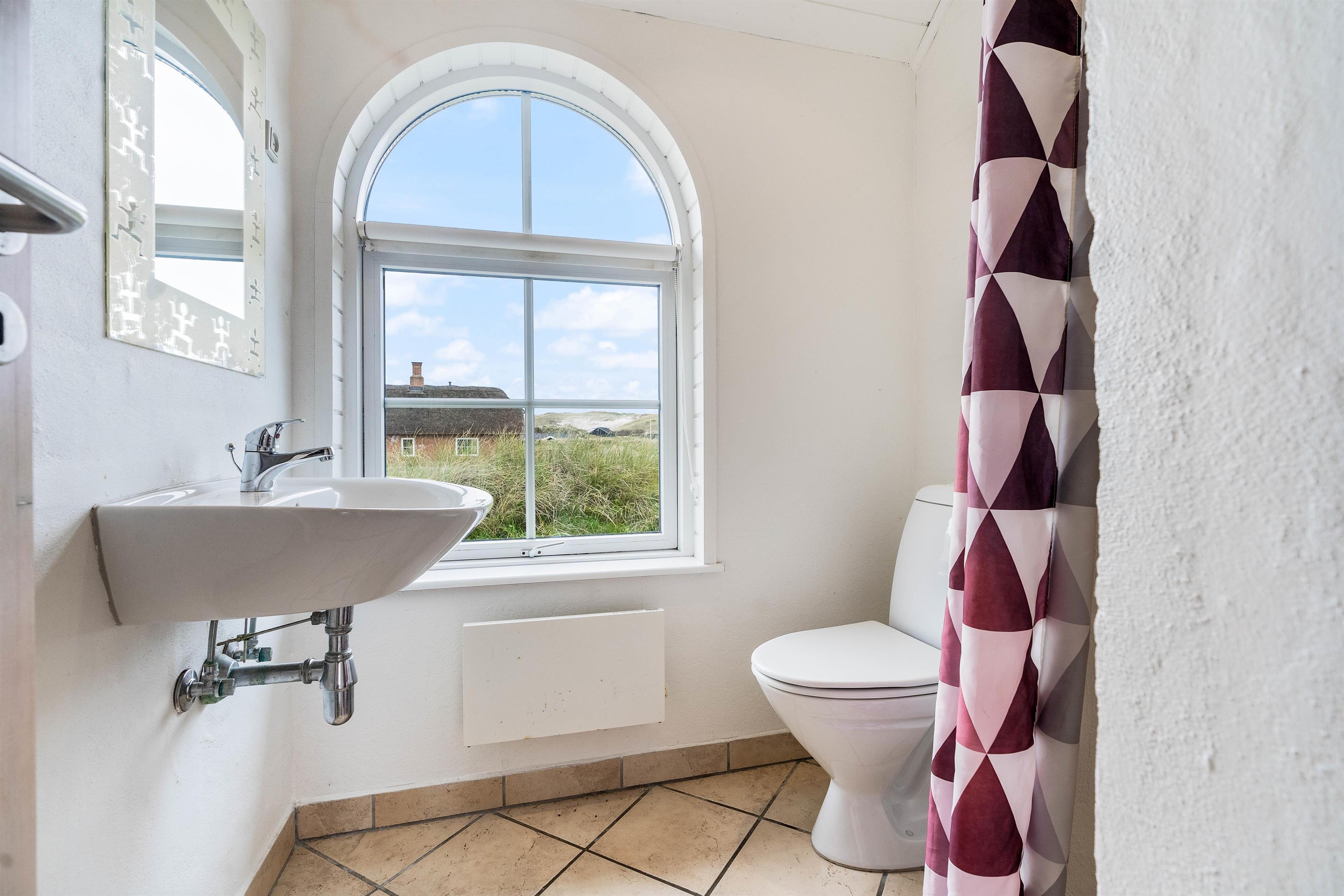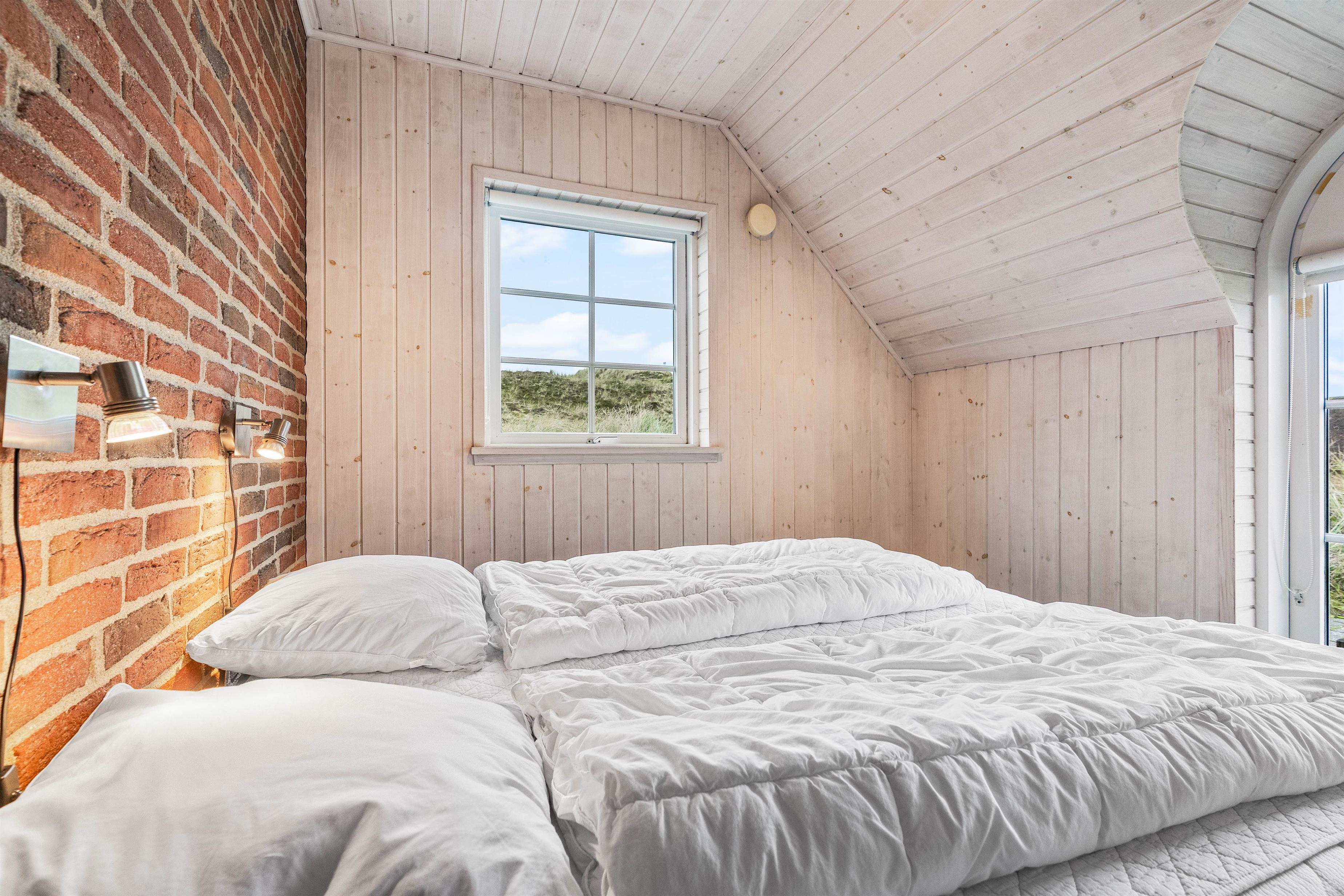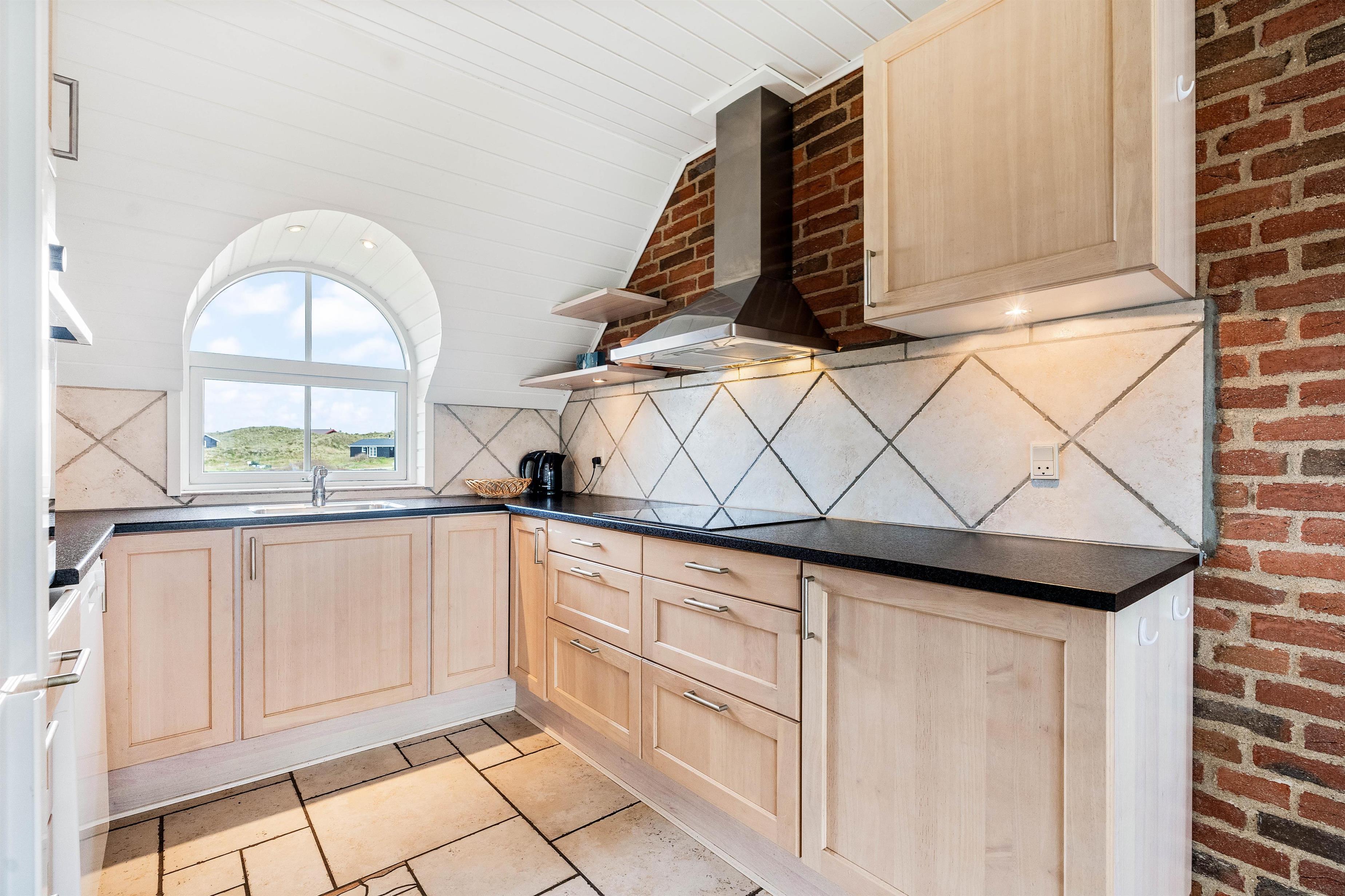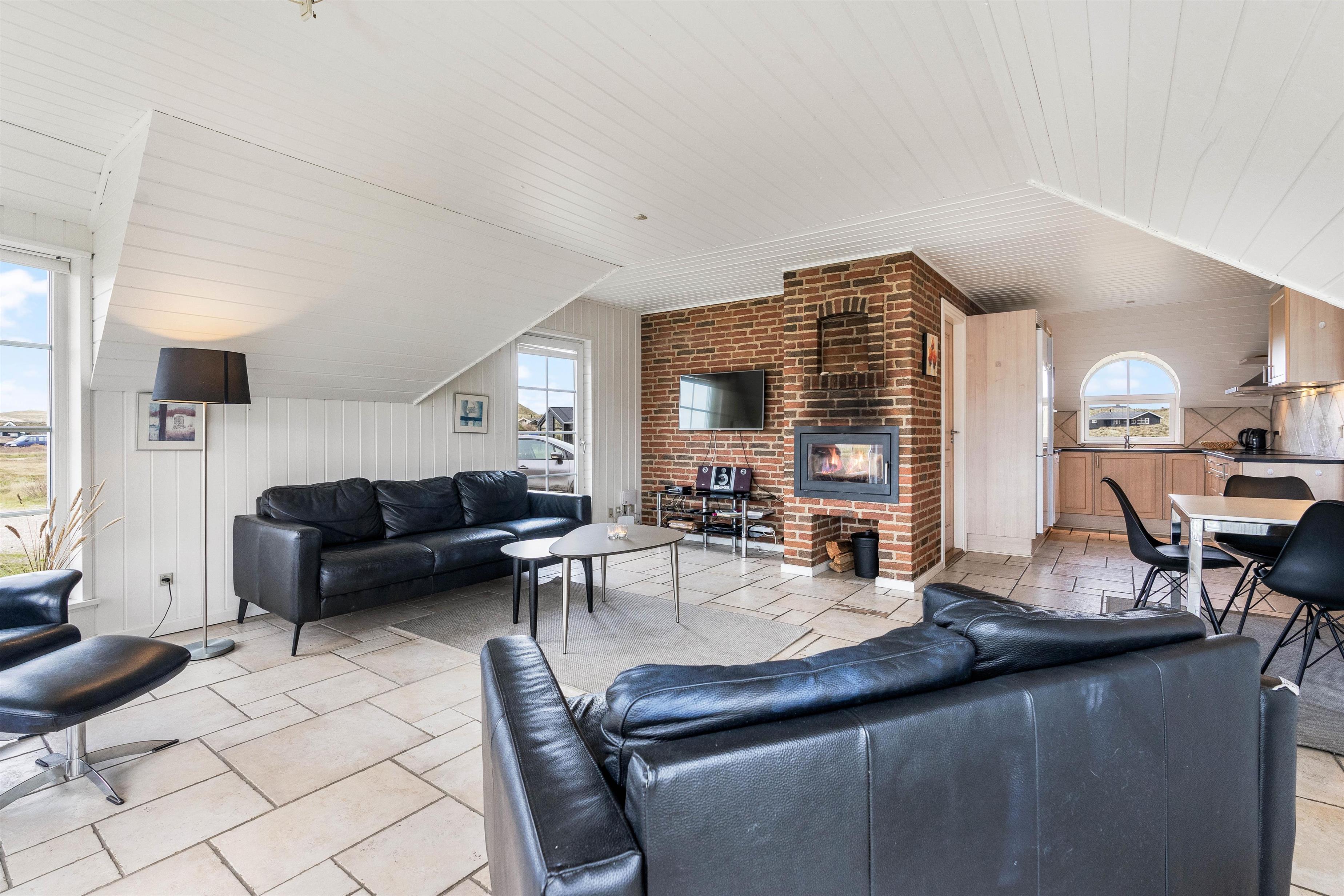 Hjerterummet er det store opholdsrum, hvor spisestuen binder stue og køkken sammen. Det fine vinkelkøkken er veludstyrer og rummer både en fryser (60L), mikroovn og opvaskemaskine. Opholdsrummet har klassiske trælofter og murstensvægge, der skaber et rustikt men varmt udtryk. Mens brændeovnen knitrer, kan I samles til fælles hygge i sofaen eller nyde den smukke udsigt udover klitterne gennem de store vinduer. Både opholdsrummet, badeværelser og entréen har et rengøringsvenligt klinkegulv, mens der i entréen er en vaskesølje med både vaskemaskine og tørretumbler til rådighed.
