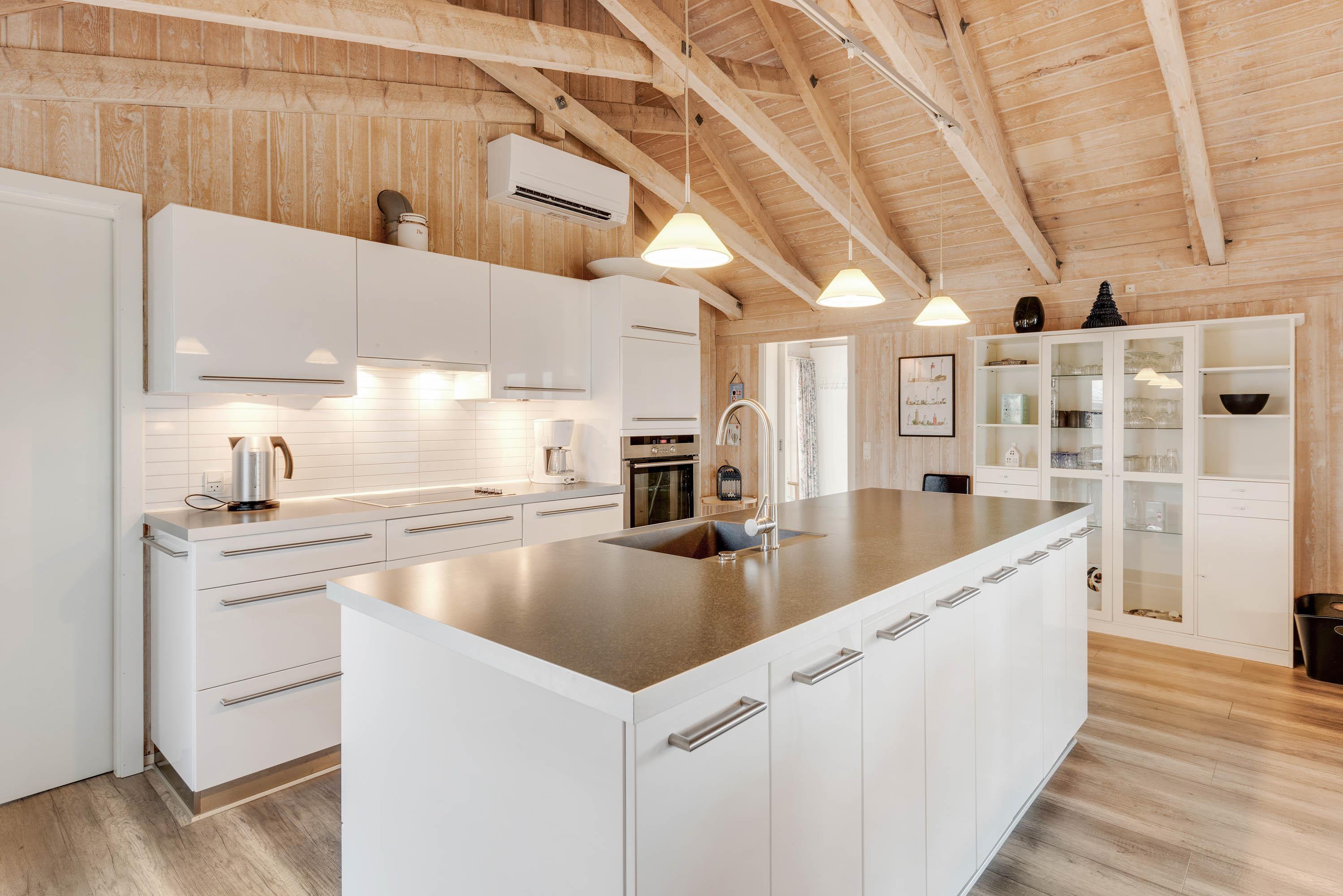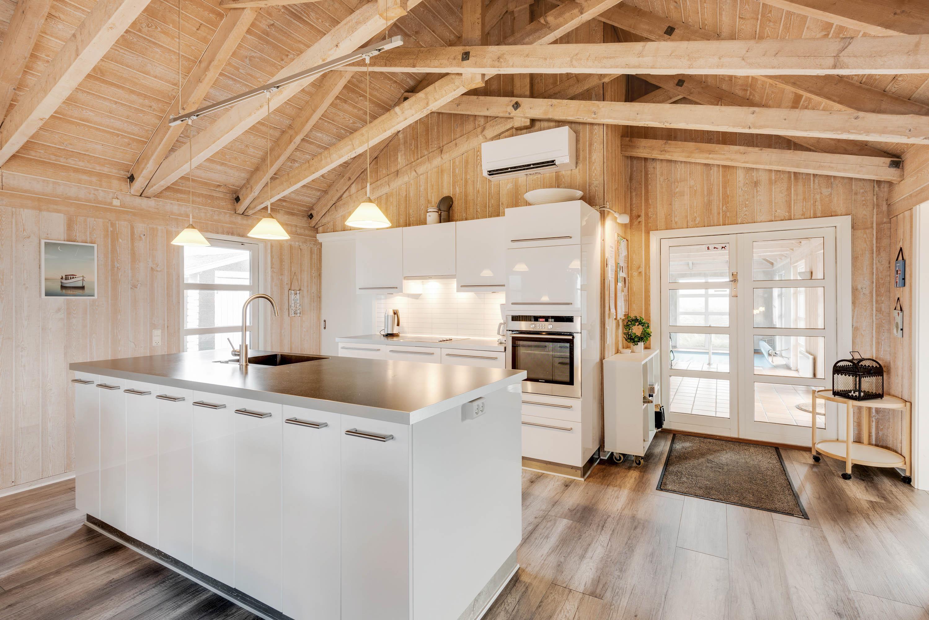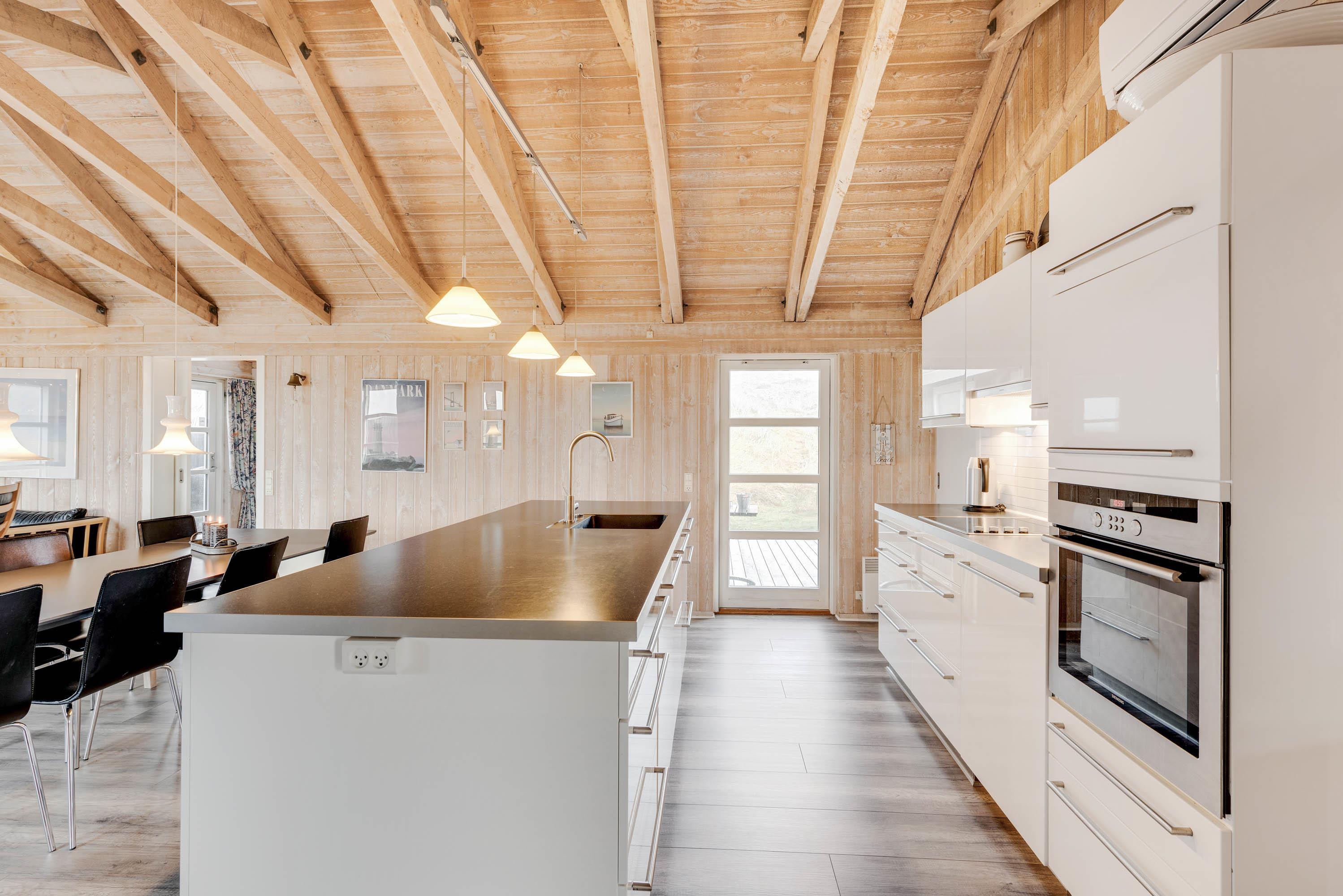 Hjertet i dette 180 kvadratmeter store og hyggelige feriehus er det centrale opholdsrum med en flot og praktisk indrettet køkkenafdeling med bl.a. 80 l. fryser, mikroovn og opvaskemaskine.