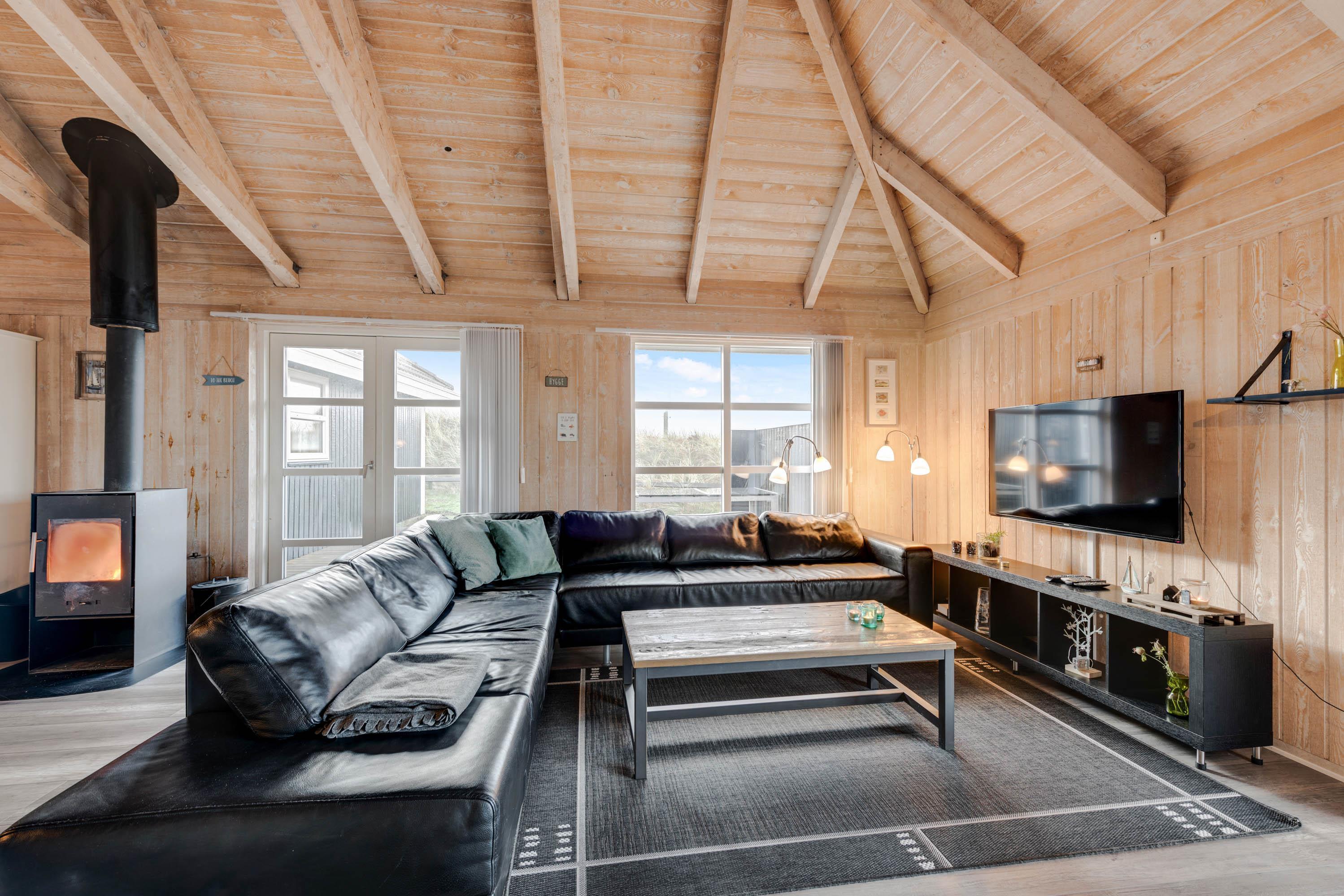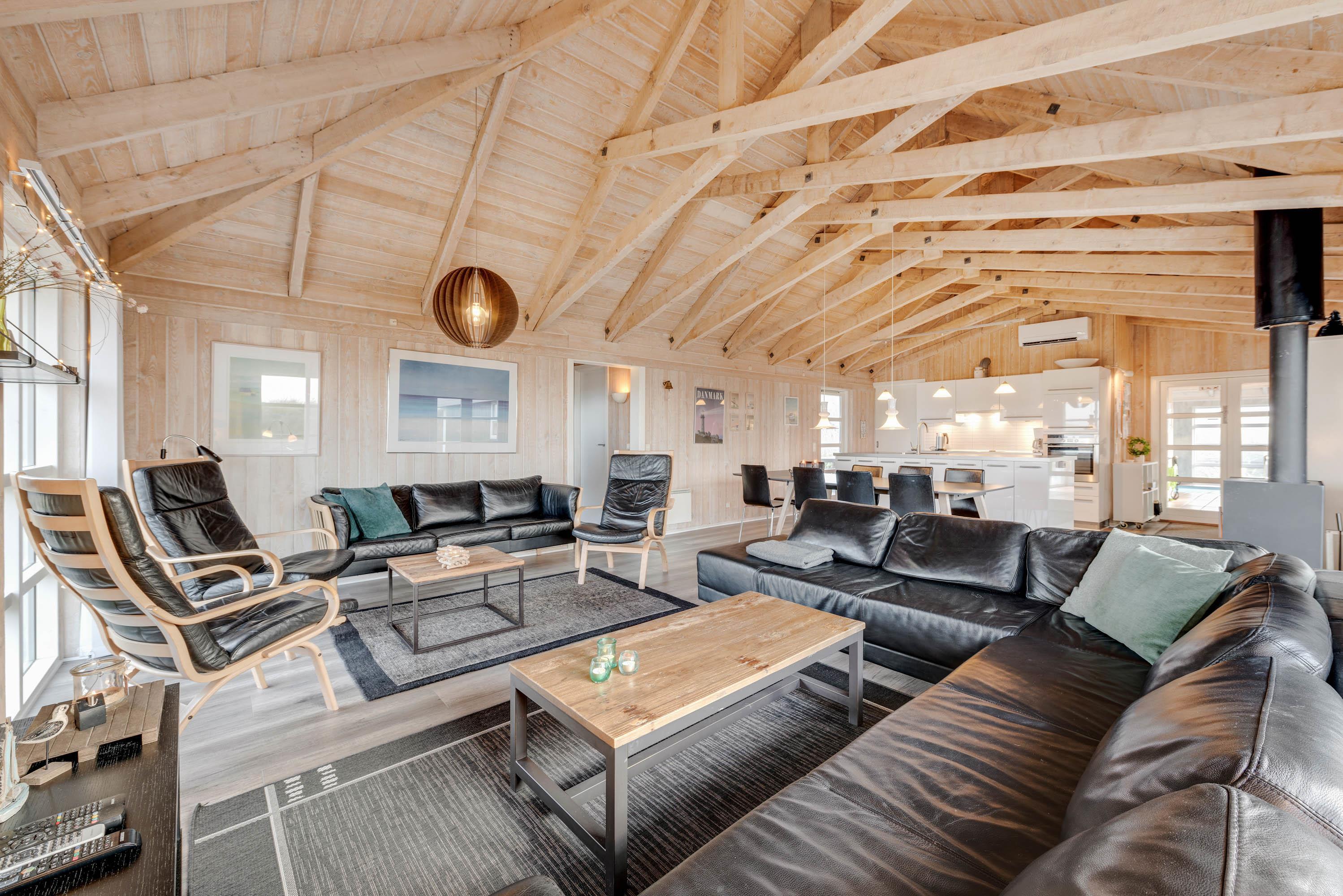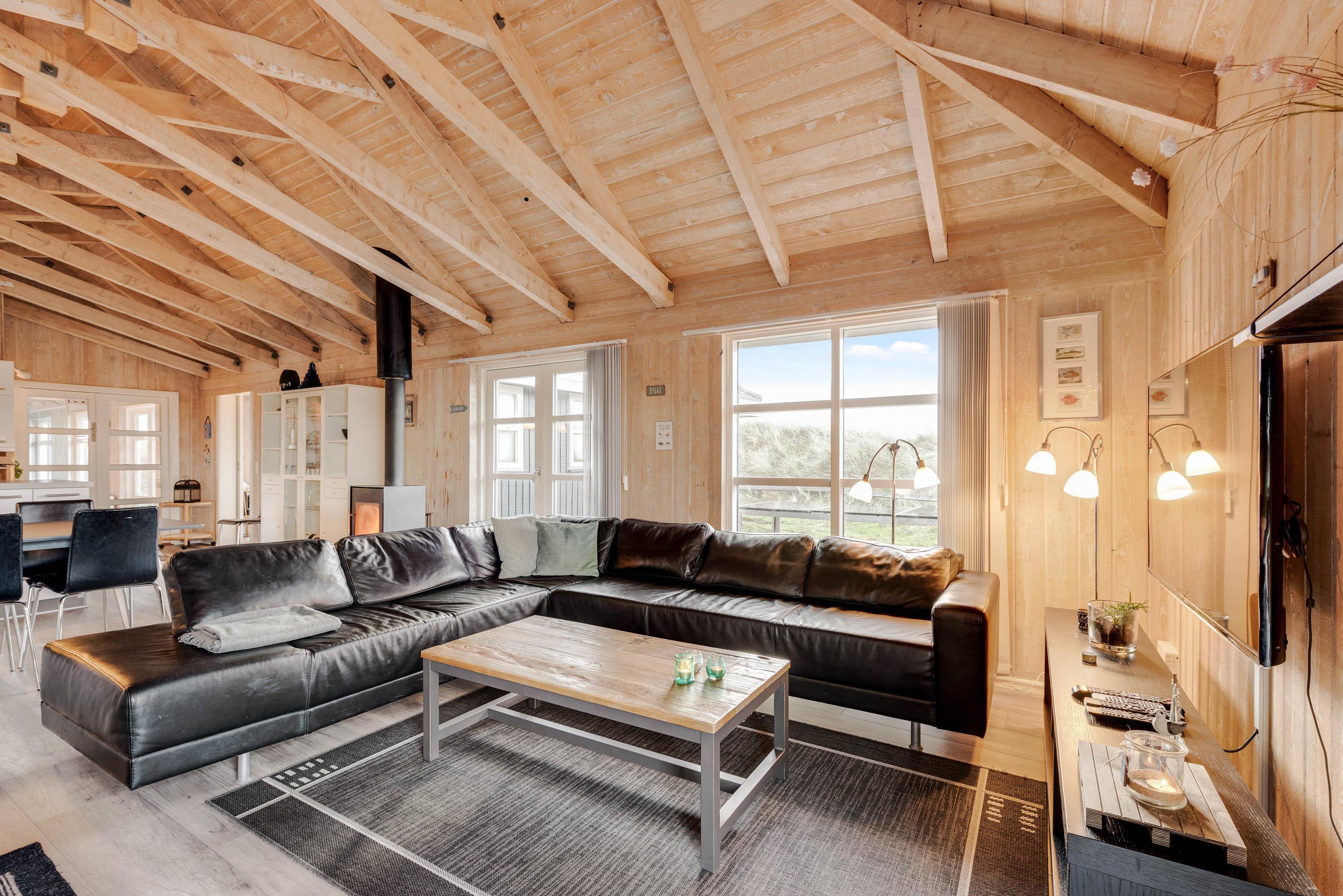 Opholdsrummet emmer af klassisk sommerhusstil med træfacader, synlige bjælker og åbent op i kip. Midt i rummet står brændeovnen, som spreder hygge og varme til hele rummet, mens de store vinduespartier bringer både lyset og naturen ”helt ind i stuen”. Sofagrupperne indbyder til hyggeligt samvær for alle, både med TV og diverse familiespil.