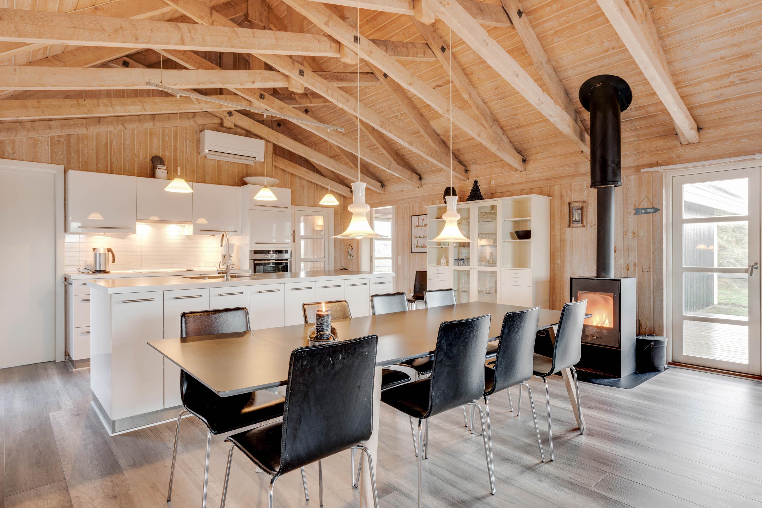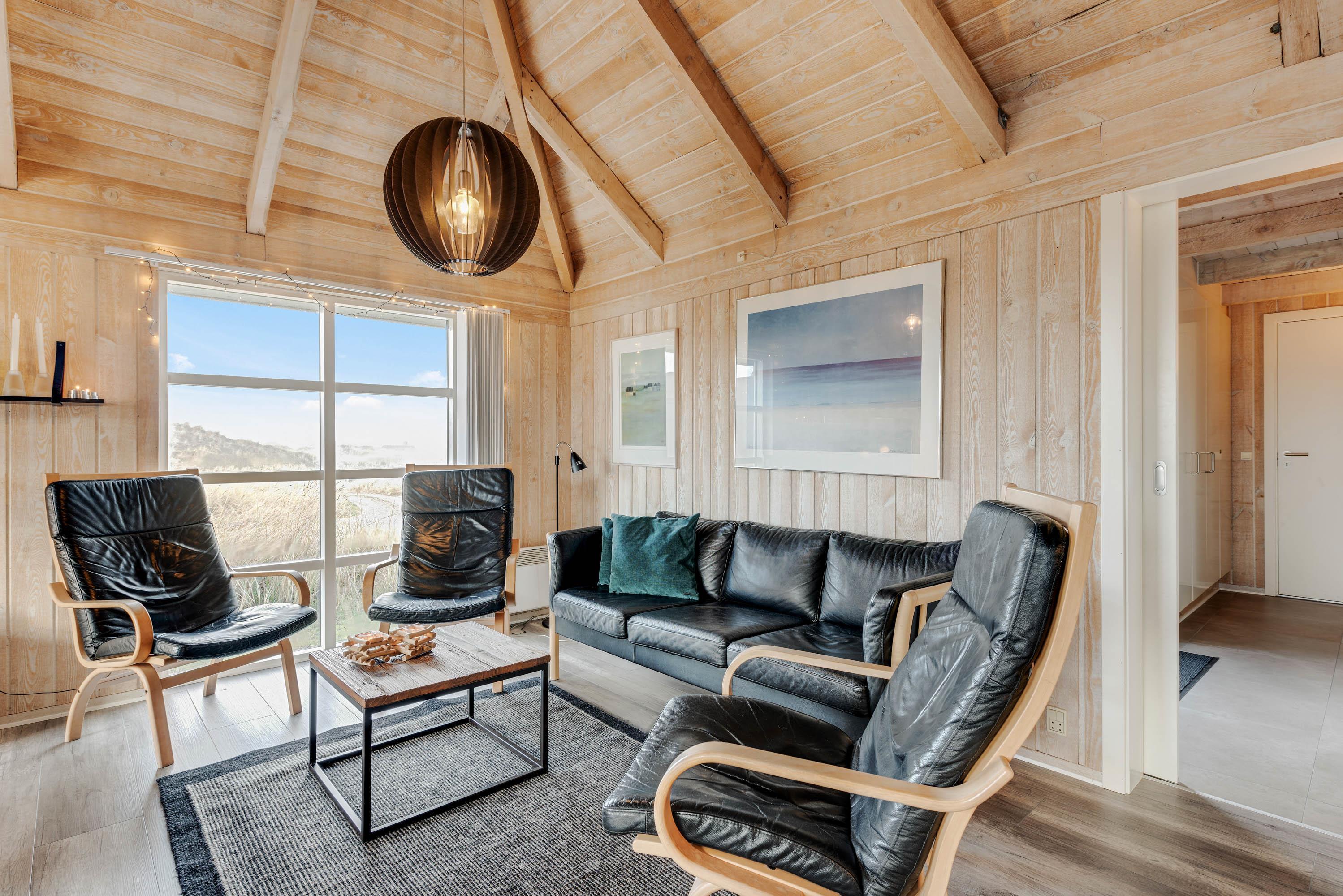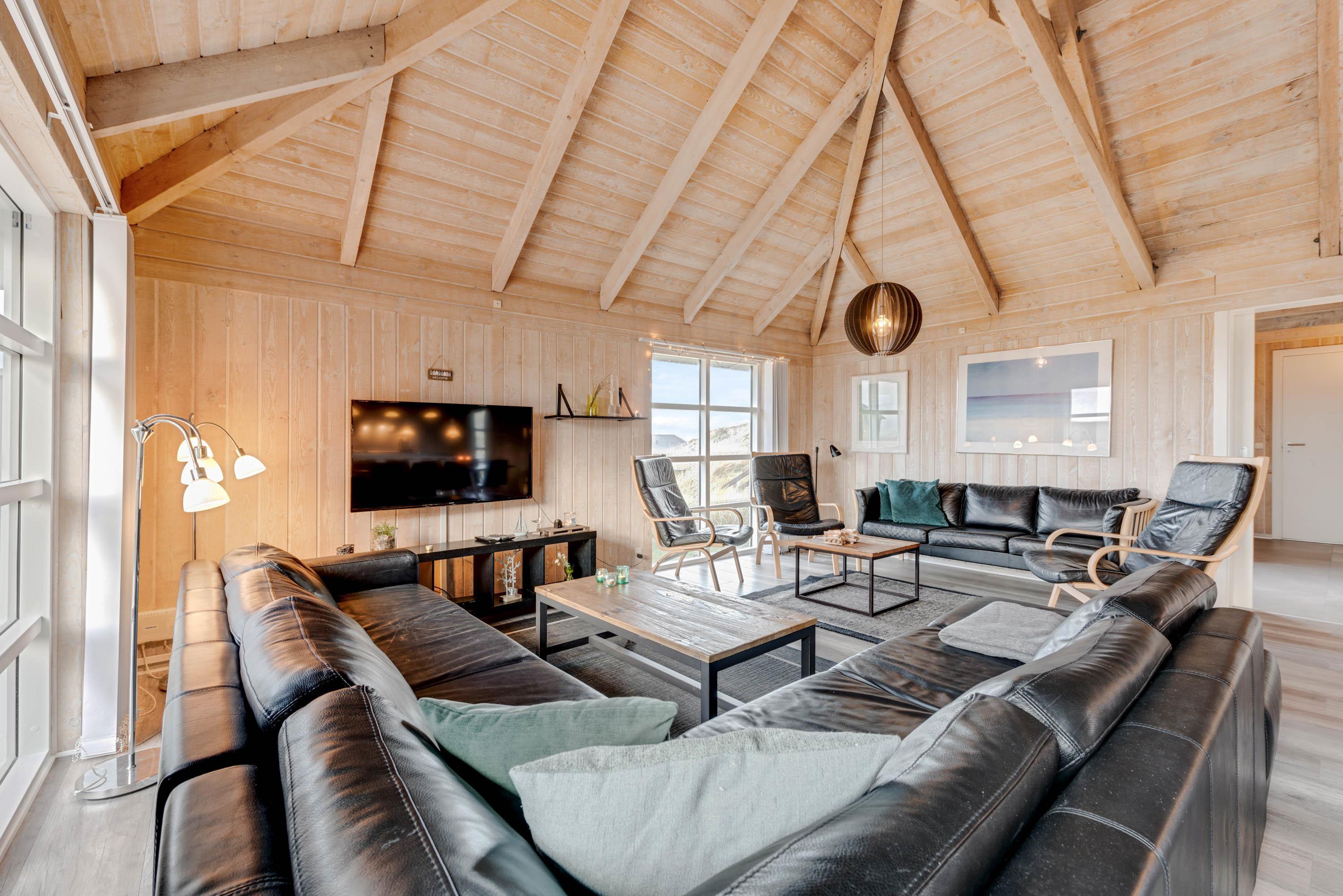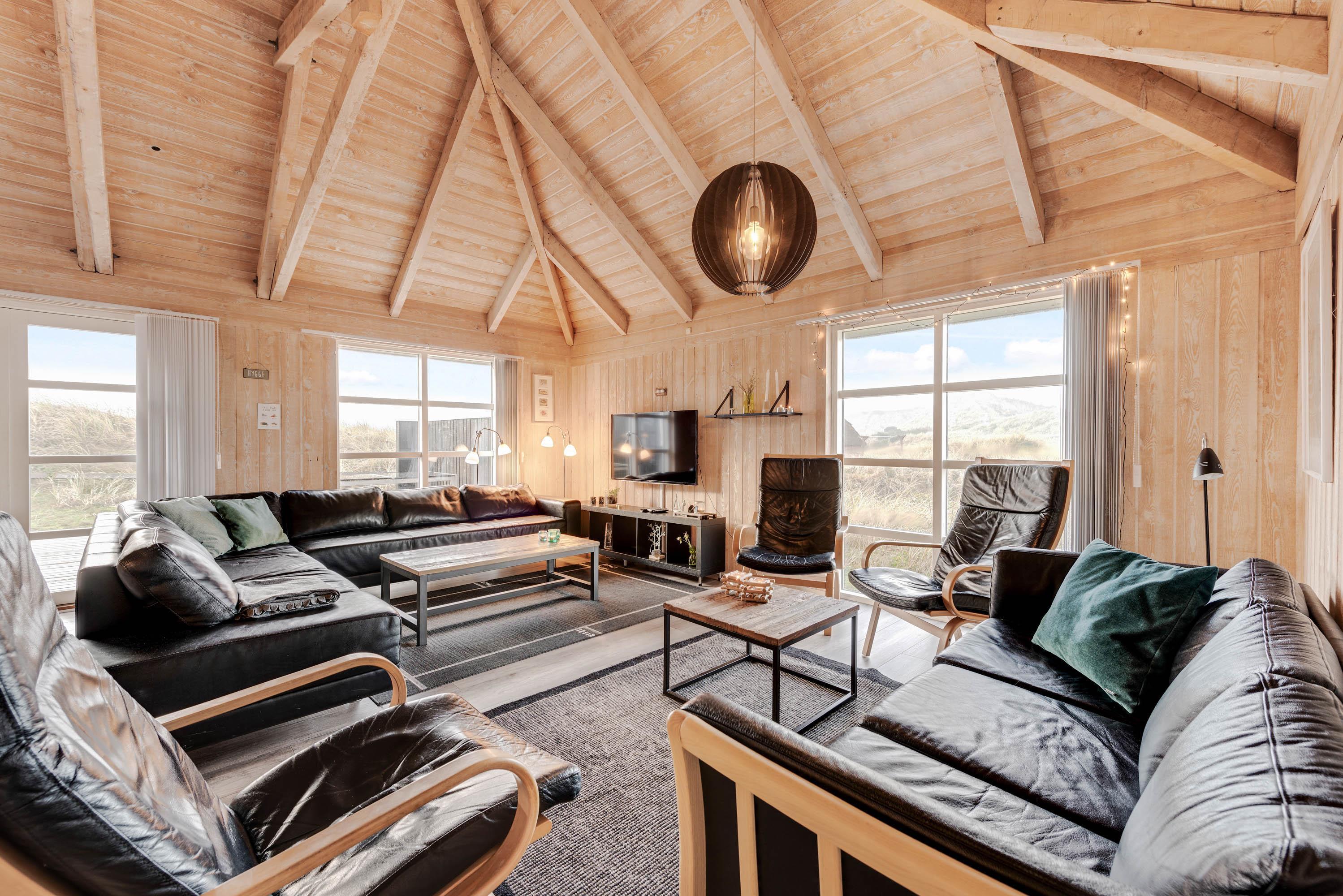 Opholdsrummet emmer af klassisk sommerhusstil med træfacader, synlige bjælker og åbent op i kip. Midt i rummet står brændeovnen, som spreder hygge og varme til hele rummet, mens de store vinduespartier bringer både lyset og naturen ”helt ind i stuen”. Sofagrupperne indbyder til hyggeligt samvær for alle, både med TV og diverse familiespil.